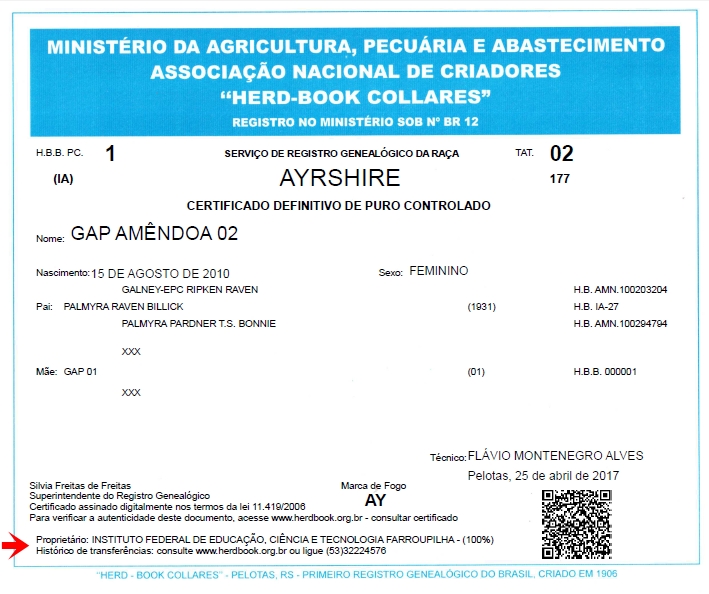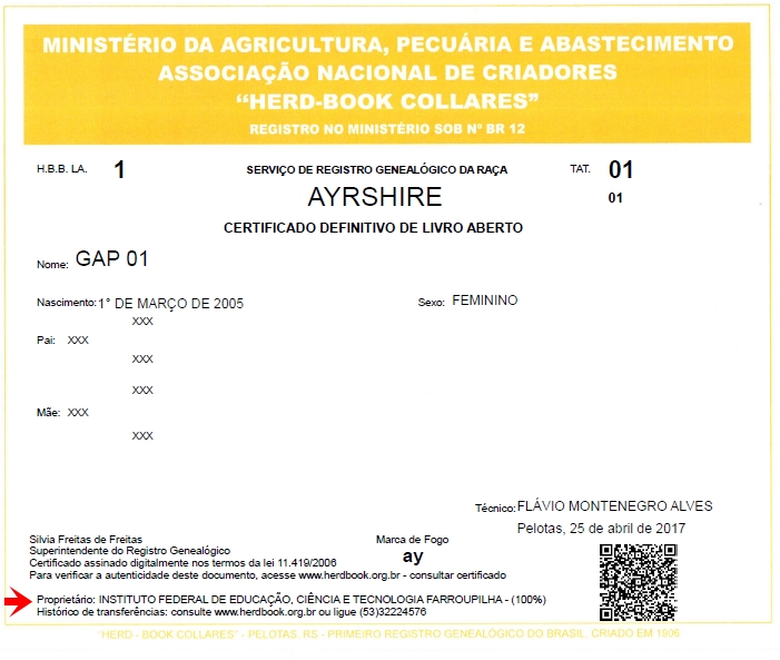 Registros oficiais das matrizes da raça Ayrshire, já com o IFFar-CA como proprietário, emitidos pela ANC Herd Book Collares.
