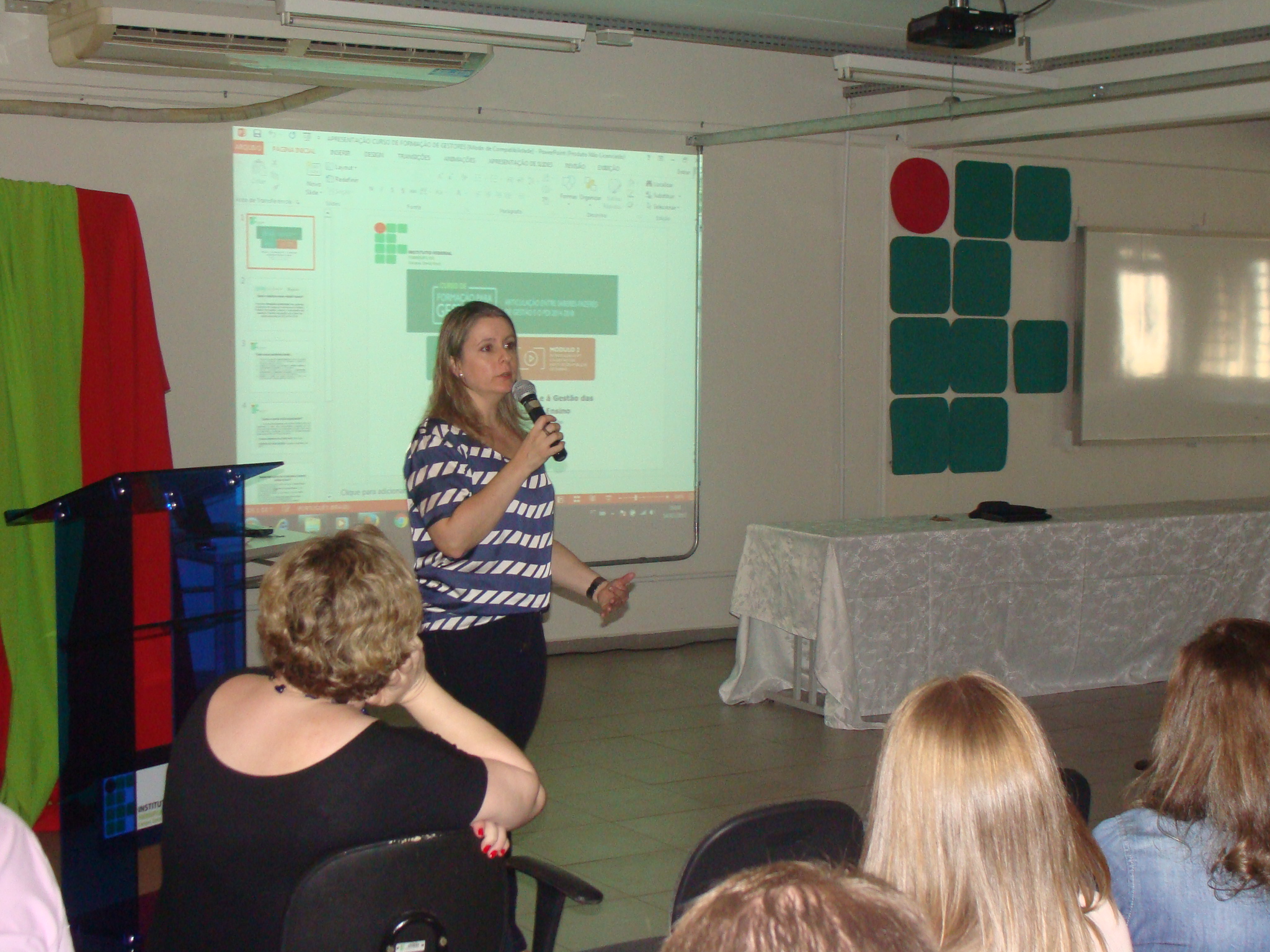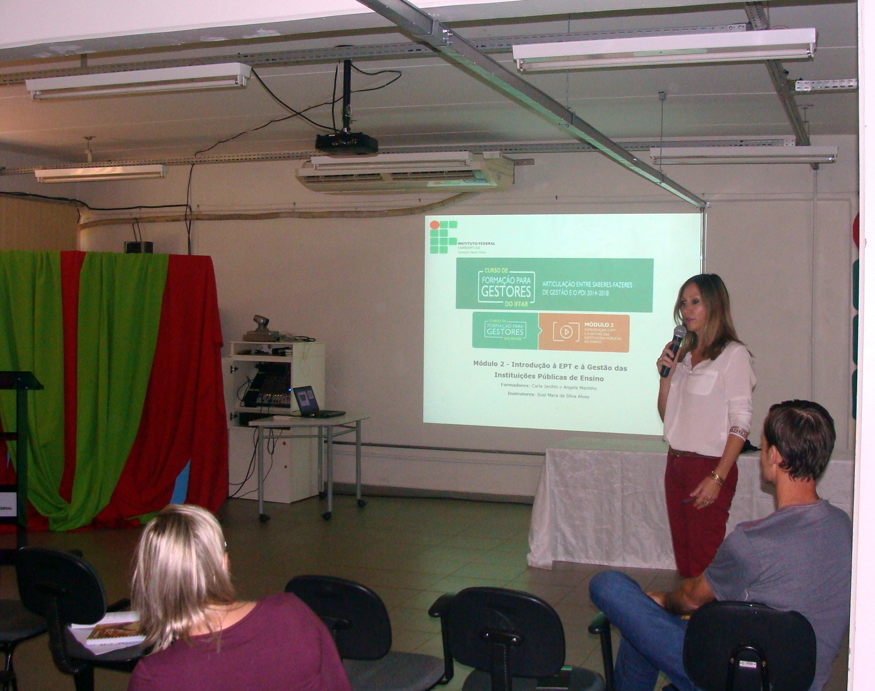 A diretora de Administração, Mirian Kovhautt, falou sobre o Curso de Formação para Gestores do IF Farroupilha - Articulação entre saberes-fazeres de gestão. O curso tem a finalidade de capacitar os novos gestores do IF Farroupilha a desempenharem suas atividades com um conhecimento mais abrangente sobre gestão, sobre setores e processos do IF Farroupilha e sobre o Plano de Desenvolvimento Institucional (PDI2014-2018).