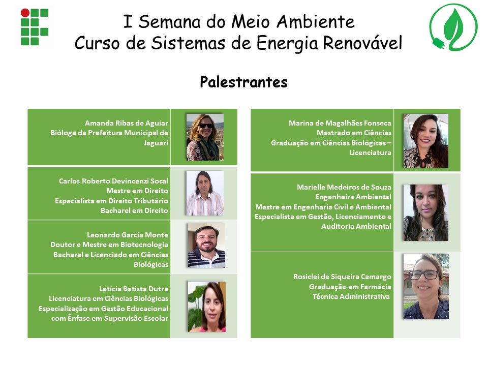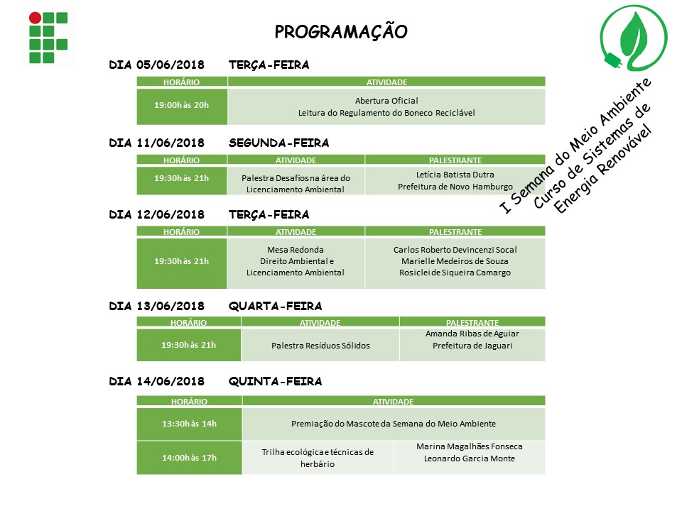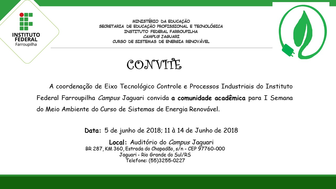 A Semana de Meio Ambiente é um evento promovido pelo Curso de Sistemas de Energia Renovável - IFFar - Campus Jaguari, é aberto ao público interno e contempla pesquisadores, estudantes, docentes e técnicos administrativos das diferentes áreas do conhecimento. Poderão participar da Semana de Meio Ambiente servidores e estudantes do campus Jaguari, na condição de ouvinte, por meio de inscrição no evento. Os ouvintes inscritos poderão participar da confecção do Mascote da Semana do Meio Ambiente, o qual tem objetivo a criação de um boneco da altura de 1,50m com material reciclável. O MESMO DEVERÁ SER APRESENTADO NO DIA 12/06/2018 PARA EXPOSIÇÃO. O melhor boneco será eleito por voto em urna, pelos membros ouvintes e será o Mascote das semanas seguintes.O apresentador deverá estar no local para apresentação do nome do boneco e relato dos materiais utilizados para composição do mesmo. Inscrições com as acadêmicas do 2º ano do Curso de Sistemas de Energia Renovável Cristiane Brizola e Cássia Mazzanti.