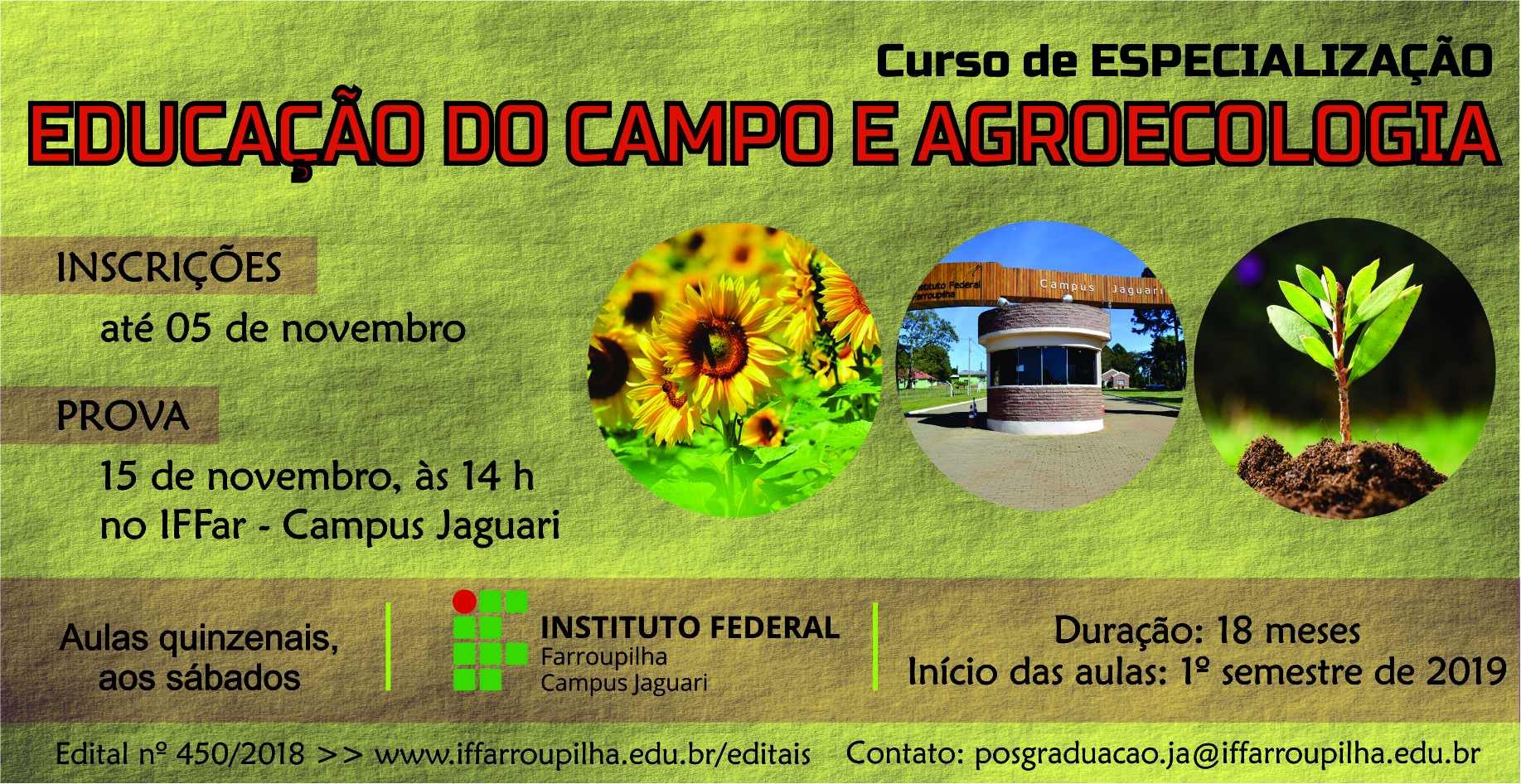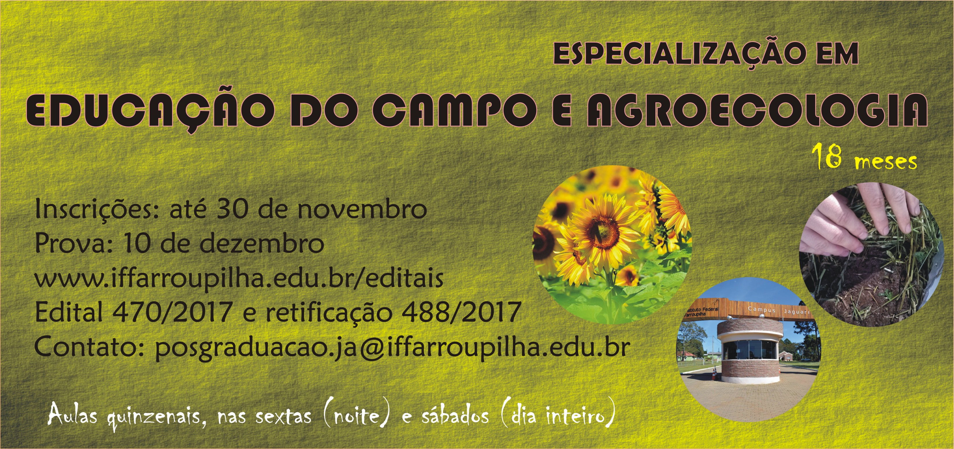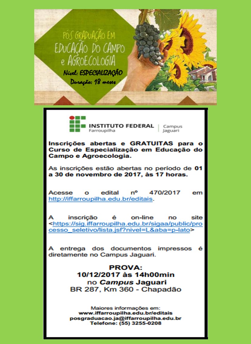 O Curso de Especialização em Educação do Campo e Agroecologia está com inscrições abertas até o dia 05 de novembro de 2018.
