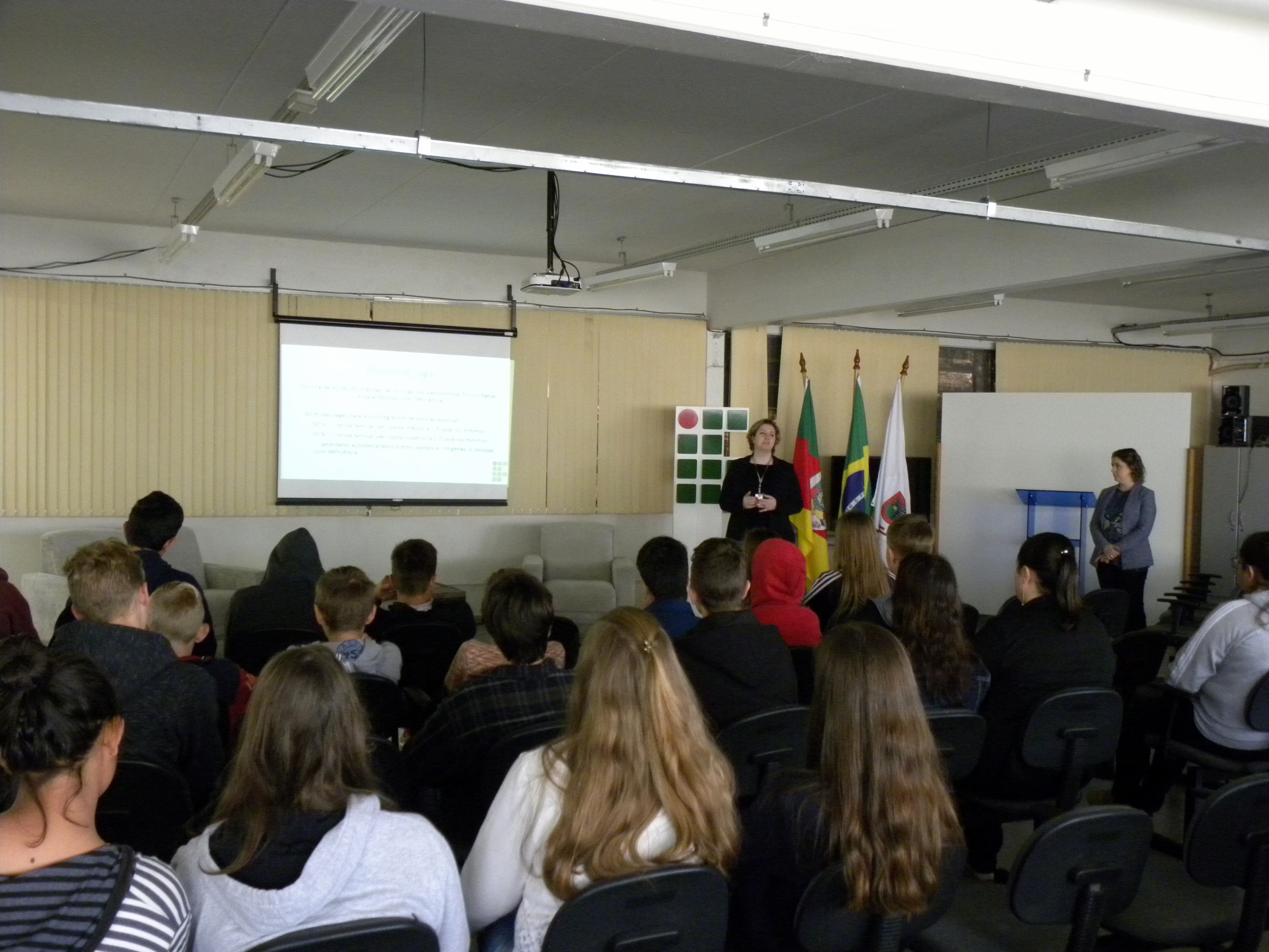 A diretora-geral, Renata Rotta, recepcionou os visitantes no auditório juntamente com a diretora de Planejamento e Desenvolvimento Institucional, Melissa Walter. Ambas explicaram as formas de ingresso para os cursos técnicos e superiores, os benefícios promovidos pela Assistência Estudantil e explicaram aos futuros alunos como a instituição atua em ensino, pesquisa e extensão. Os alunos dos terceiros anos dos cursos técnicos integrados, o grupo de danças Sentinela Farroupilha e os bolsistas dos projetos de ensino e pesquisa foram os guias dos visitantes. Os interessados em ingressar num dos cursos técnicos integrados em 2019 têm até o dia 10 de setembro para realizar as inscrições.