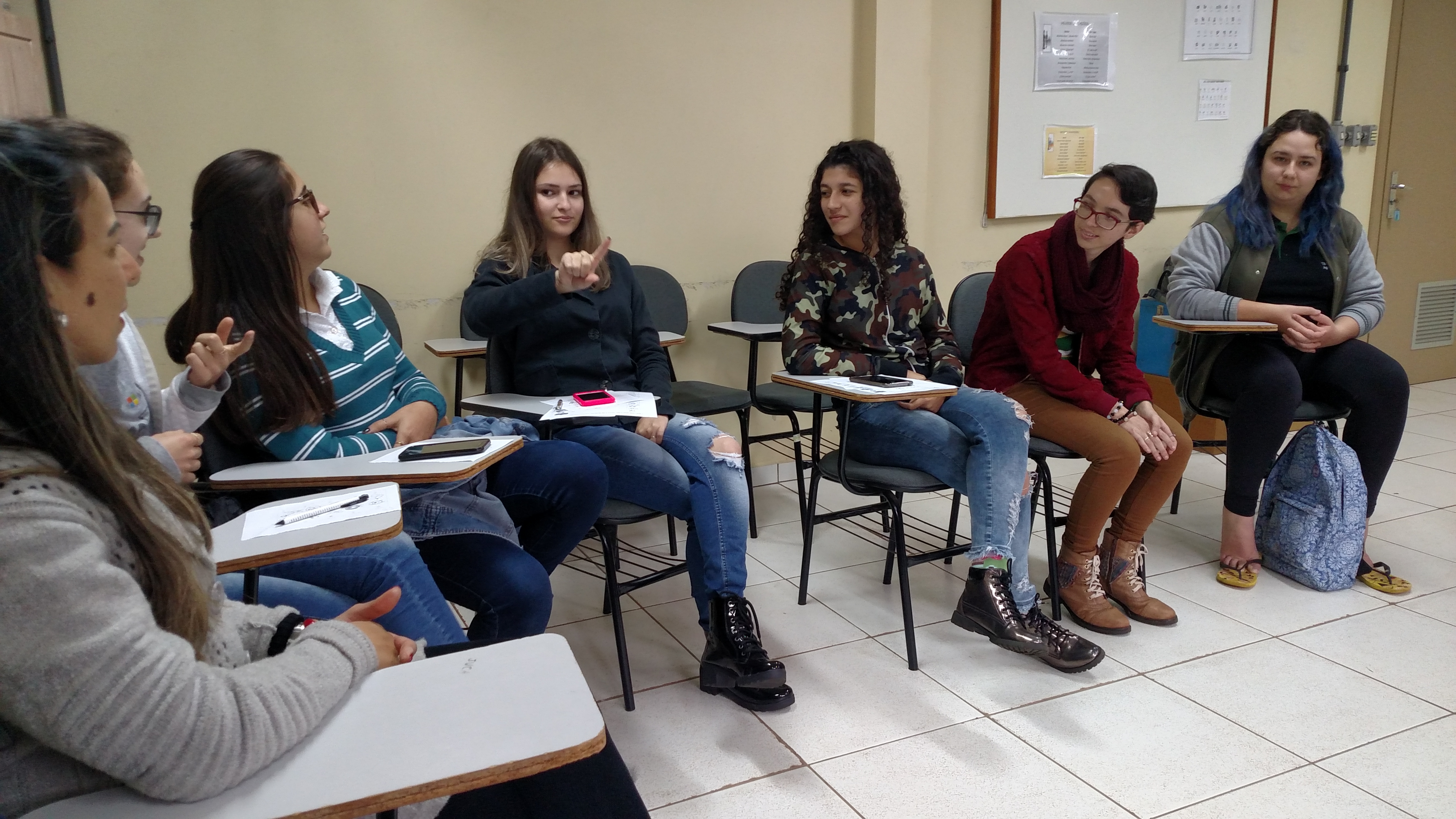 A professora Elis, explicitou o porquê da existência do Nugedis no IFFar e, na sequência, explicou sobre o conceito de assédio e seus tipos. O assunto foi trabalhado de forma contextualizada, com dados do IBGE da população economicamente ativa com o recorte de gênero e com situações do cotidiano incluindo os conteúdos que são publicados nas redes sociais e que, em sua maioria, disseminam o ódio e o preconceito associados a gênero, colocando a mulher em posição de inferioridade.