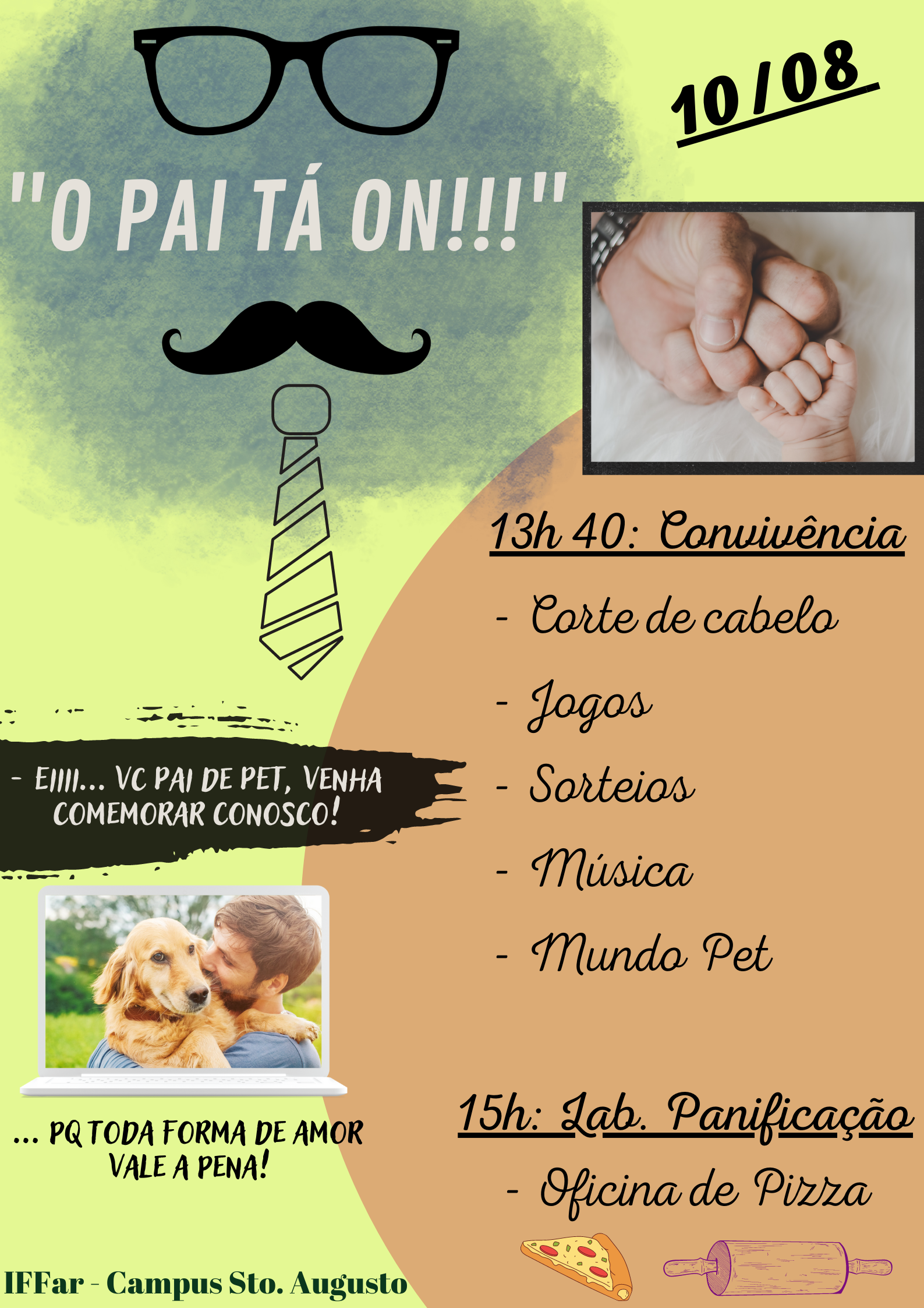 Na tarde desta quarta-feira, 10 de agosto, foi realizado no IFFar - Campus Santo Augusto o evento em comemoração ao Dia dos Pais, “O Pai ta on”. A programação, organizada pela Diretora de Desenvolvimento Institucional, Lizandra Forgiarini Lucca, teve início às 13h40 na sala de convivência ao lado do refeitório, com a participação da empresa Empório 08, que trouxe produtos para degustação e para sorteio, os barbeiros Paranhos Barber Shop e Bravu's Barber Shop, realizaram corte de cabelo e barba dos papais presentes. Para os papais de pets a empresa Puro Trato trouxe alguns tipos de rações para serem levadas como brinde.