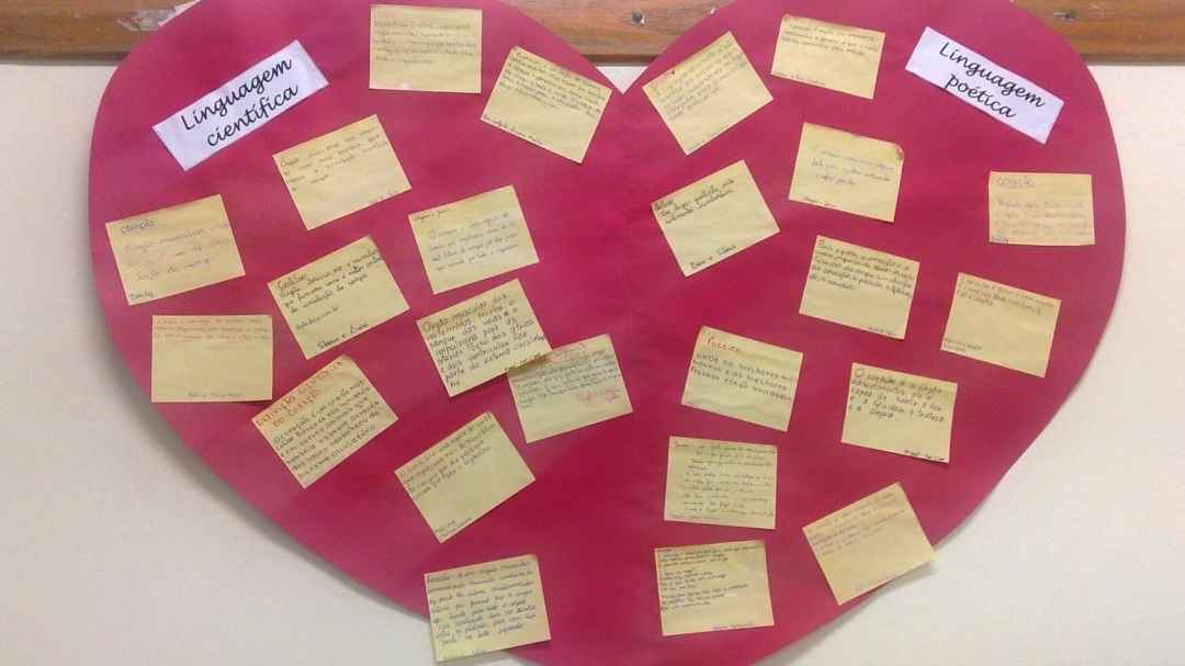 Inicialmente os professores introduziram o conceito de gênero lírico através de aulas teóricas, onde foram vistas a teoria acerta do texto poético. Na sequência foram retomados os conceitos de sentido conotativo e denotativo, através dos significados da palavra CORAÇÃO, que culminou na construção de um cartaz em cada turma.