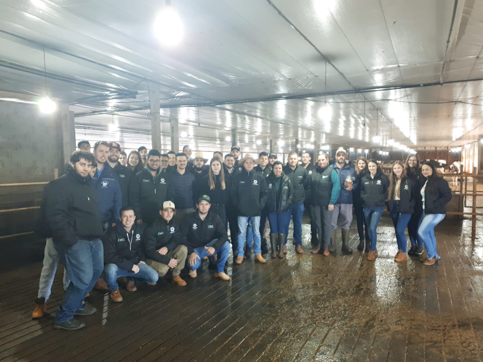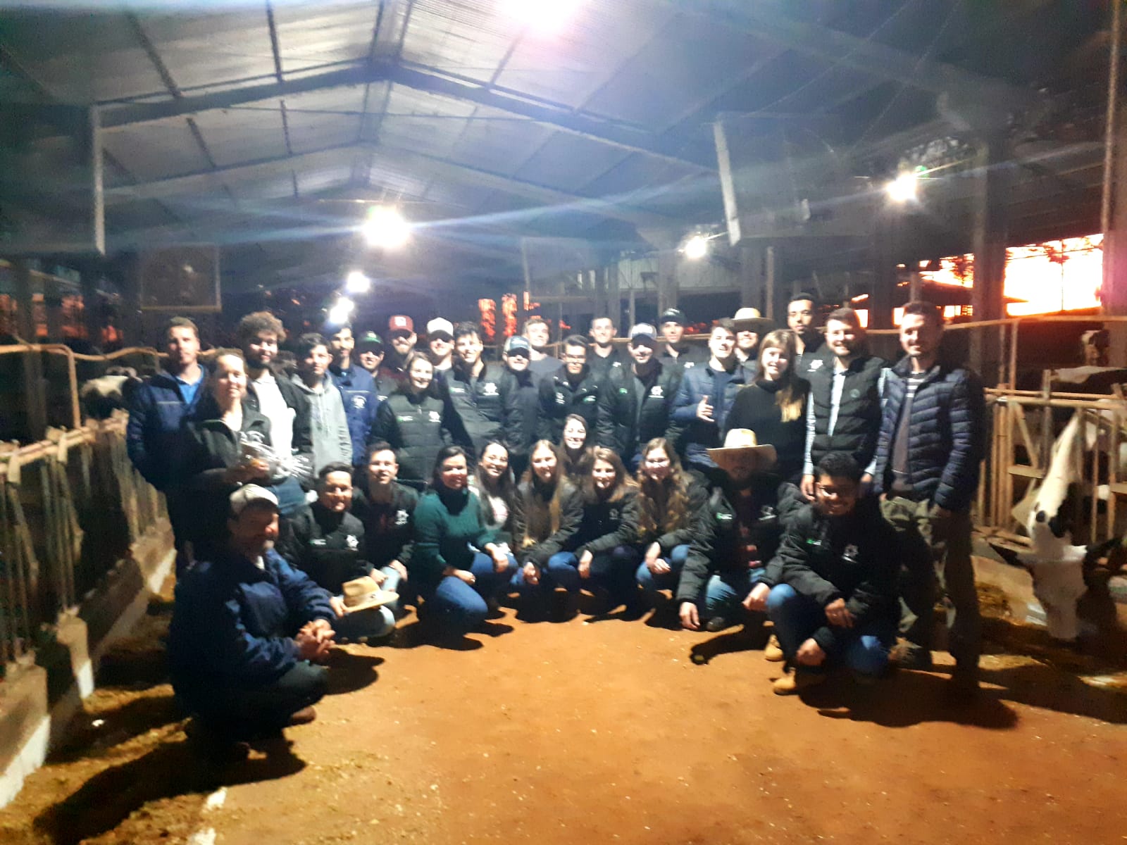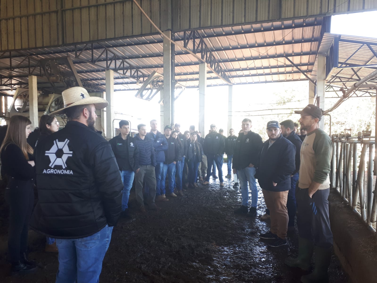 Na sequência, o grupo conheceu duas propriedades no município de São Martinho-RS, sendo a primeira de André Ritter e família, que possui confinamento em Compost barn (sistema de criação onde as vacas possuem uma área livre e recebem alimentação no cocho, mas a cama é coletiva, composta de material orgânico, que se mantém seca pelo processo de compostagem) e a segunda a propriedade de Fenos e Pré-secados Schneider. Por último os estudantes visitaram a propriedade da Aldair Welter e família, no município de Alegria-RS, que possui confinamento em Compost barn e ordenha robotizada.