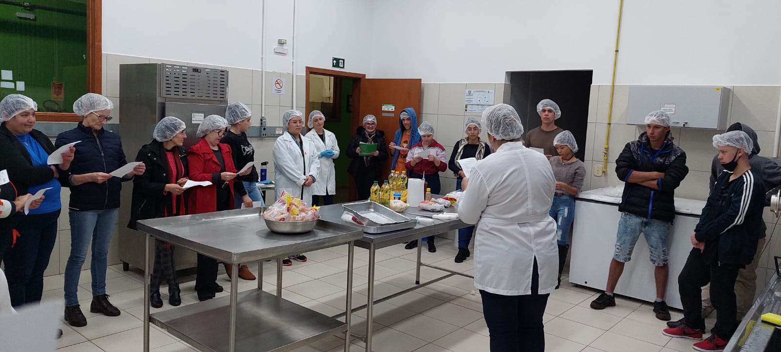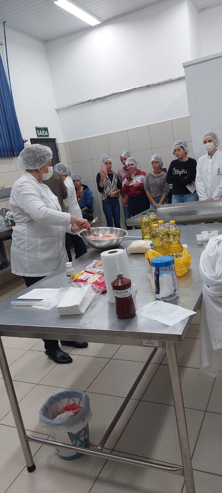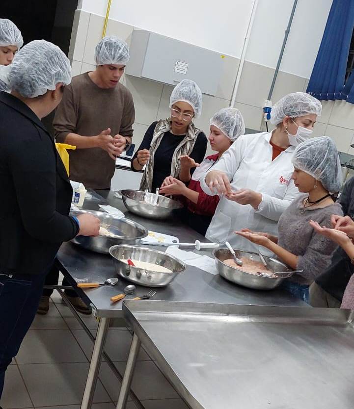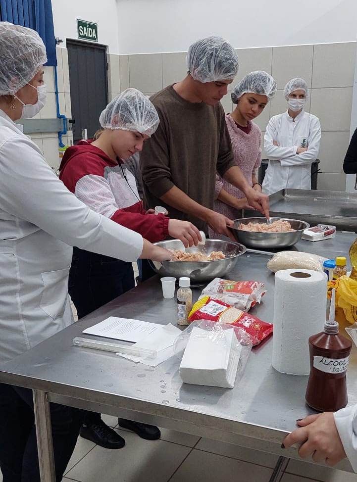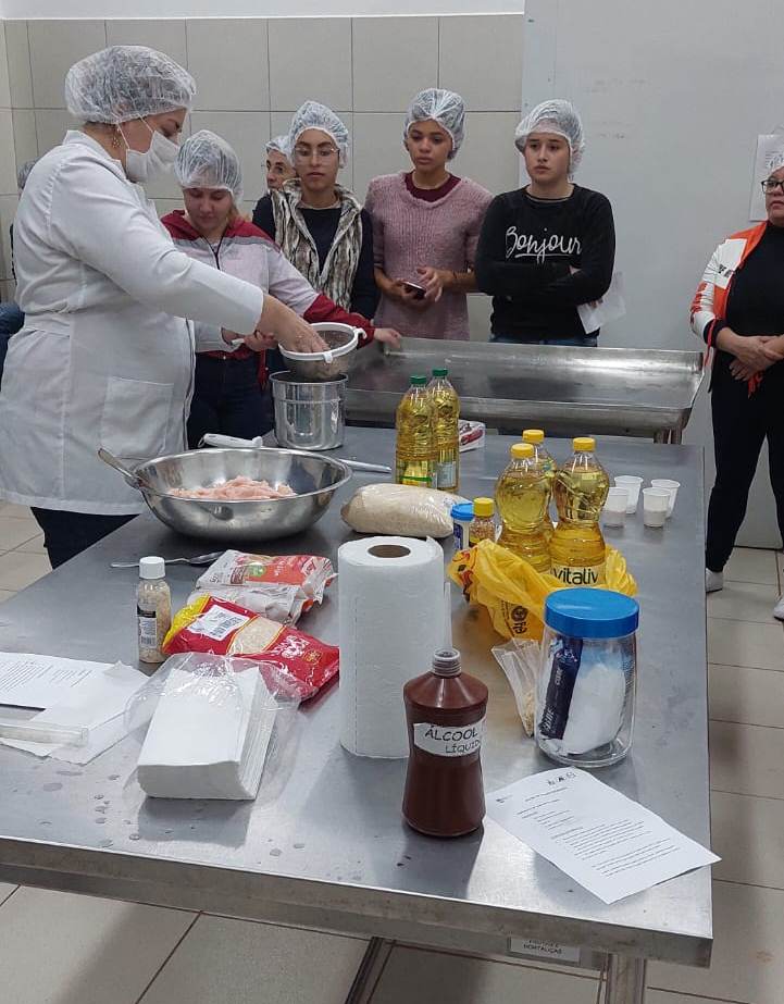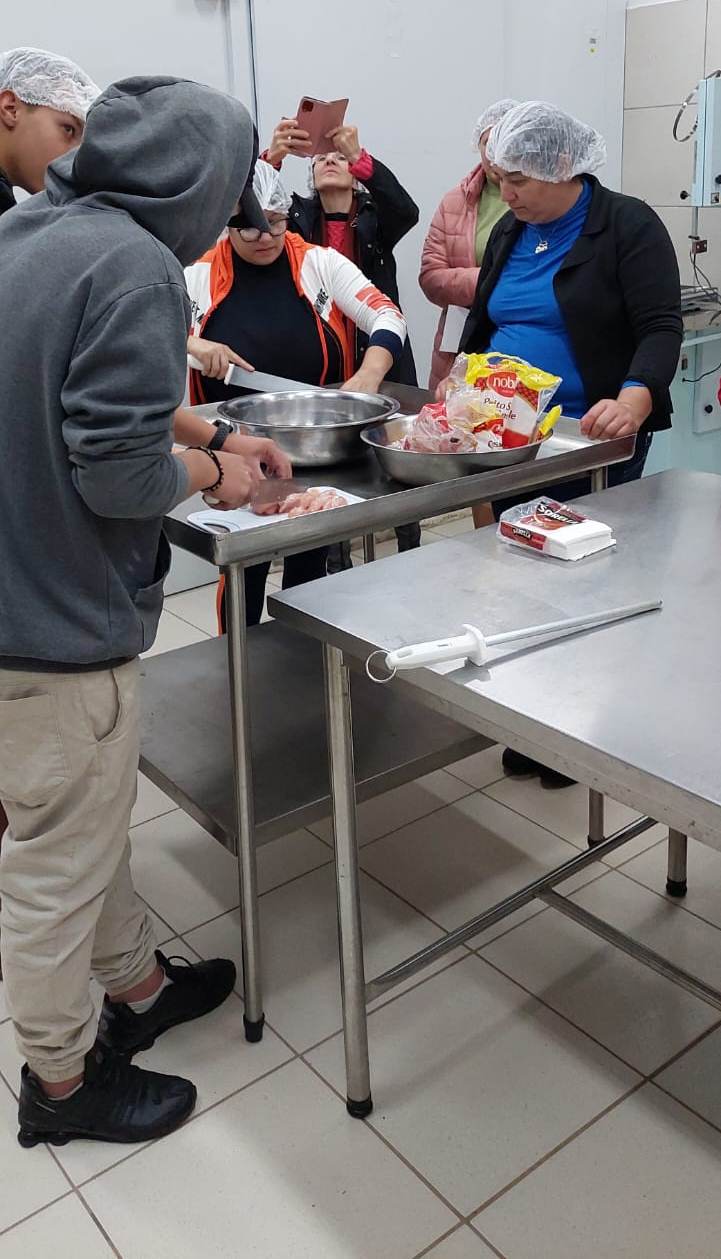 Os visitantes foram recebidos no auditório da instituição pelos coordenadores do projeto, professor Aelson Brum e professora Karinne Wendy Menezes, os quais explicaram um pouco sobre a instituição e sobre o projeto. Na sequência o grupo participou de uma oficina sobre “Produção de Nuggets”, ministrada pela professora Melissa dos Santos Oliveira, realizada em parceria com o Curso Técnico em Agroindústria integrado ao ensino médio na modalidade Proeja. Durante a oficina foi destacada a importância da higiene durante o preparo de qualquer alimento, principalmente das mãos.