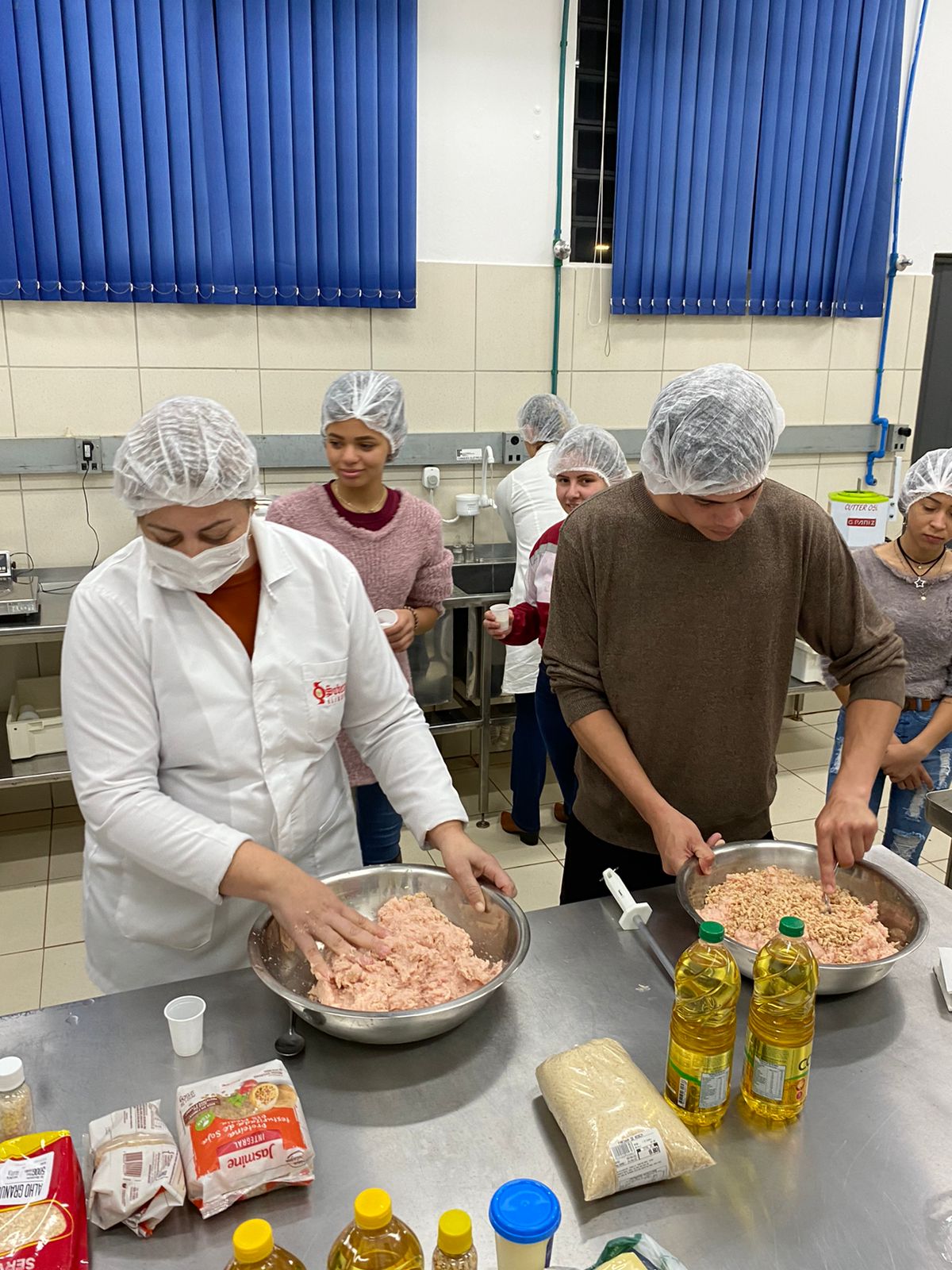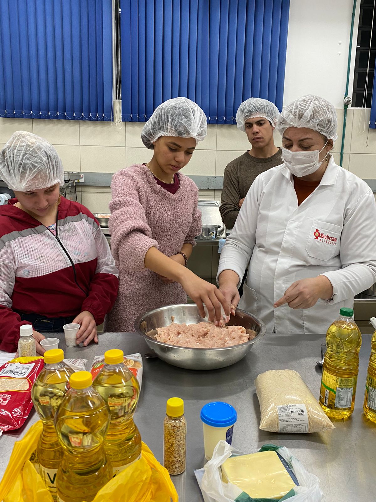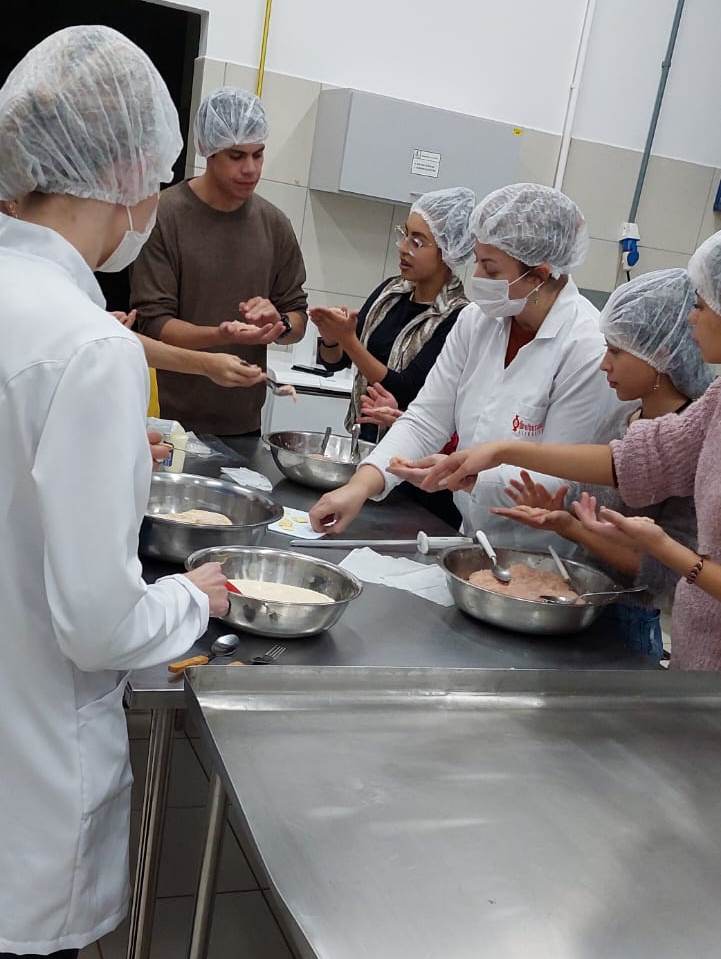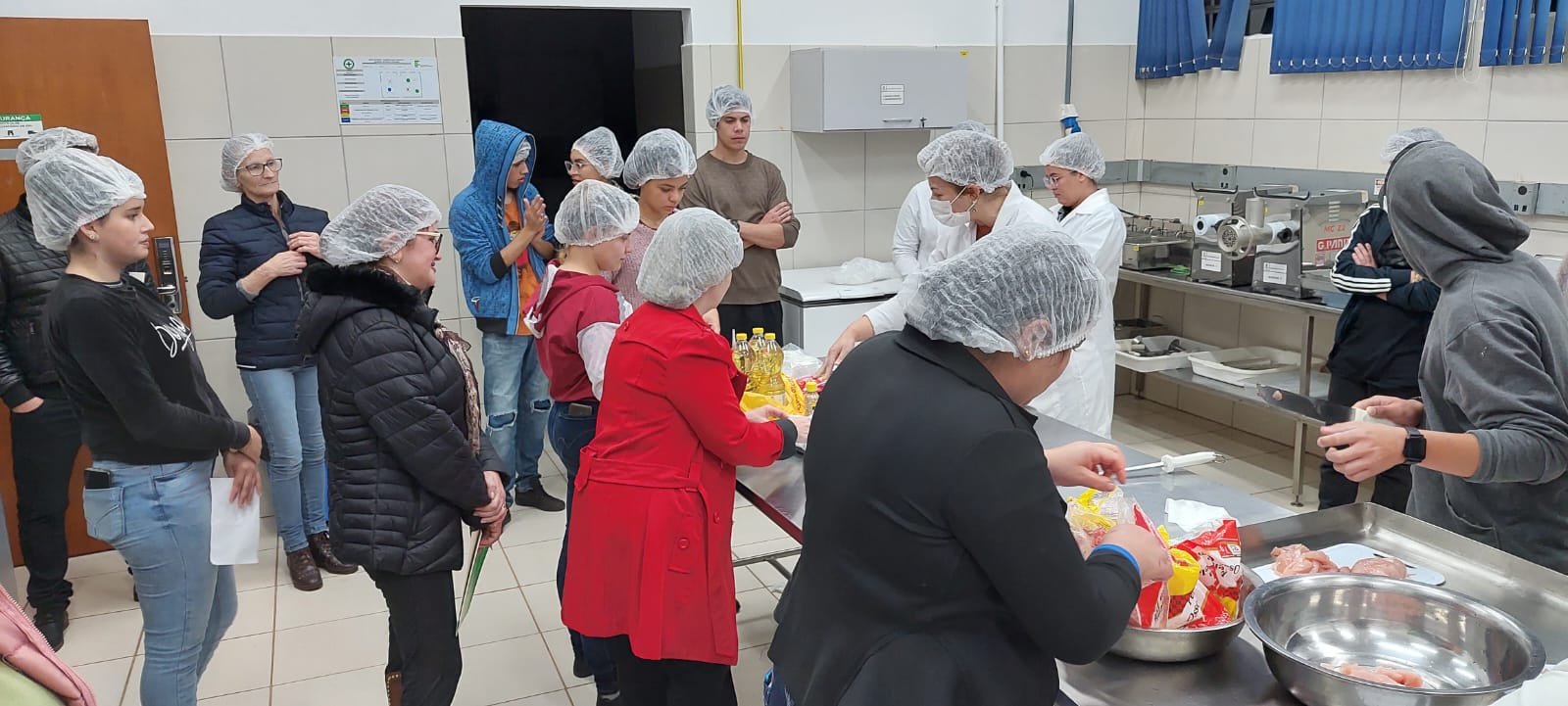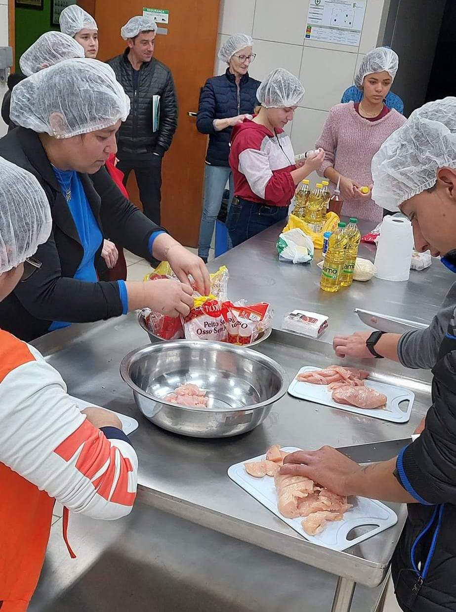 Os visitantes foram recebidos no auditório da instituição pelos coordenadores do projeto, professor Aelson Brum e professora Karinne Wendy Menezes, os quais explicaram um pouco sobre a instituição e sobre o projeto. Na sequência o grupo participou de uma oficina sobre “Produção de Nuggets”, ministrada pela professora Melissa dos Santos Oliveira, realizada em parceria com o Curso Técnico em Agroindústria integrado ao ensino médio na modalidade Proeja. Durante a oficina foi destacada a importância da higiene durante o preparo de qualquer alimento, principalmente das mãos.