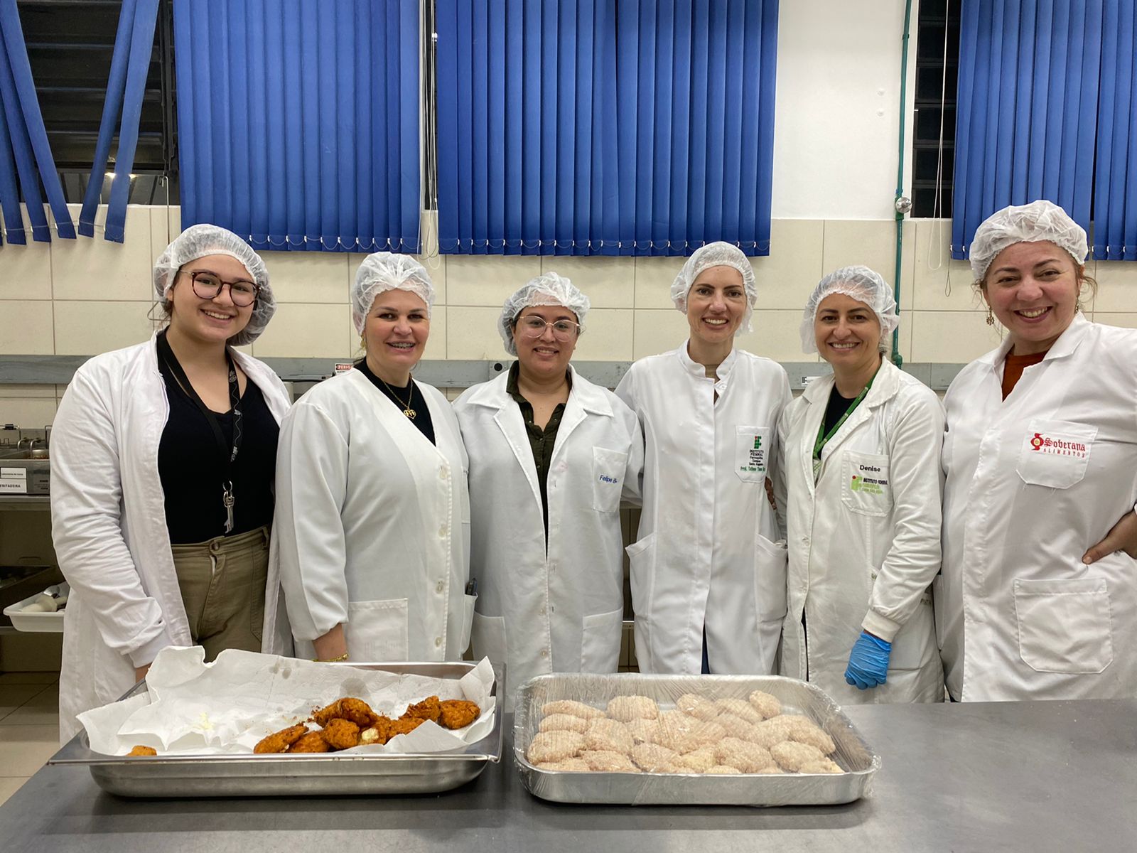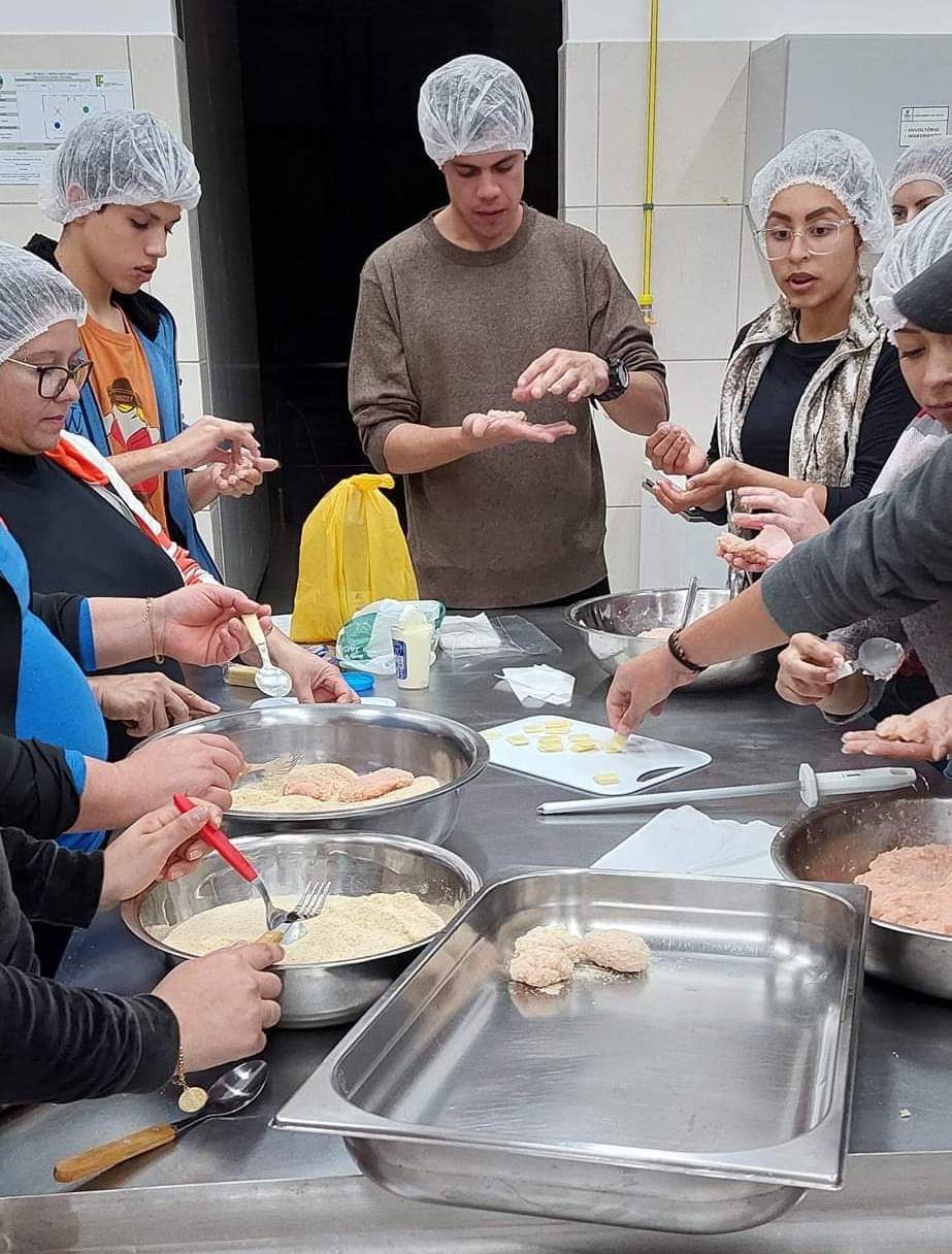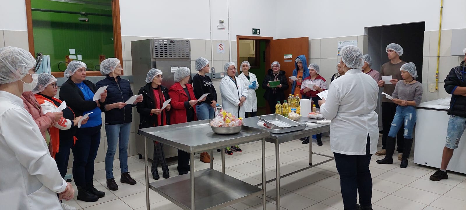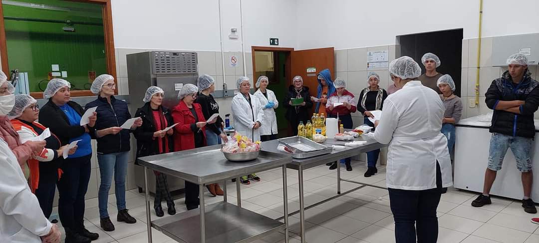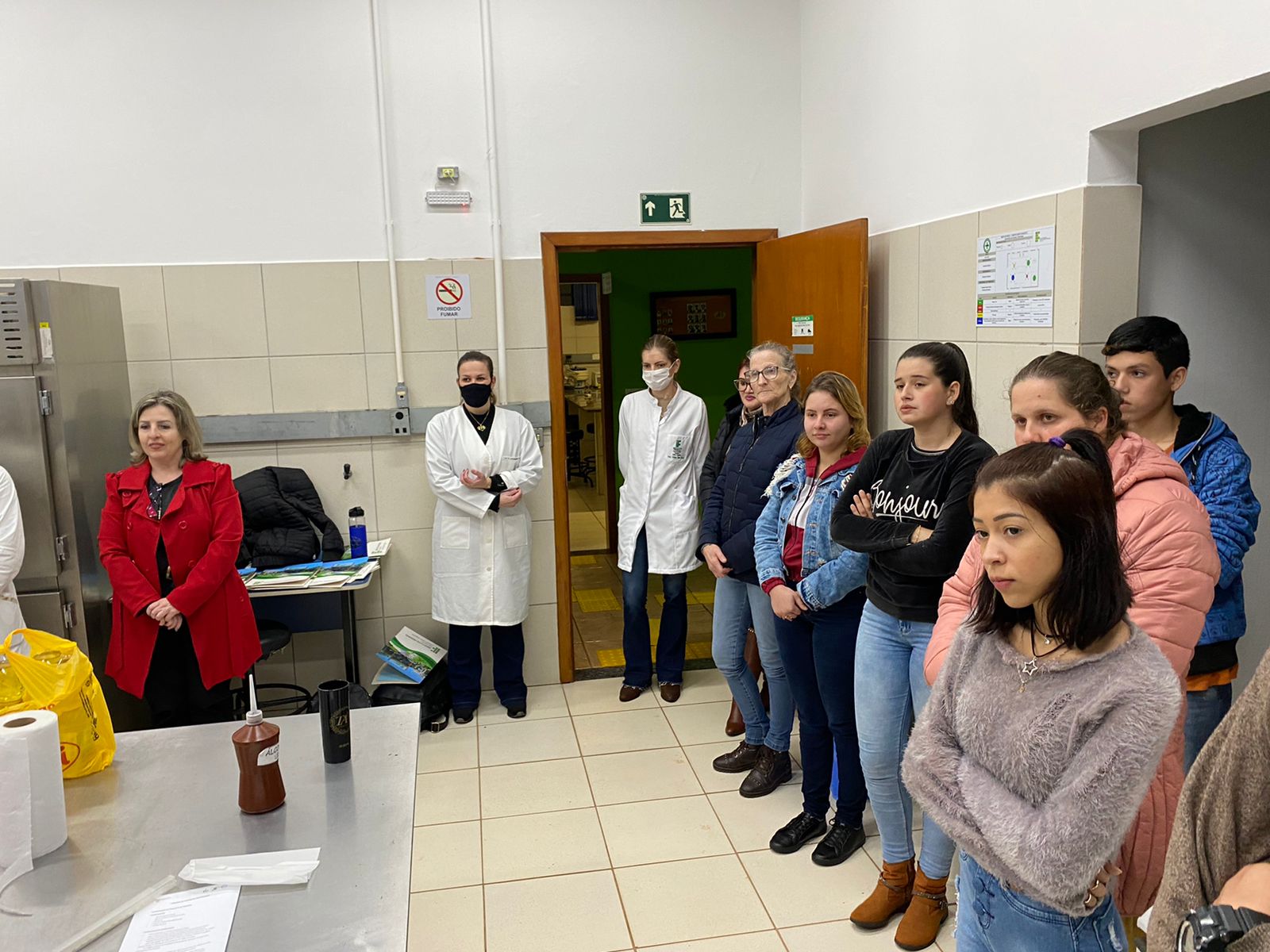 Os visitantes foram recebidos no auditório da instituição pelos coordenadores do projeto, professor Aelson Brum e professora Karinne Wendy Menezes, os quais explicaram um pouco sobre a instituição e sobre o projeto. Na sequência o grupo participou de uma oficina sobre “Produção de Nuggets”, ministrada pela professora Melissa dos Santos Oliveira, realizada em parceria com o Curso Técnico em Agroindústria integrado ao ensino médio na modalidade Proeja. Durante a oficina foi destacada a importância da higiene durante o preparo de qualquer alimento, principalmente das mãos.