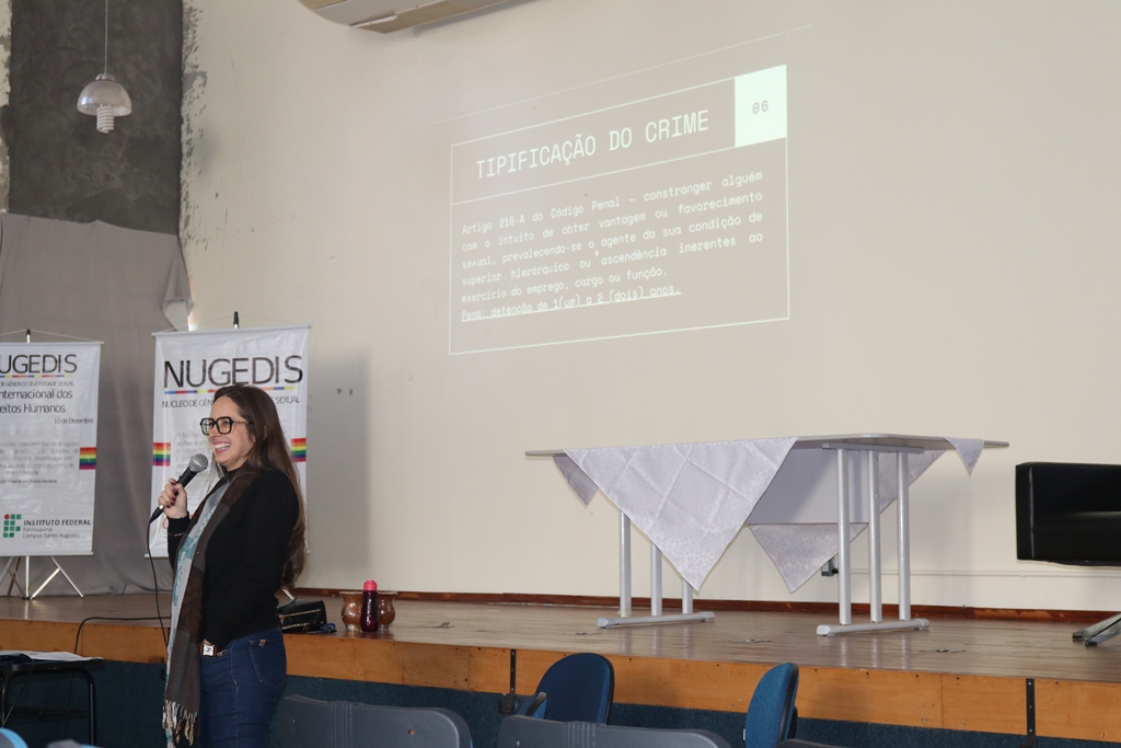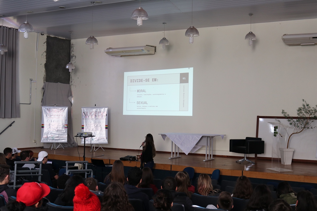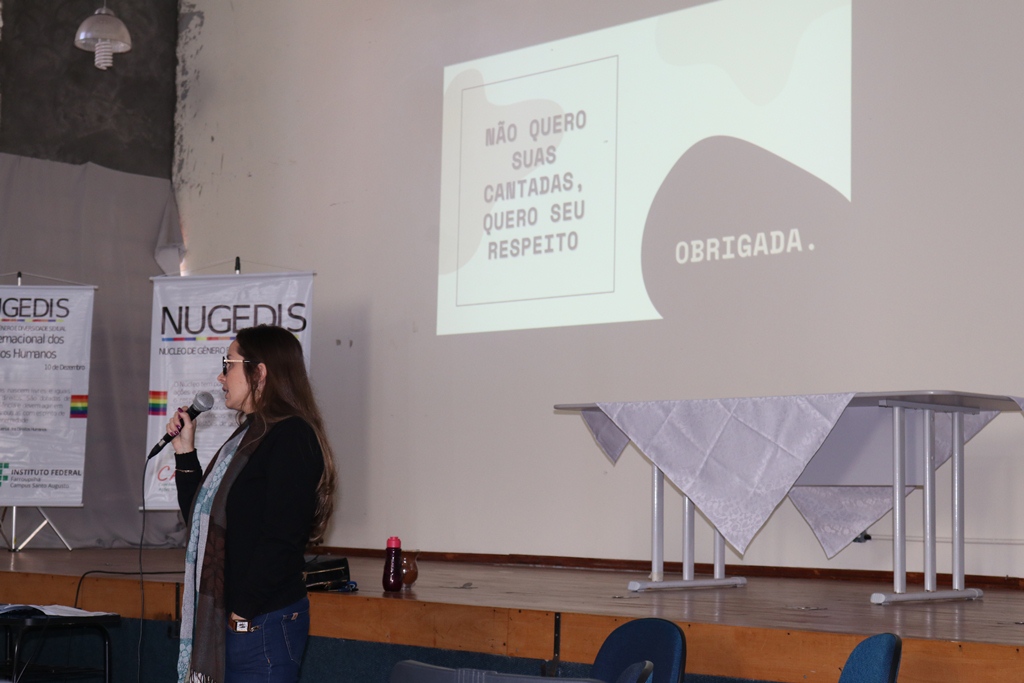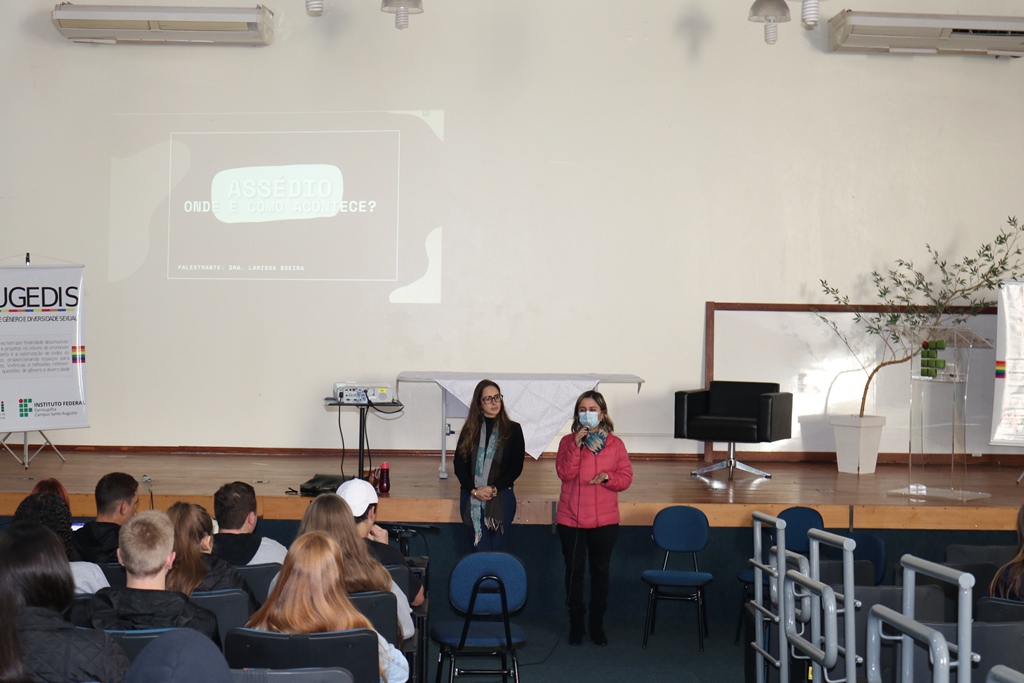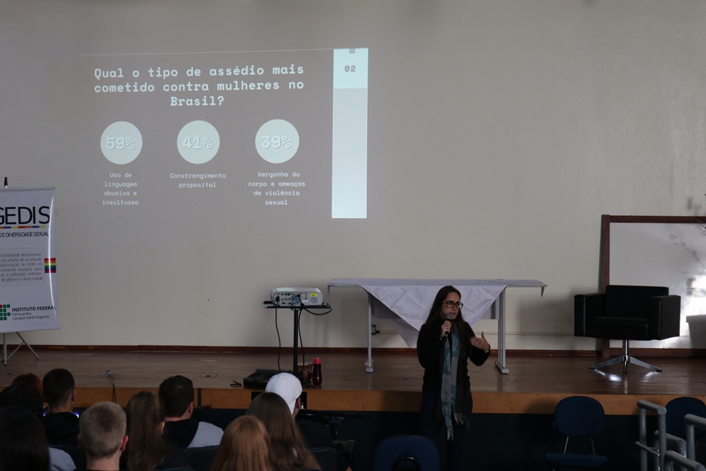 O Núcleo de Gênero e Diversidade Sexual do IFFar – Campus Santo Augusto promoveu na manhã de quarta-feira, 08 de junho, uma palestra com o tema “Assédio? Onde e como acontece”, ministrada pela advogada Larissa Boeira, voltada aos estudantes dos cursos técnicos integrados ao ensino médio. A atividade foi divida em dois momentos, nos dias 08 e 15 de junho, de forma que todos os estudantes dos cursos diurnos pudessem participar.