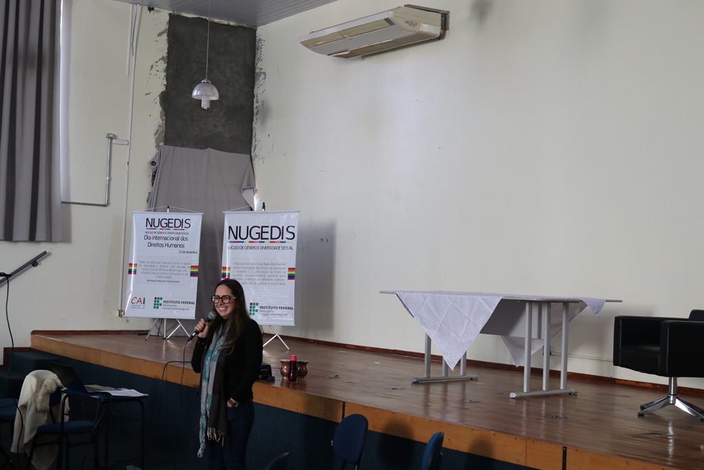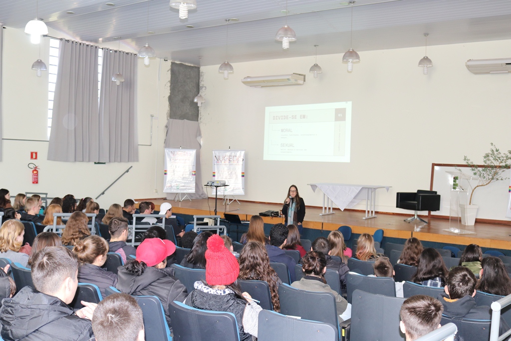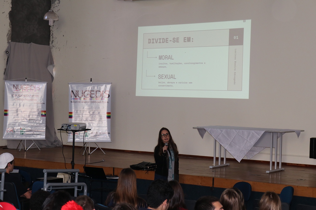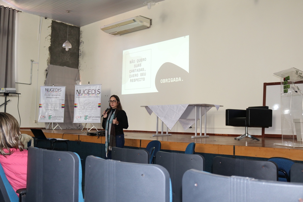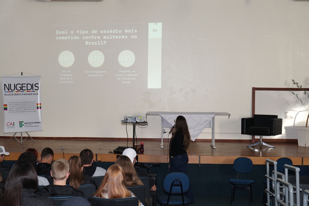 O Núcleo de Gênero e Diversidade Sexual do IFFar – Campus Santo Augusto promoveu na manhã de quarta-feira, 08 de junho, uma palestra com o tema “Assédio? Onde e como acontece”, ministrada pela advogada Larissa Boeira, voltada aos estudantes dos cursos técnicos integrados ao ensino médio. A atividade foi divida em dois momentos, nos dias 08 e 15 de junho, de forma que todos os estudantes dos cursos diurnos pudessem participar.