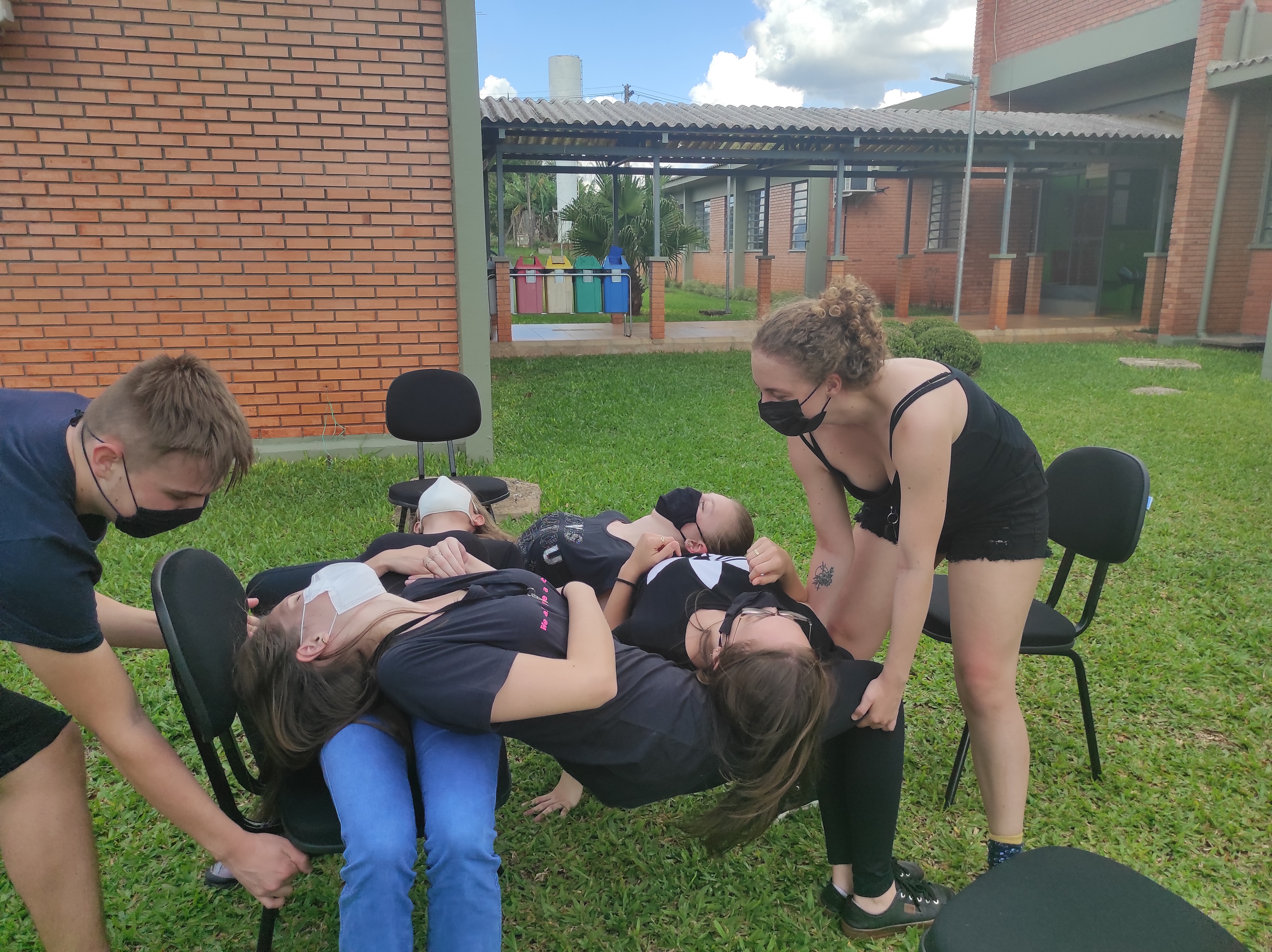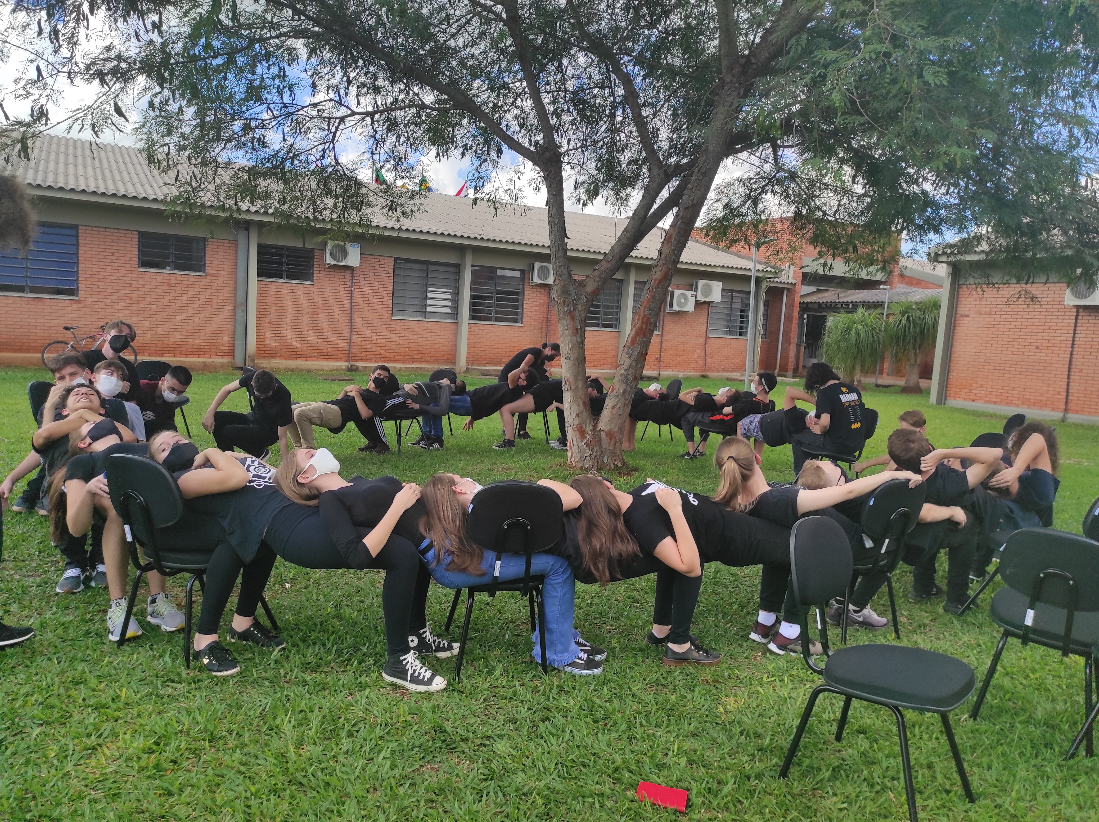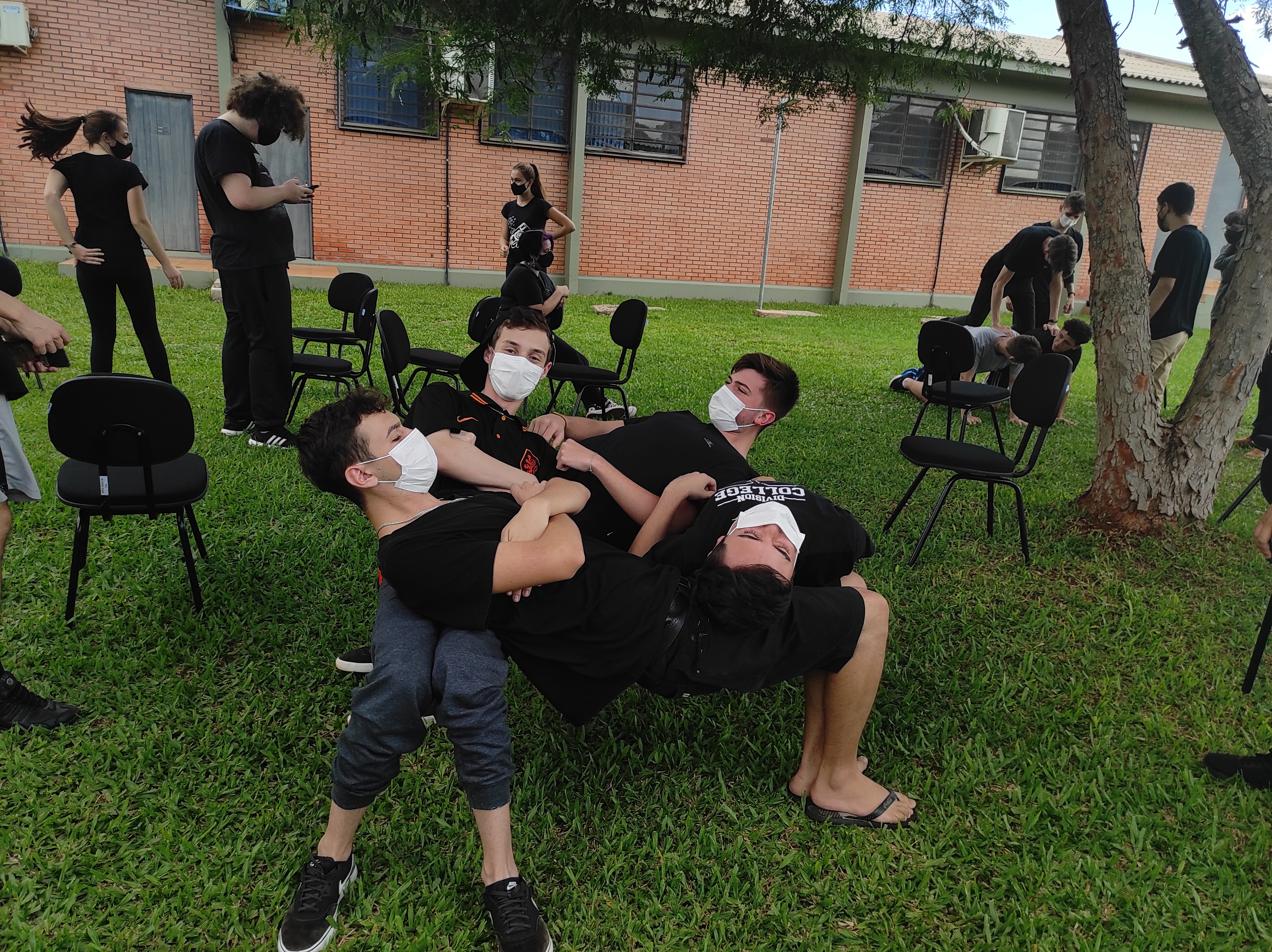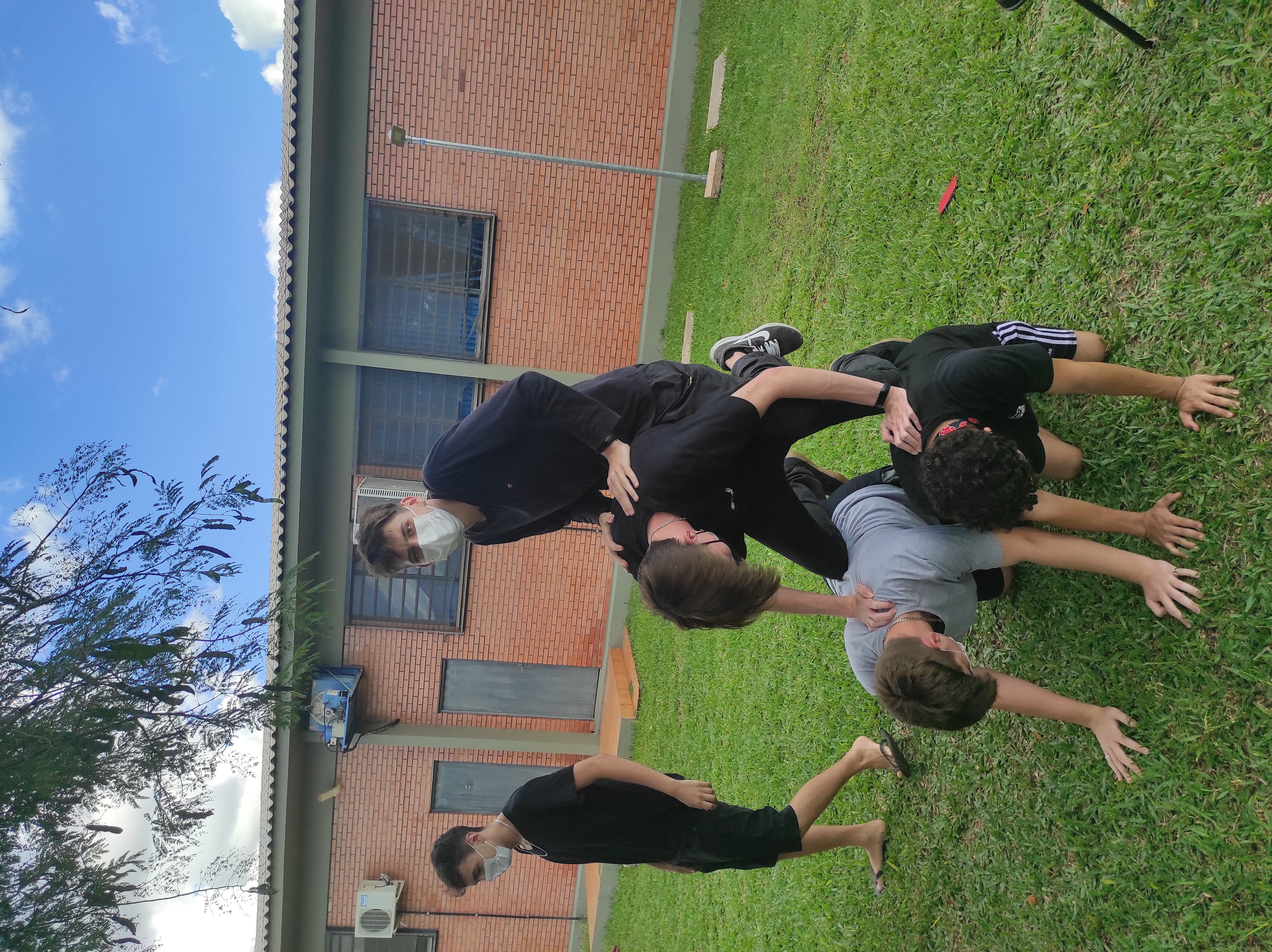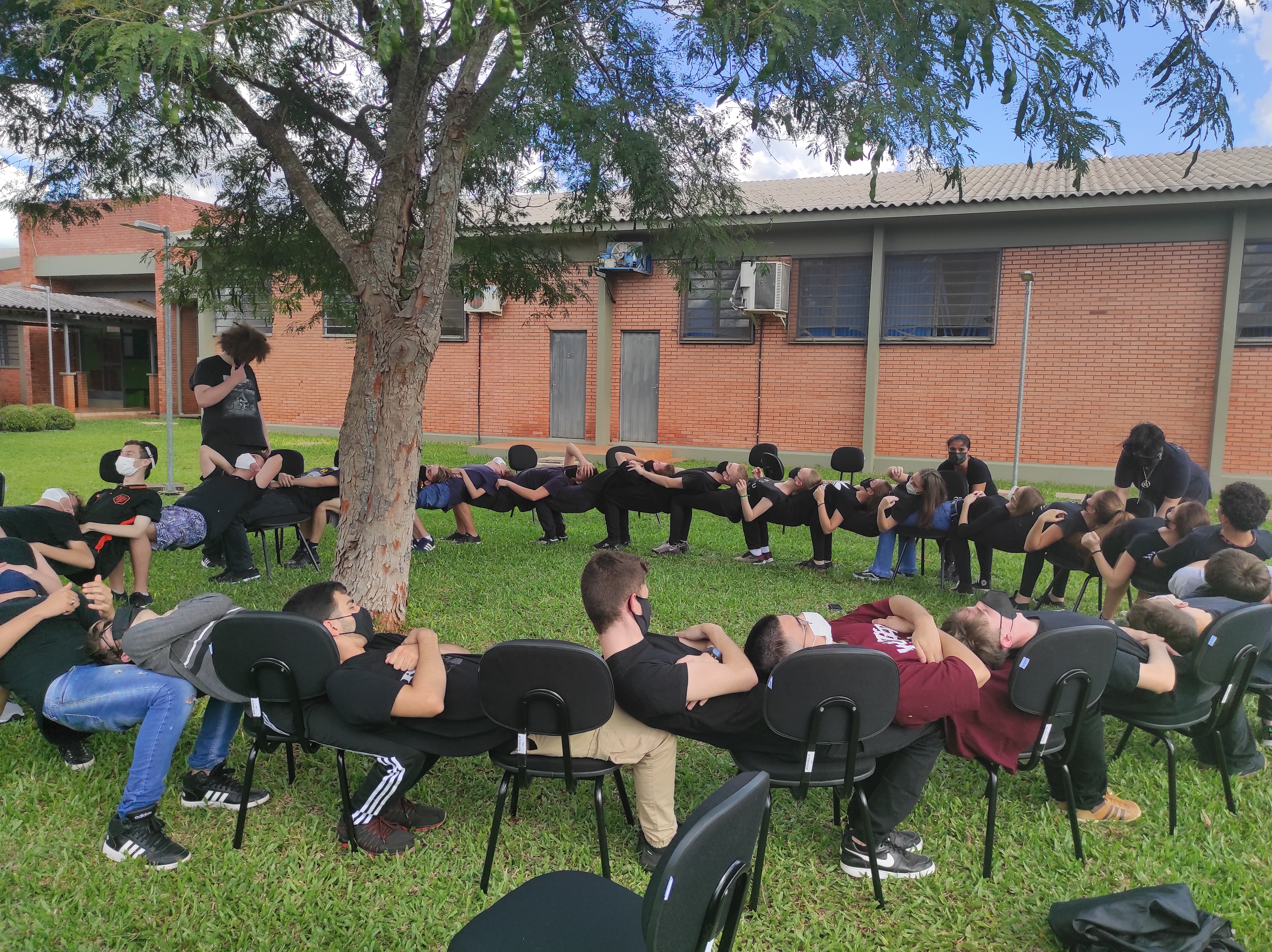 Para finalizar a conversa, os estudantes realizaram no gramado do campus a dinâmica de cooperação que requer confiança e respeito, que consiste em formar um círculo, estando um apoiado no corpo do outro. Segundo a professora Lais, essa atividade ensina os alunos a importância de confiar no colega, pois para permanecer no círculo um depende do outro.