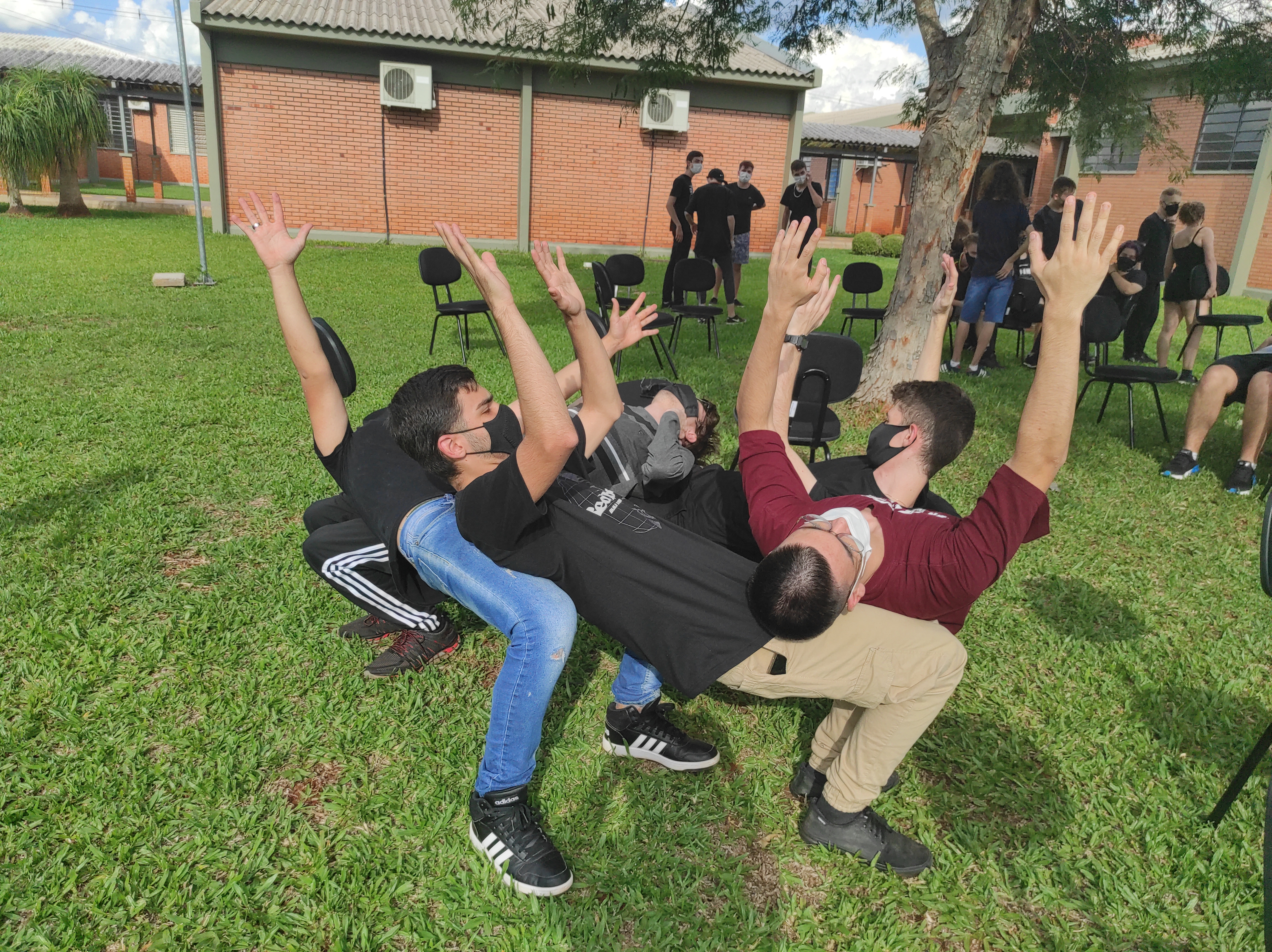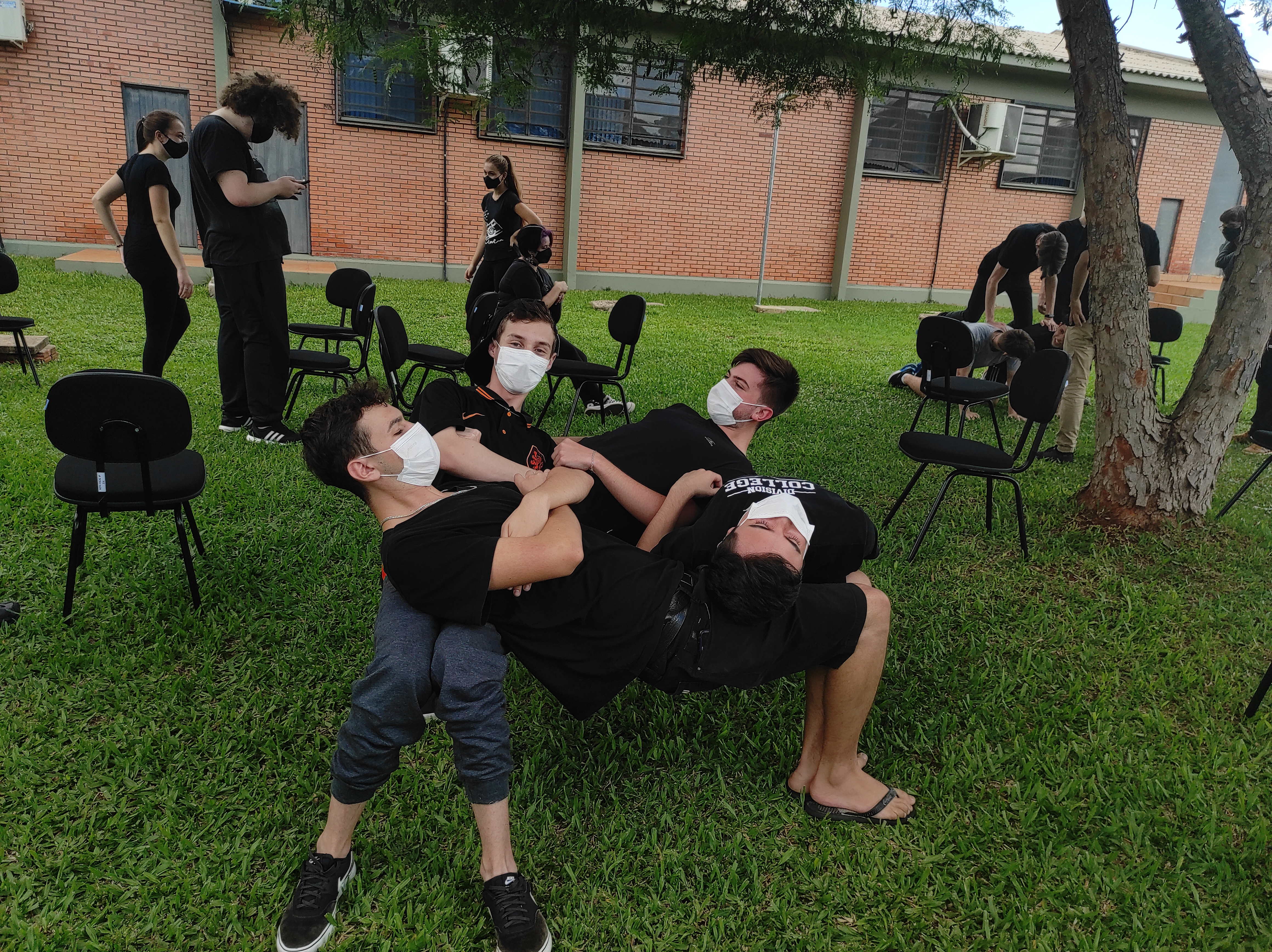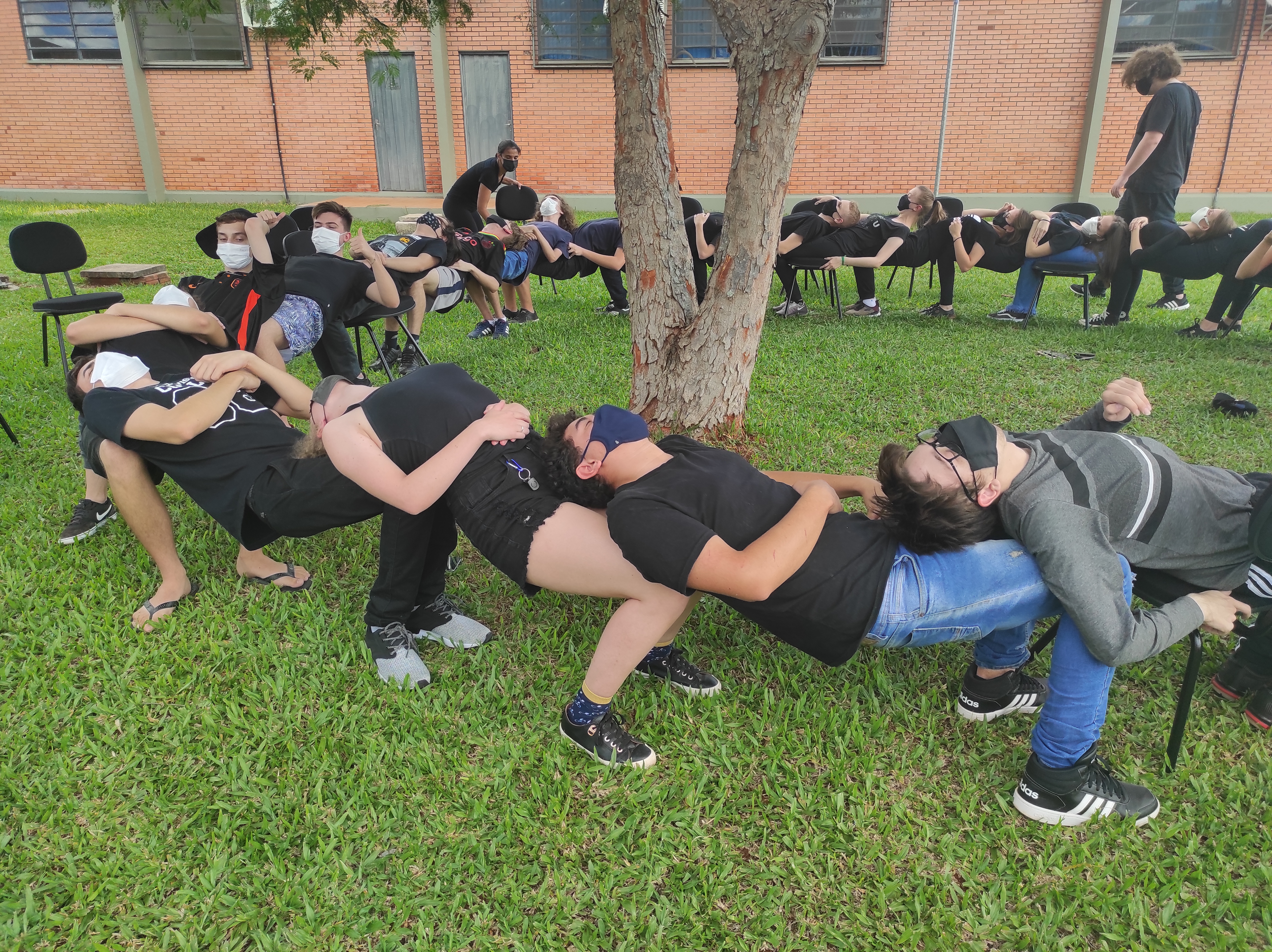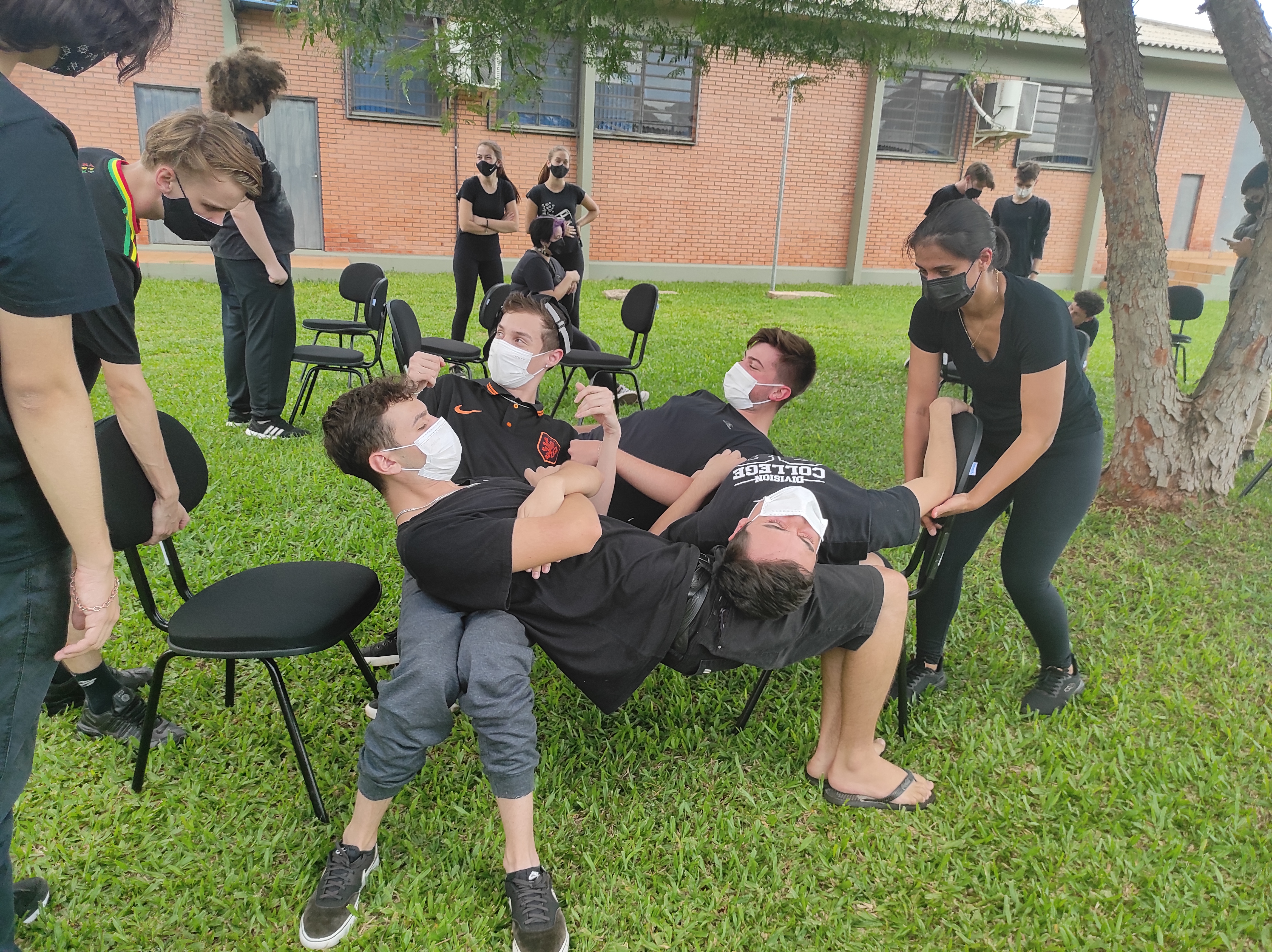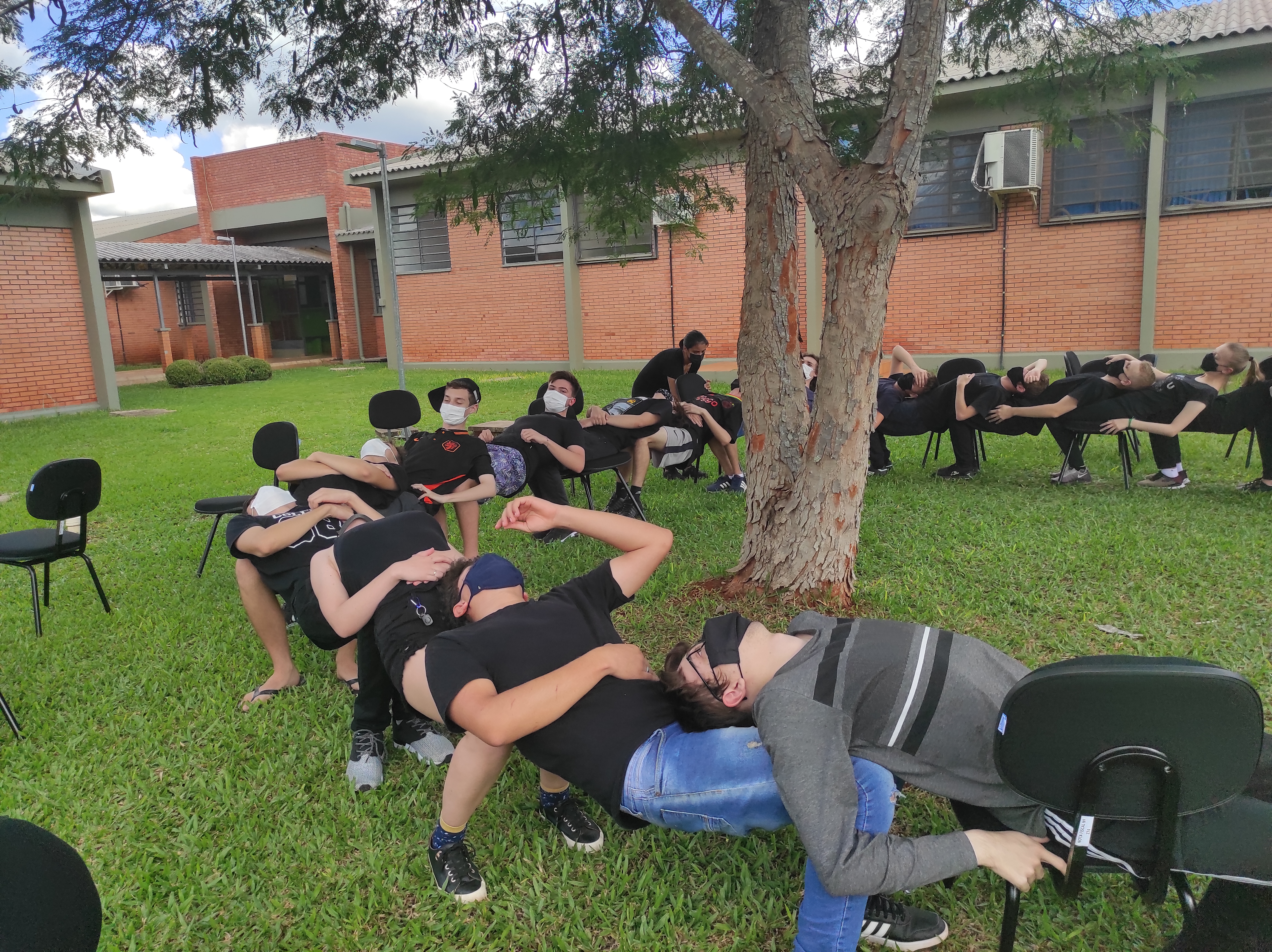 Para finalizar a conversa, os estudantes realizaram no gramado do campus a dinâmica de cooperação que requer confiança e respeito, que consiste em formar um círculo, estando um apoiado no corpo do outro. Segundo a professora Lais, essa atividade ensina os alunos a importância de confiar no colega, pois para permanecer no círculo um depende do outro.