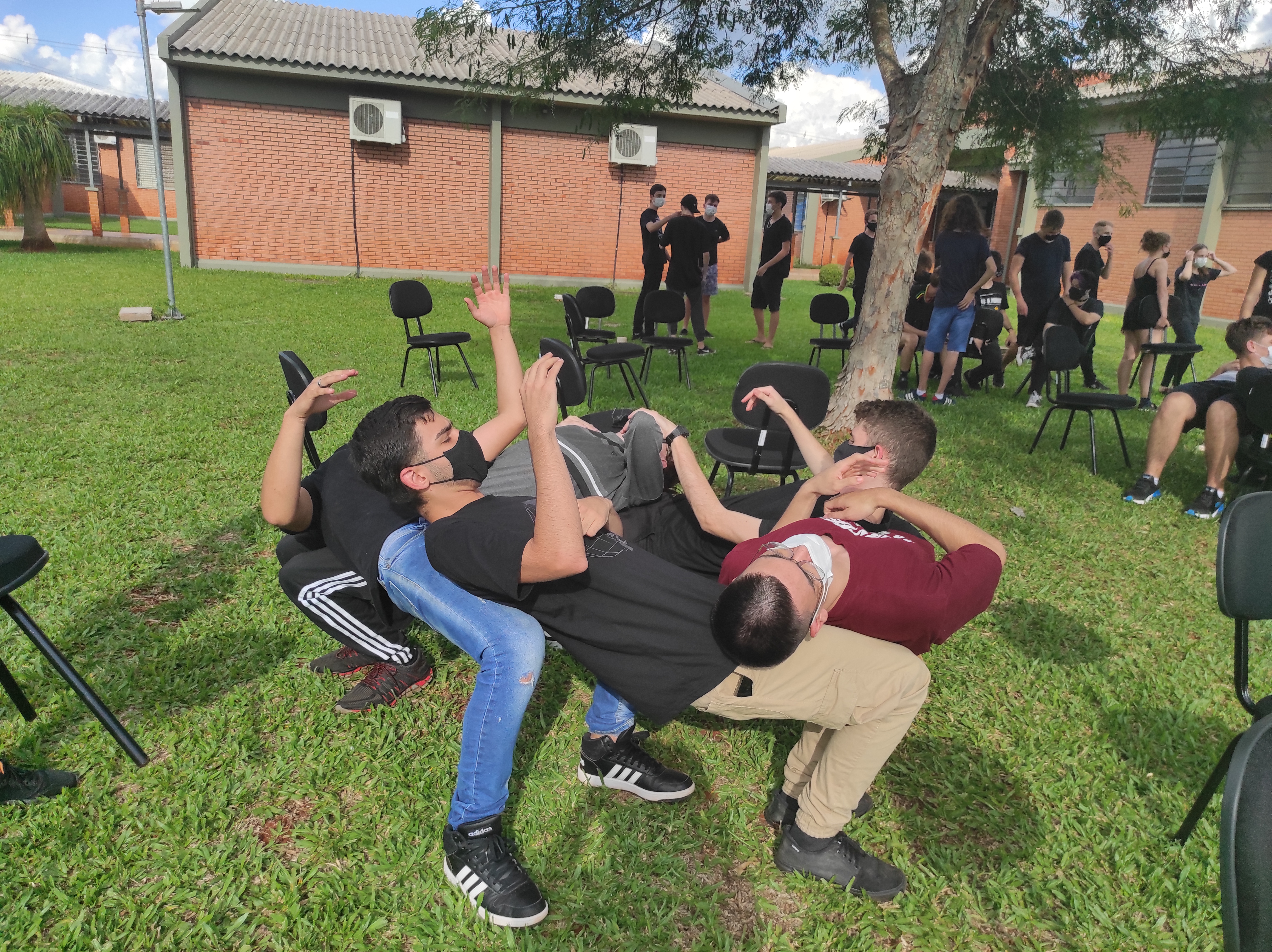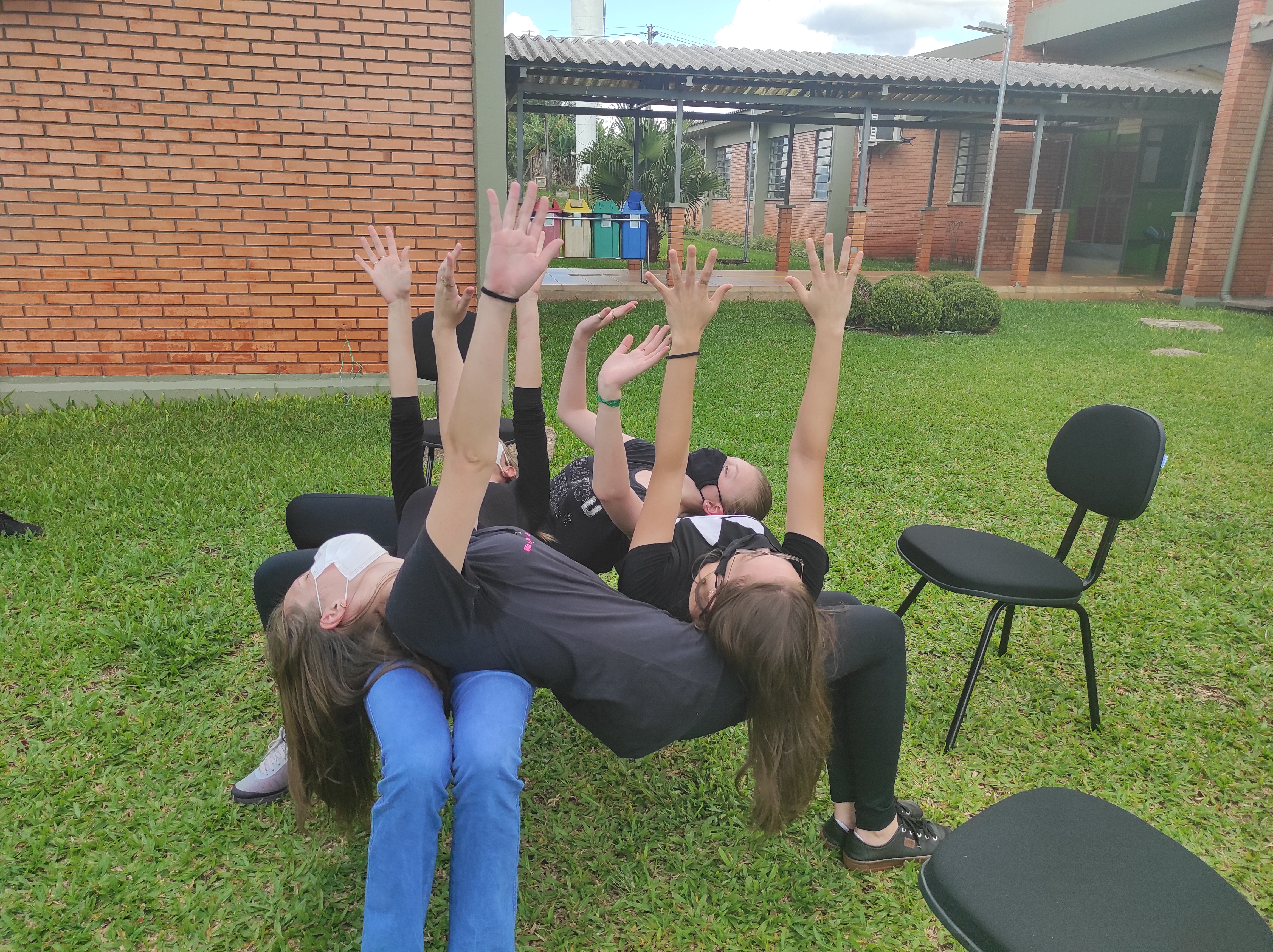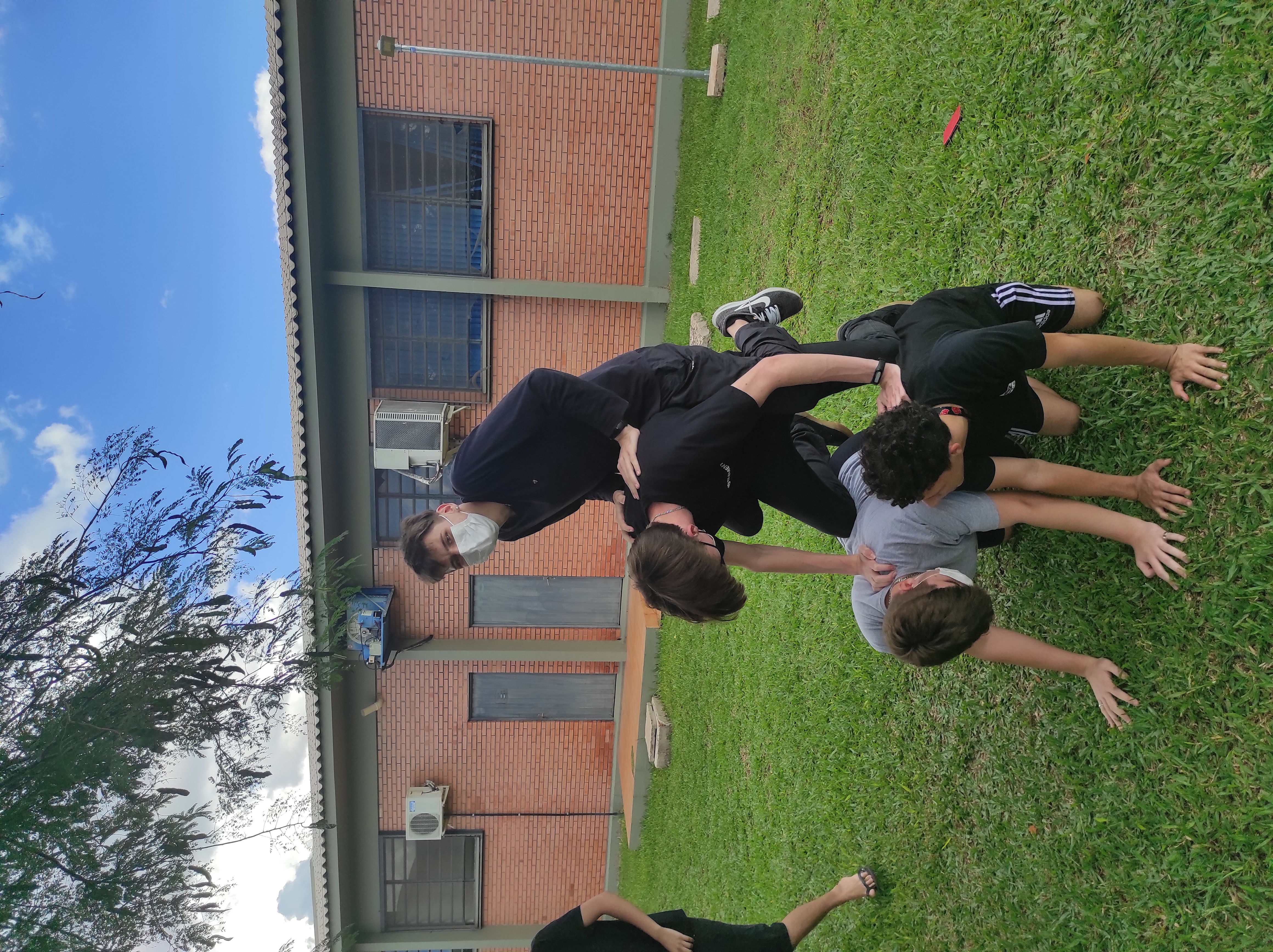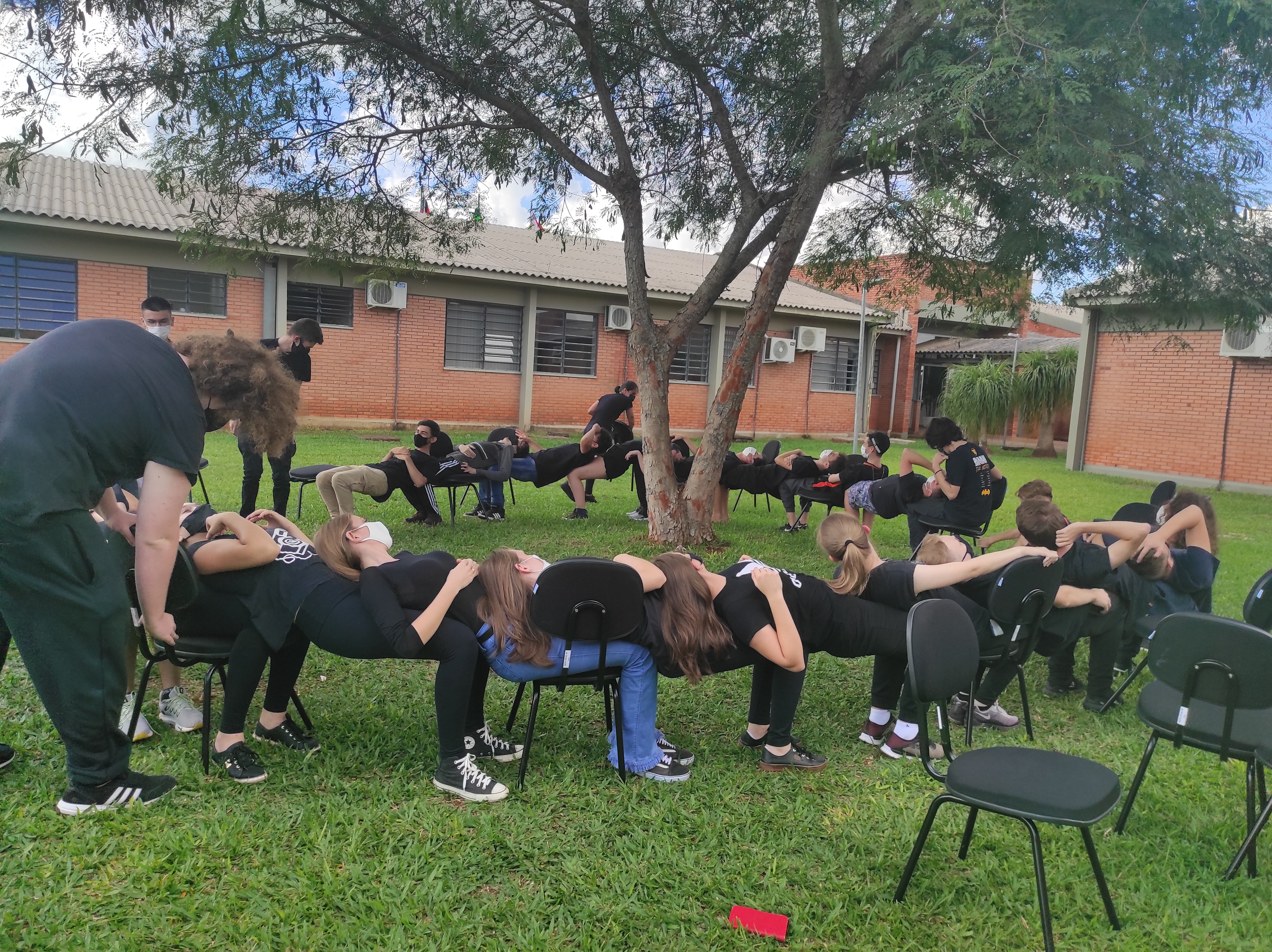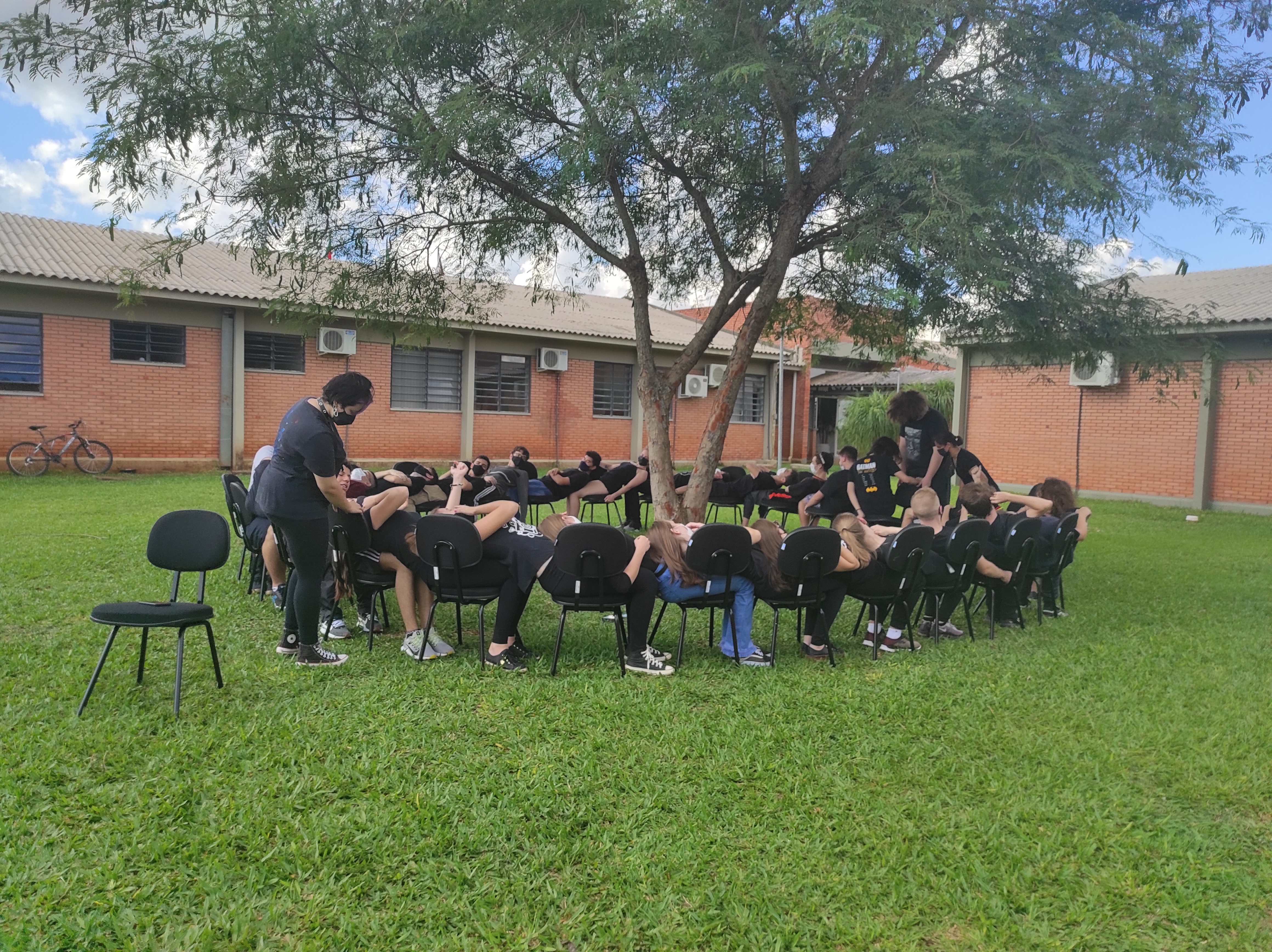 Para finalizar a conversa, os estudantes realizaram no gramado do campus a dinâmica de cooperação que requer confiança e respeito, que consiste em formar um círculo, estando um apoiado no corpo do outro. Segundo a professora Lais, essa atividade ensina os alunos a importância de confiar no colega, pois para permanecer no círculo um depende do outro.