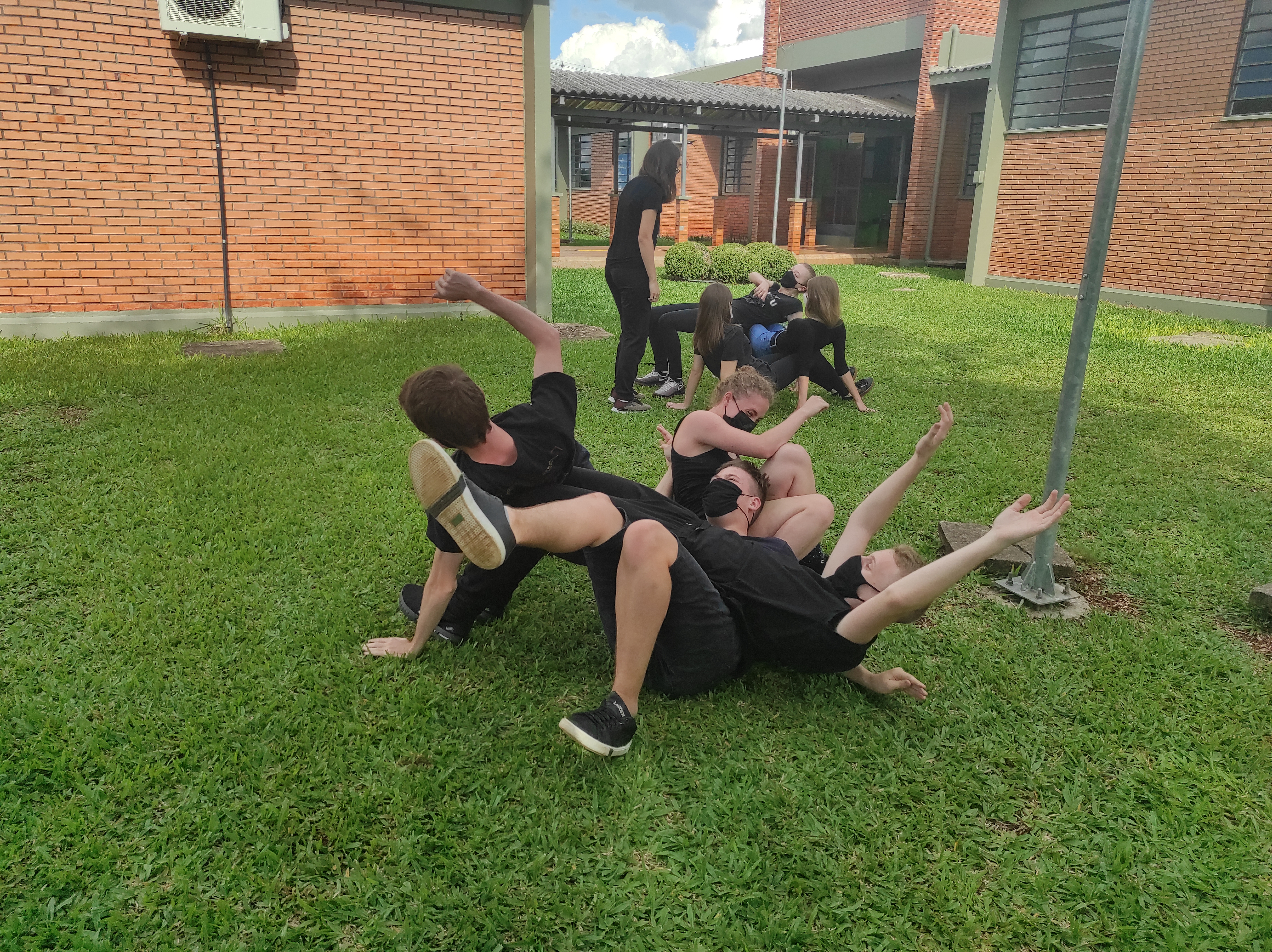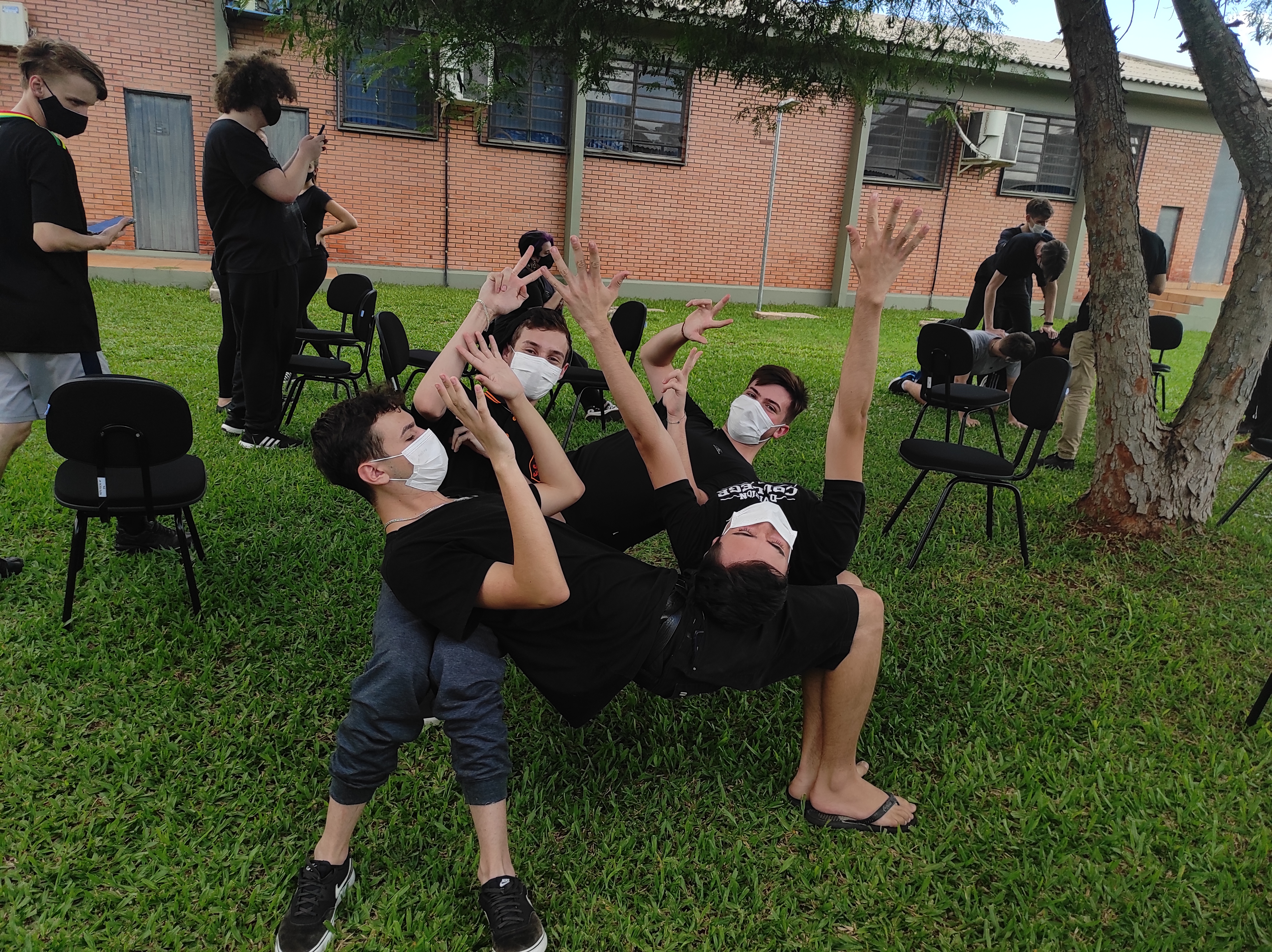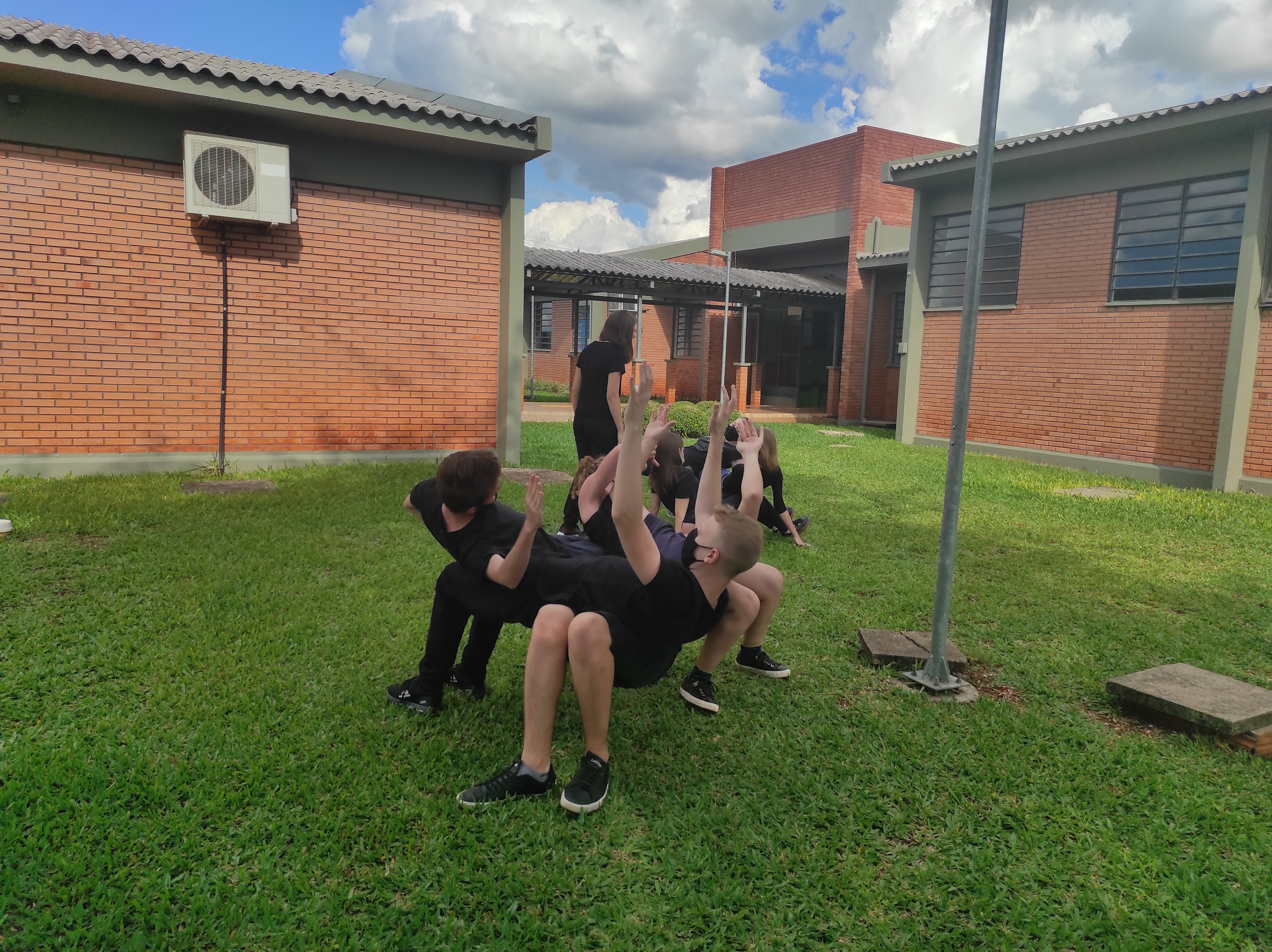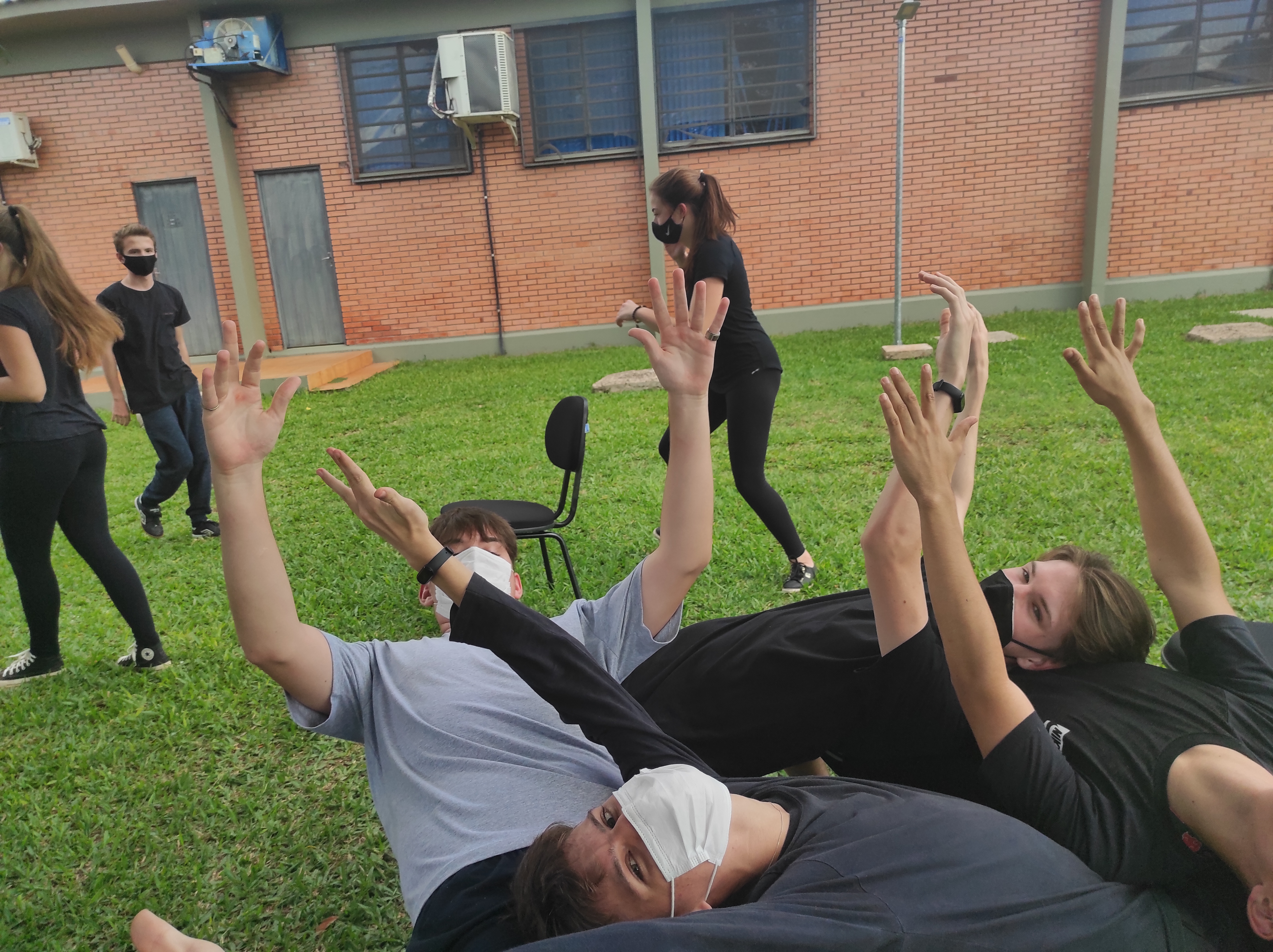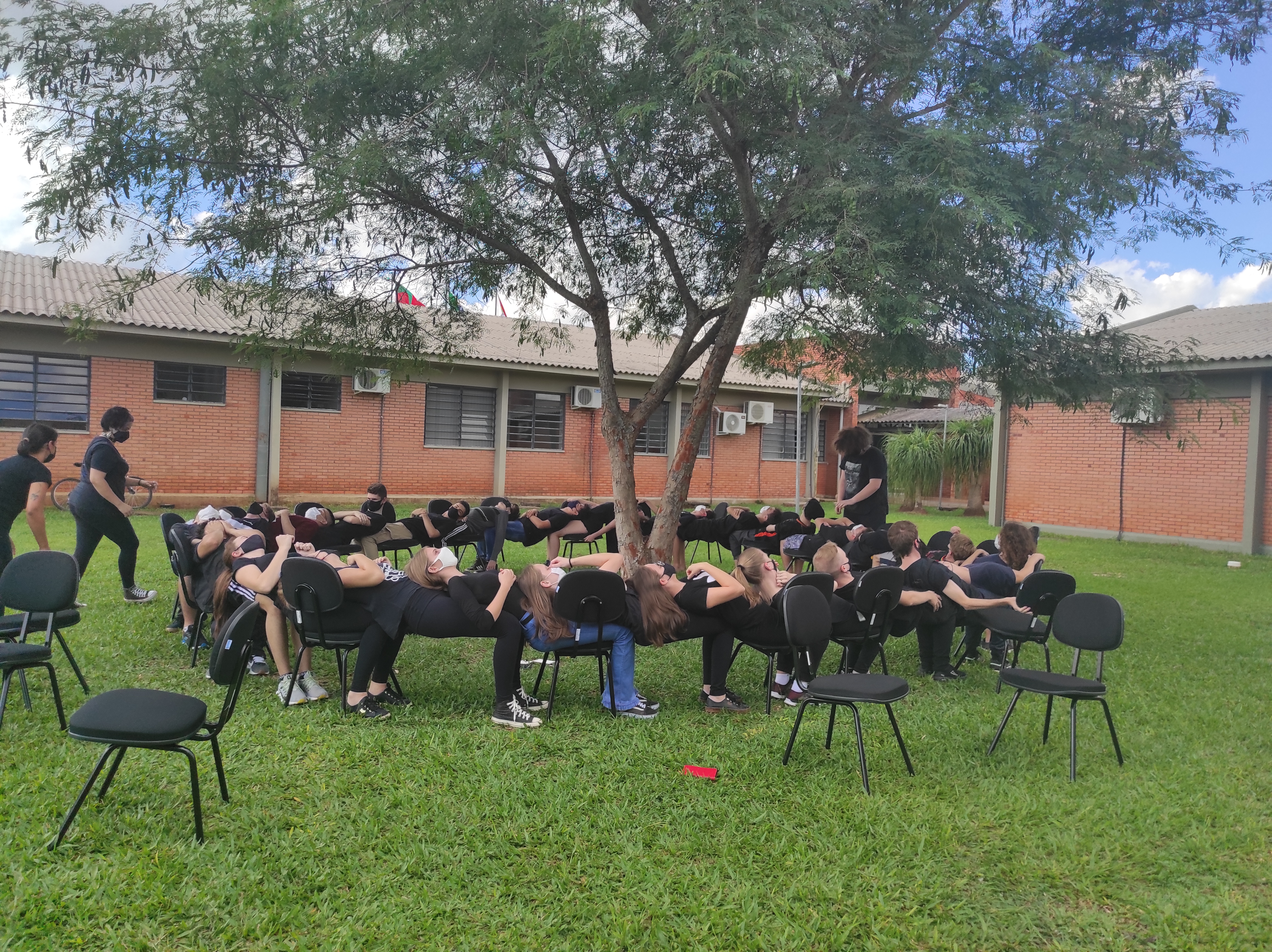 Para finalizar a conversa, os estudantes realizaram no gramado do campus a dinâmica de cooperação que requer confiança e respeito, que consiste em formar um círculo, estando um apoiado no corpo do outro. Segundo a professora Lais, essa atividade ensina os alunos a importância de confiar no colega, pois para permanecer no círculo um depende do outro.