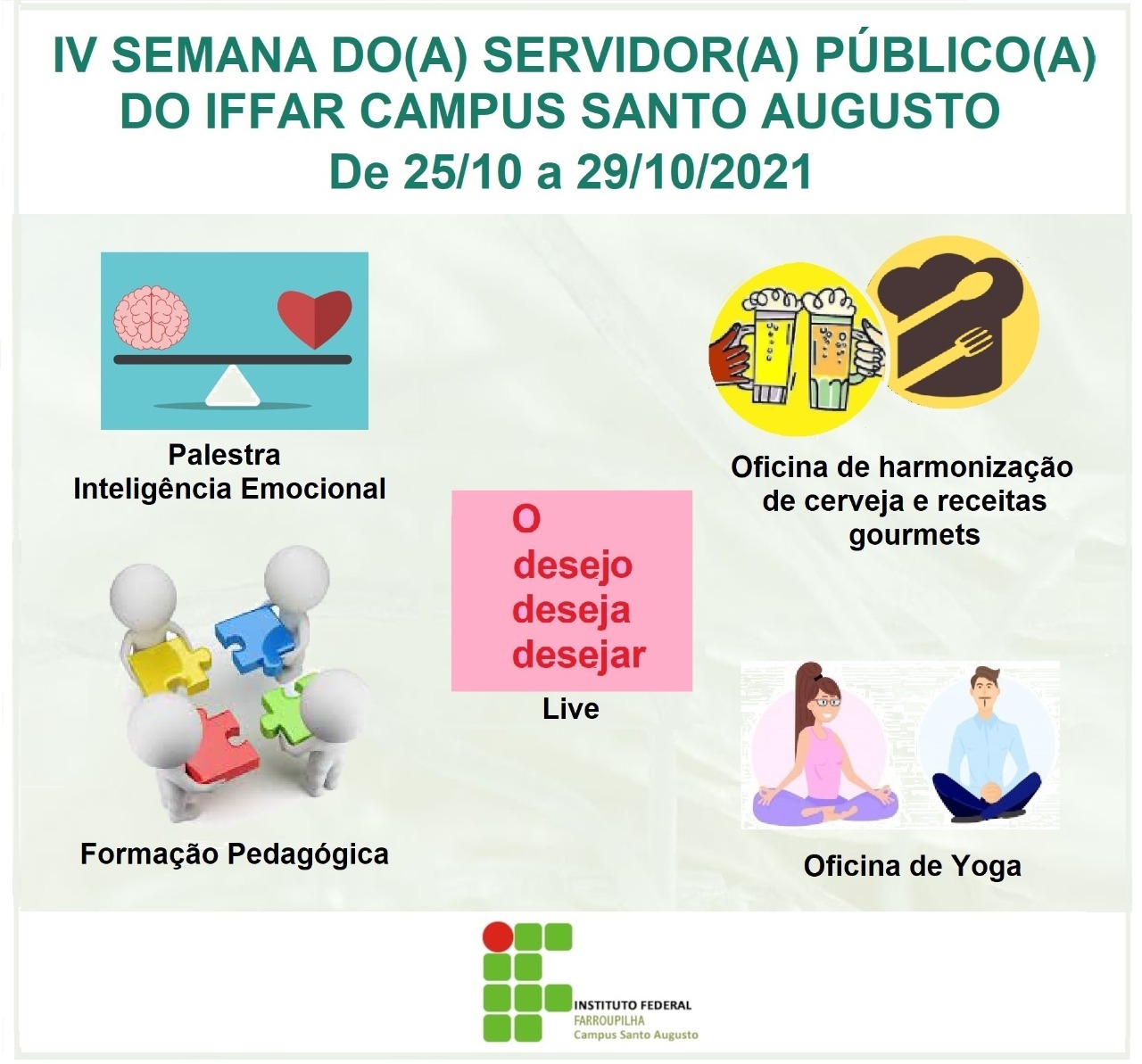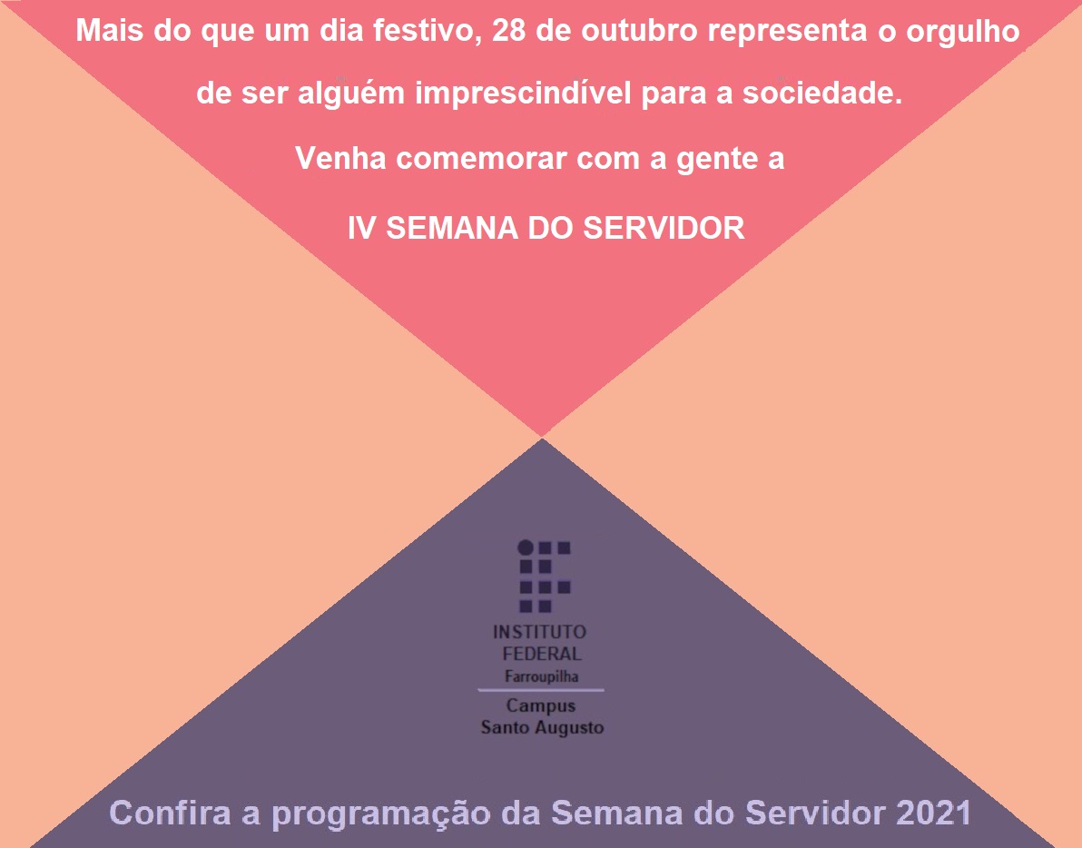 O IFFar – Campus Santo Augusto promove de 25 a 29 de outubro a IV Semana do Servidor, em comemoração ao Dia do Servidor Público, com atividades virtuais. A abertura do evento ocorre no dia 25 às 14h.