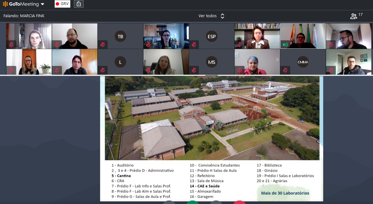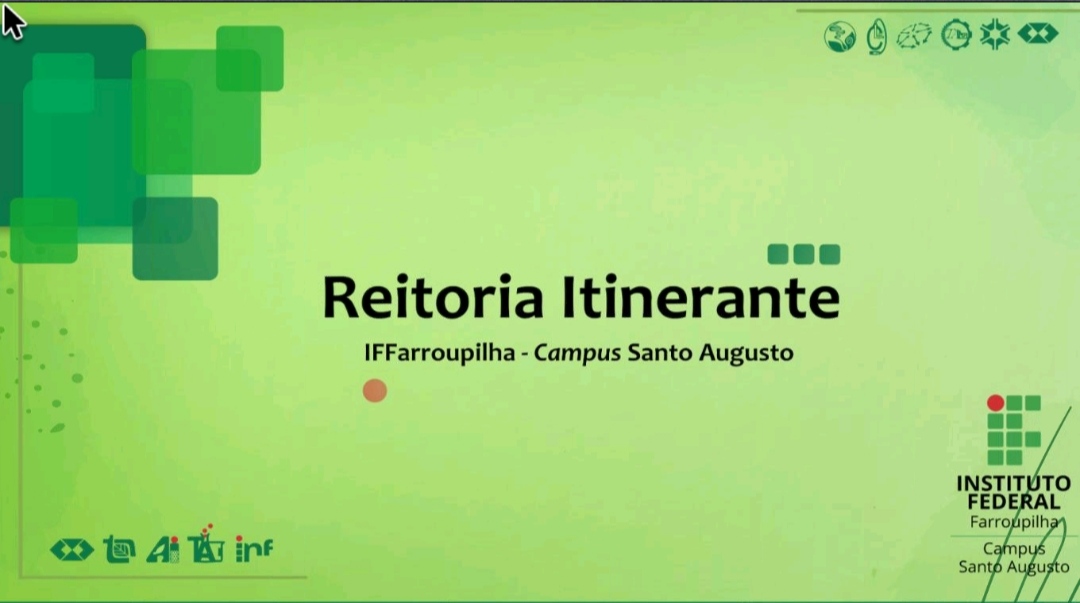 O IFFar - Campus Santo Augusto recebeu na última quinta-feira, 20 de maio, a Reitoria Itinerante virtual do IFFar, com objetivo de promover um momento de conversa para tratar das demandas da comunidade acadêmica dos campi. Na ocasião, a Reitora do IFFar, Nídia Heringer, e os Pró-reitores realizaram reuniões virtuais com a equipe diretiva, com o setores, com os servidores e com as lideranças estudantis.