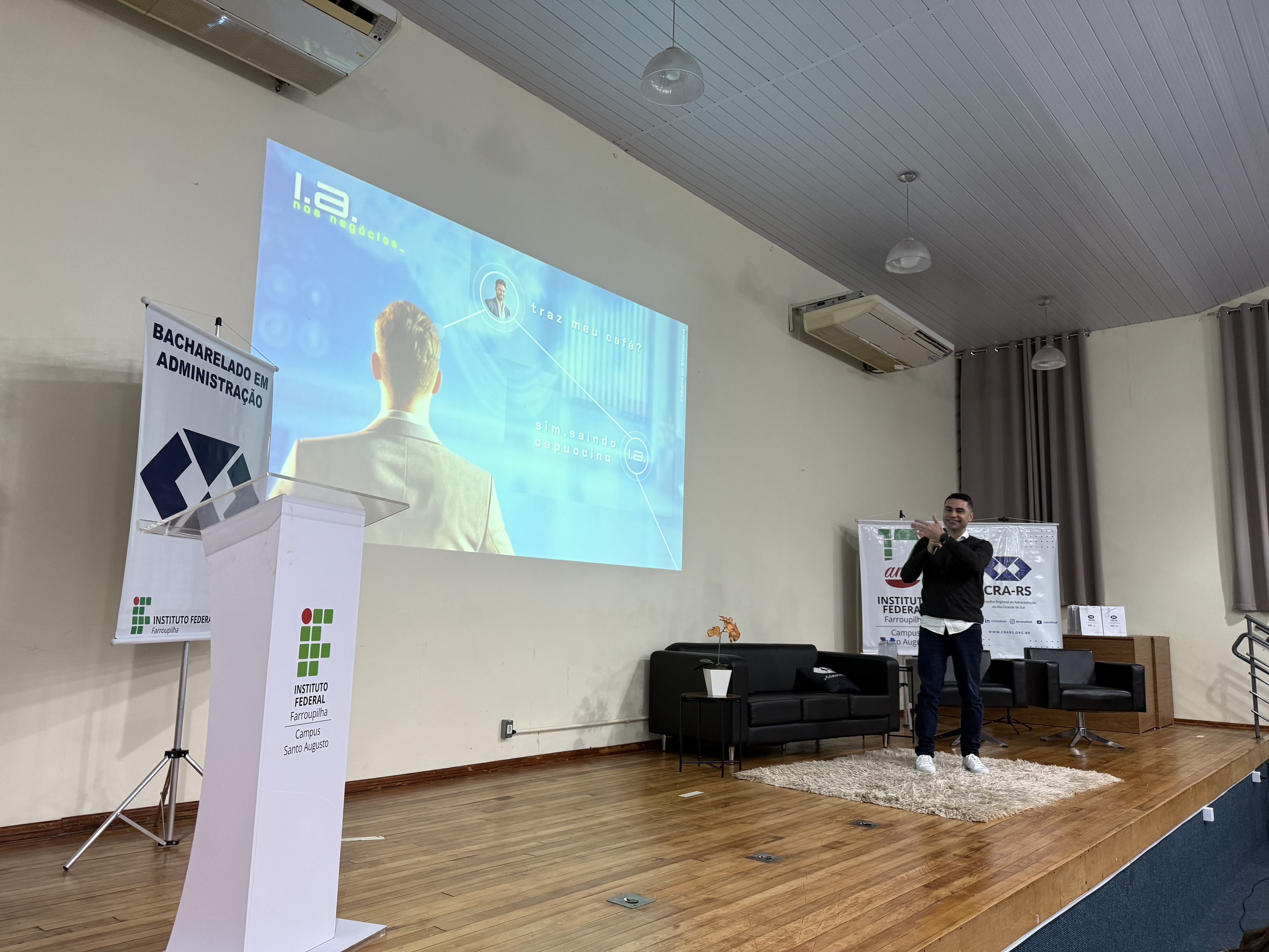 A palestra da noite, com o tema “Inteligência Artificial nos Negócios”, foi conduzida pelo Administrador Lucas Silveira, empreendedor com ampla experiência em gestão, inovação e tecnologia, que já atuou junto a grandes marcas nacionais e internacionais e hoje integra a Câmara de Gestão em Tecnologia e Inovação do CRA-RS (CETInova).