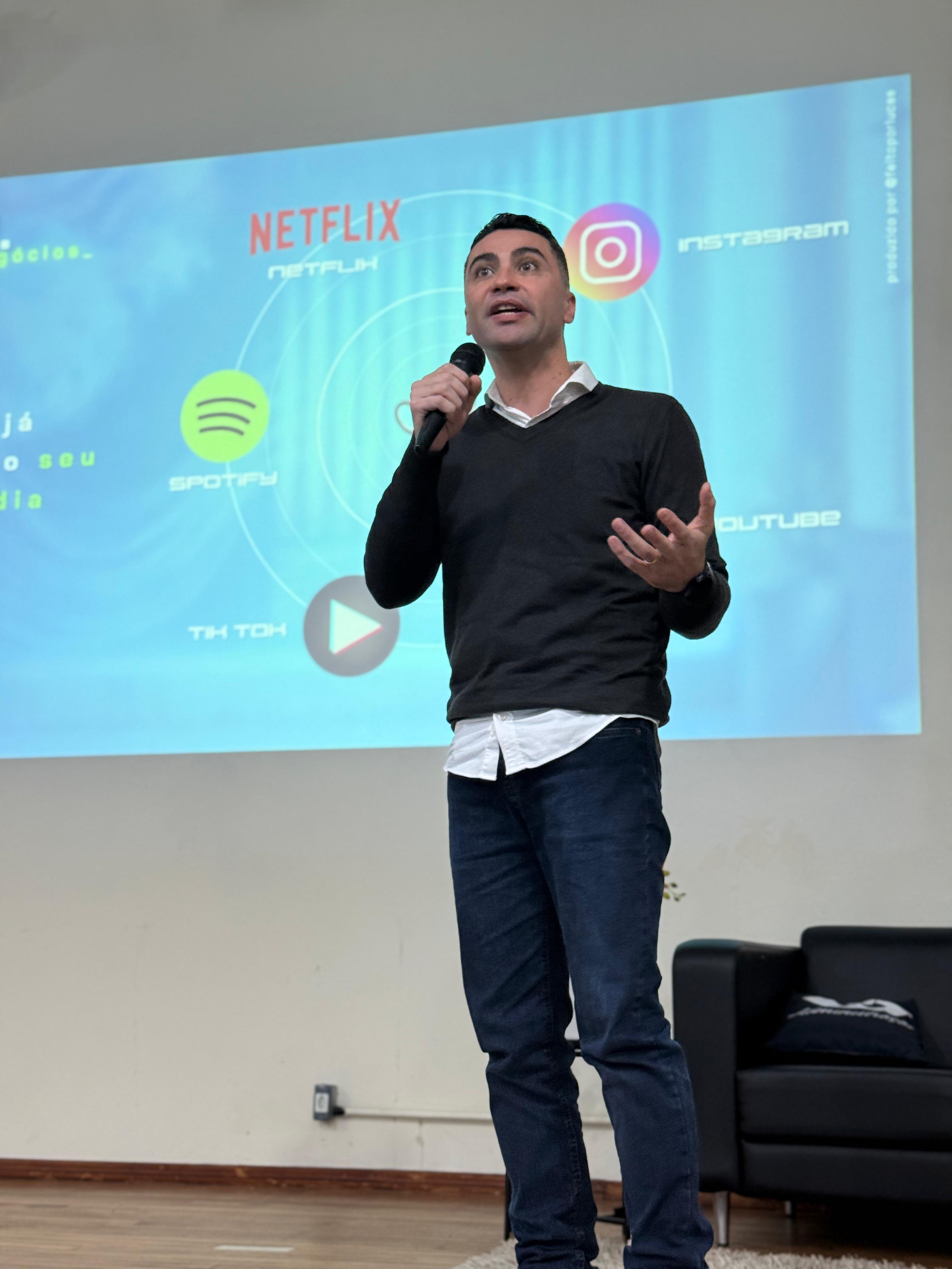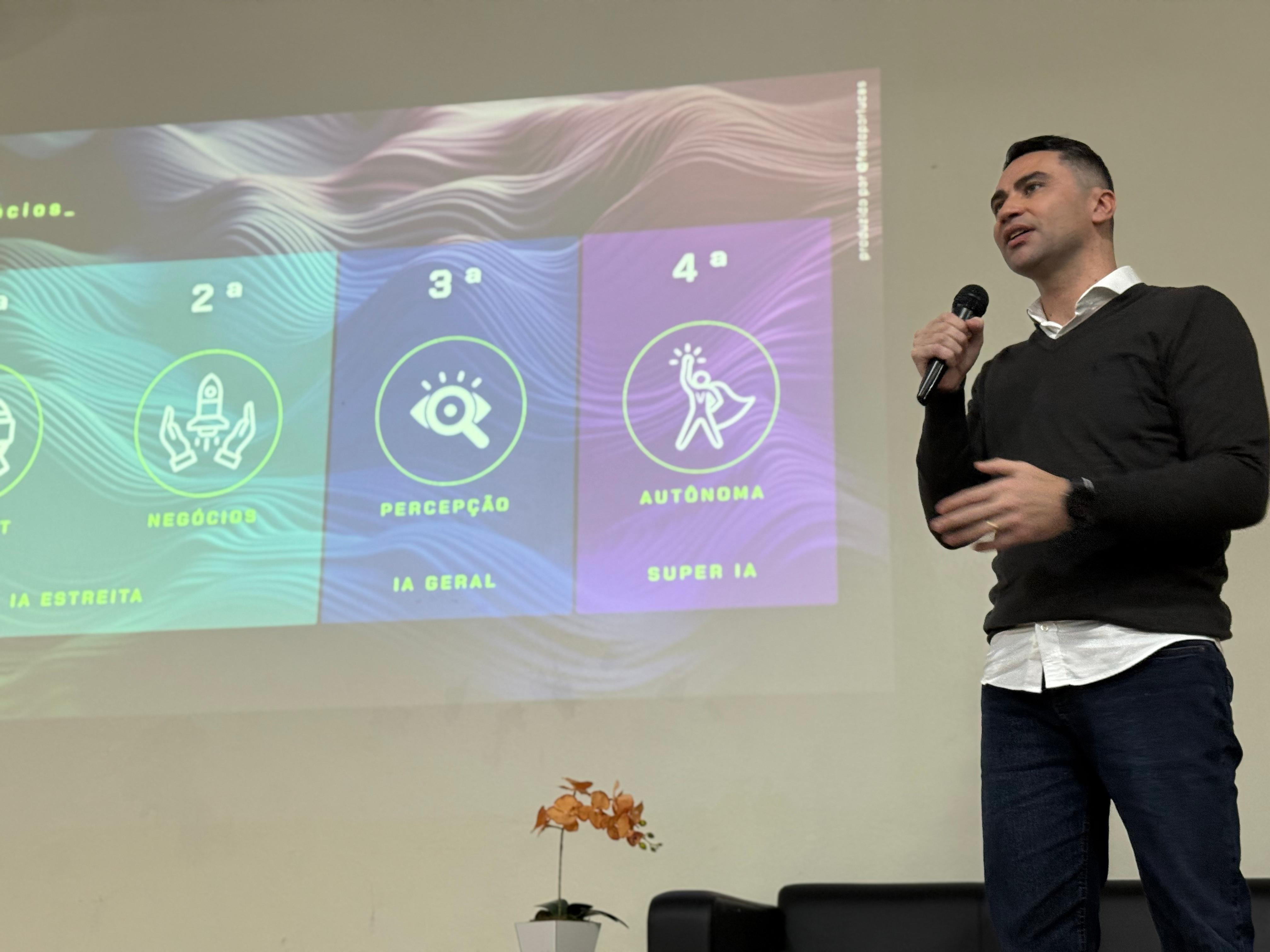 Lucas compartilhou em sua fala reflexões sobre os impactos da inteligência artificial no ambiente corporativo, enfatizando as oportunidades e desafios que essa tecnologia traz para diferentes setores, ressaltando a importância de aliar as capacidades da inteligência artificial à sensibilidade humana. Apontando ainda, caminhos práticos para gestores e futuros profissionais que desejam compreender e aplicar a IA de forma estratégica em seus negócios.