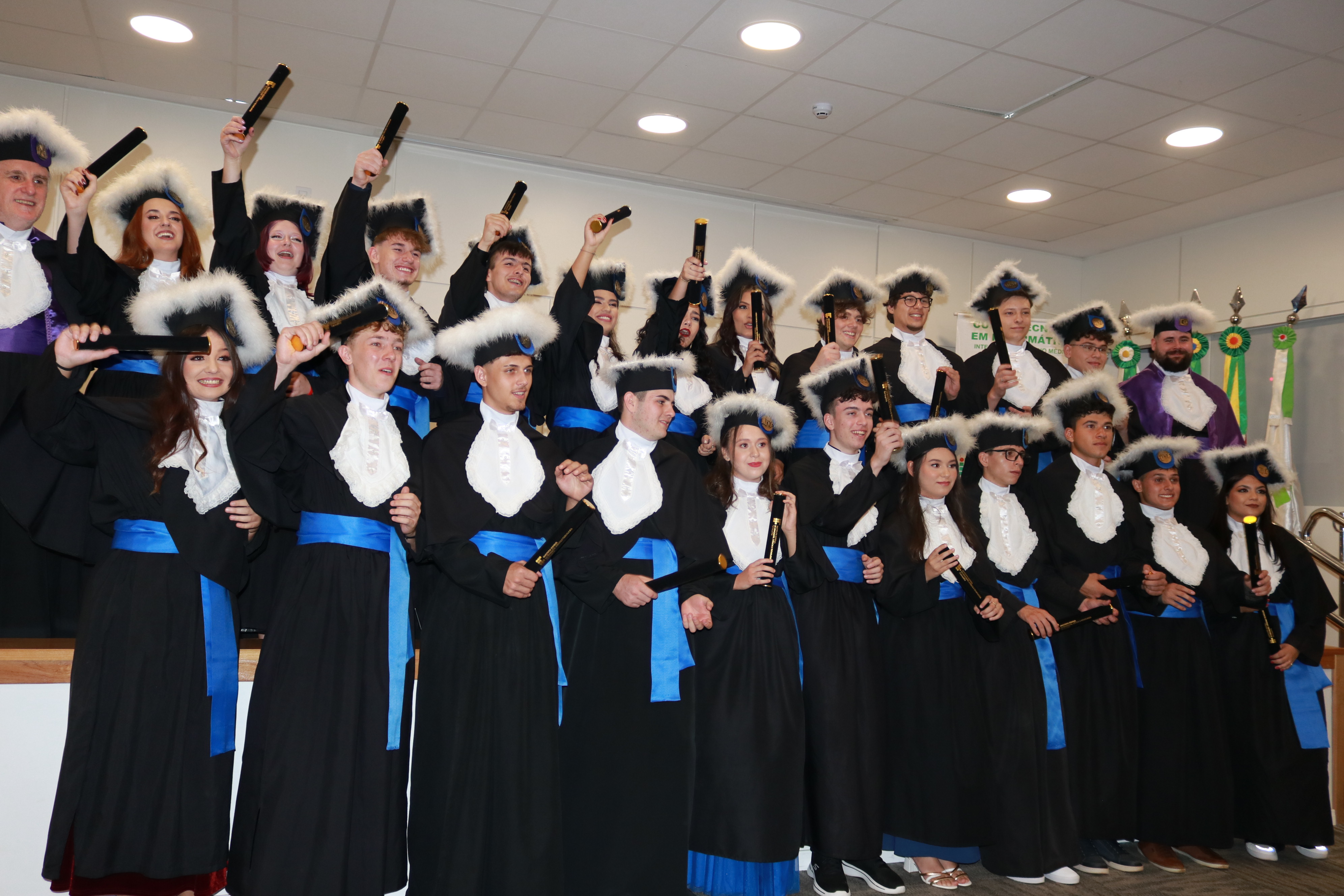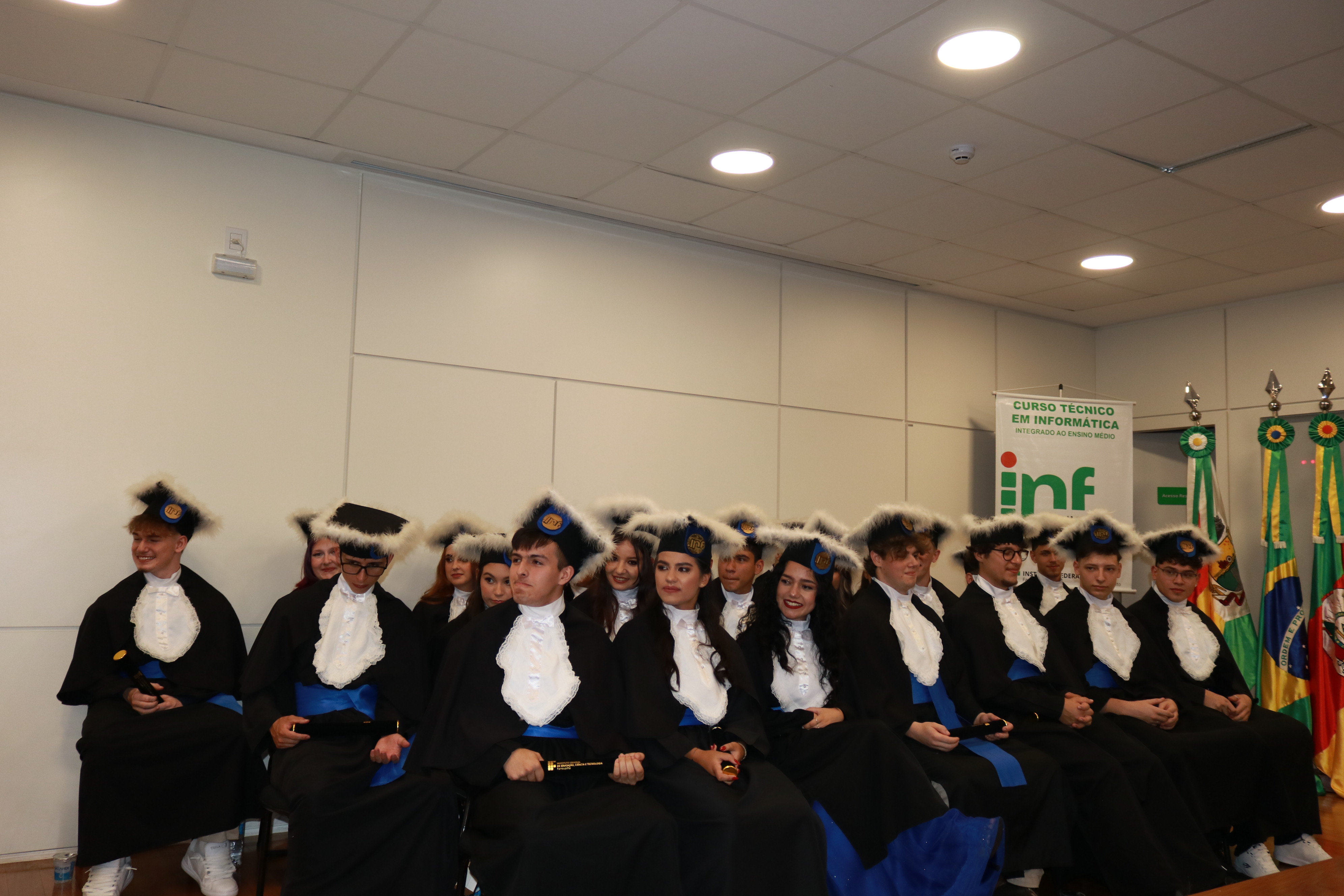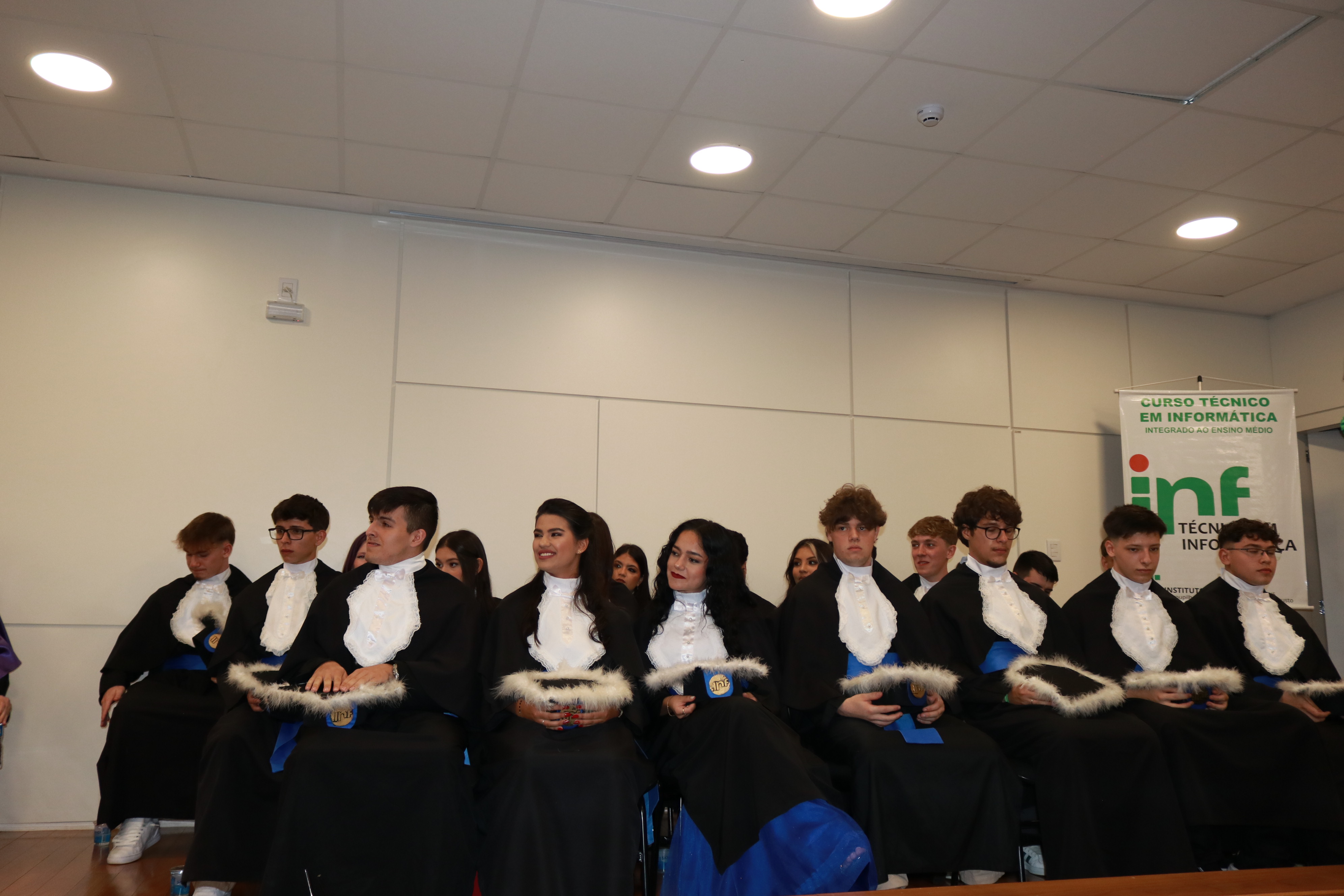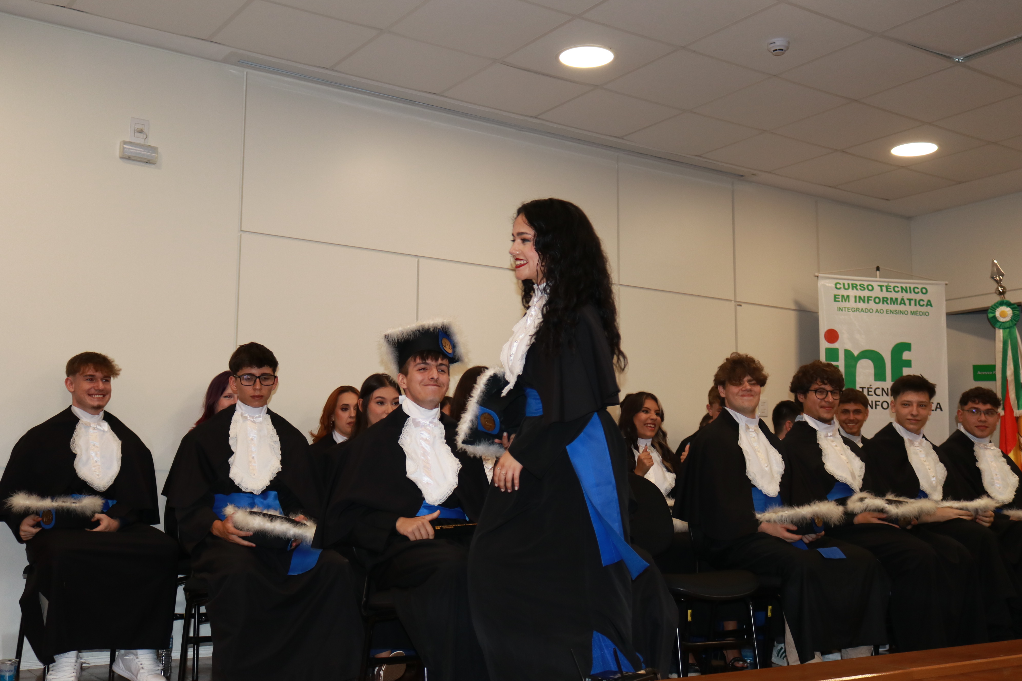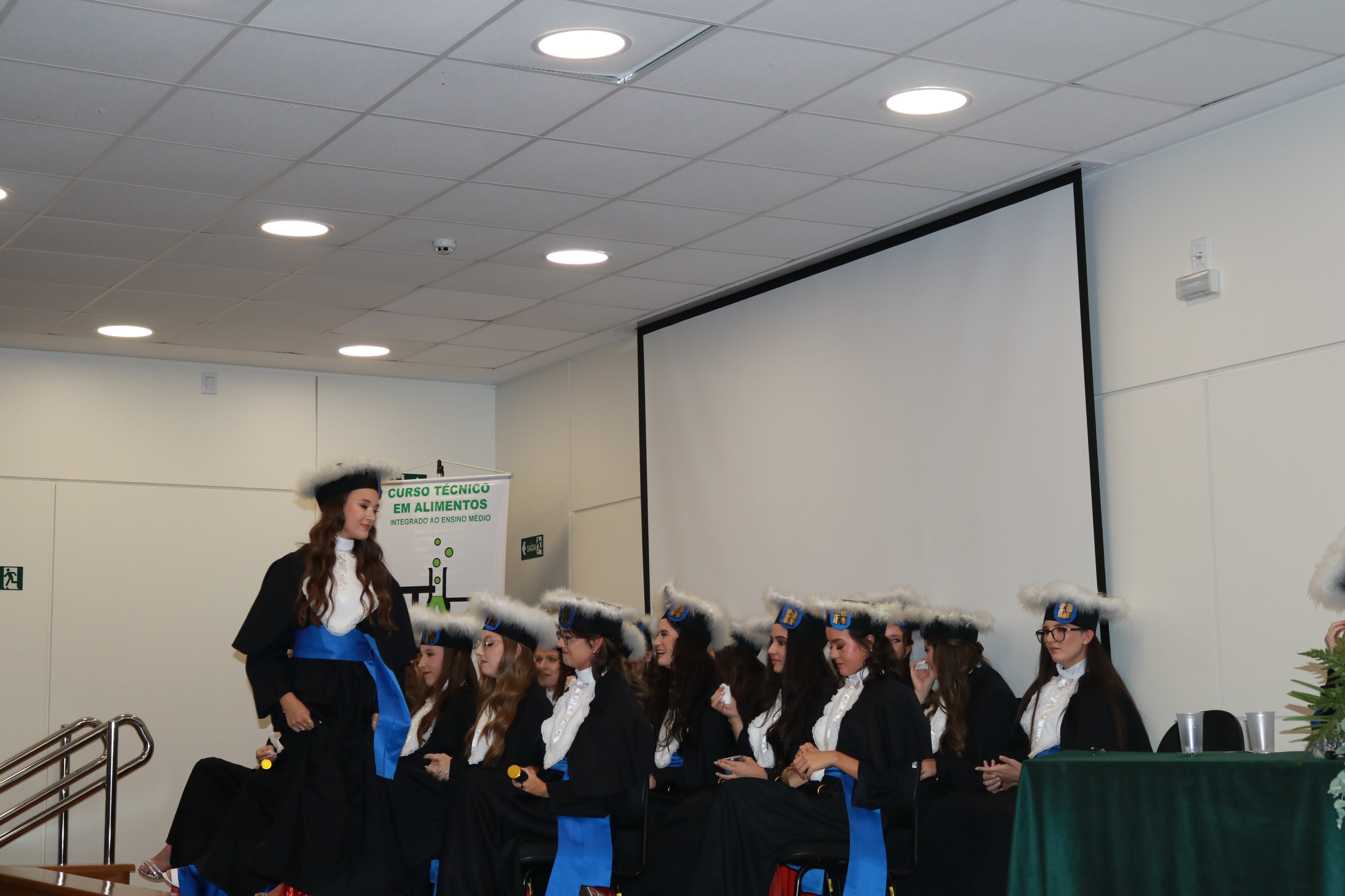 No dia 31, às 19h, foram certificados 44 concluintes, sendo 21 do Técnico em Alimentos e 23 de Informática. A solenidade foi presidida pela Diretora Geral substituta, Téoura Benetti, e contou com a presença da Coordenadora do curso Técnico em Alimentos integrado ao ensino médio, Melissa dos Santos Oliveira; da Paraninfa da 14ª turma, Giovana Kafer e da Patronesse, Débora Piovesan Moraes; do Coordenador do Curso Técnico em Informática integrado ao ensino médio, Paulo Henrique Oliveira; do Paraninfo da 14ª Turma, Dirceu Dirk e do Patrono, Uianes Biondo, que também representou a SME e o poder executivo, bem como osprofessores homenageados, servidores e familiares dos concluintes.