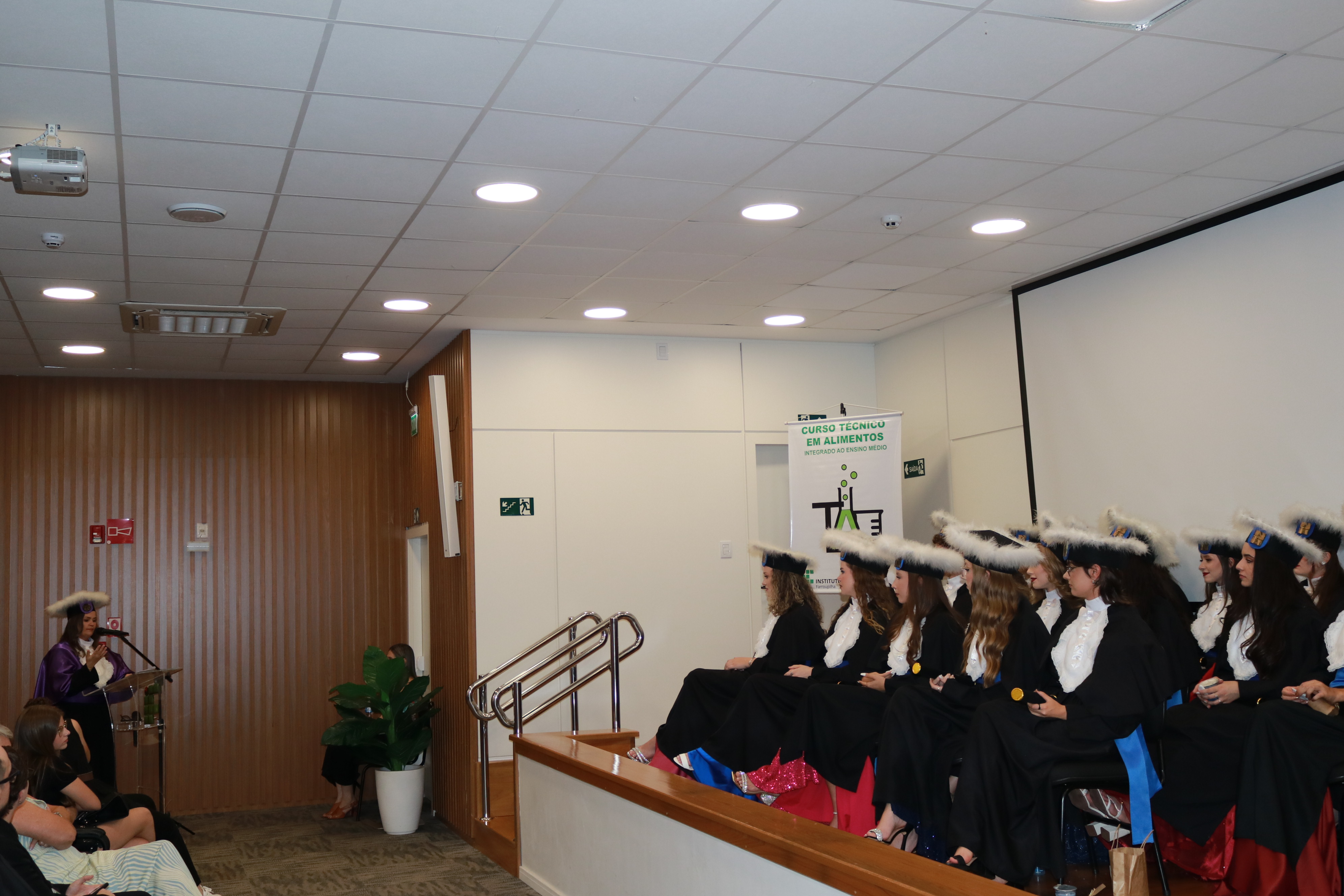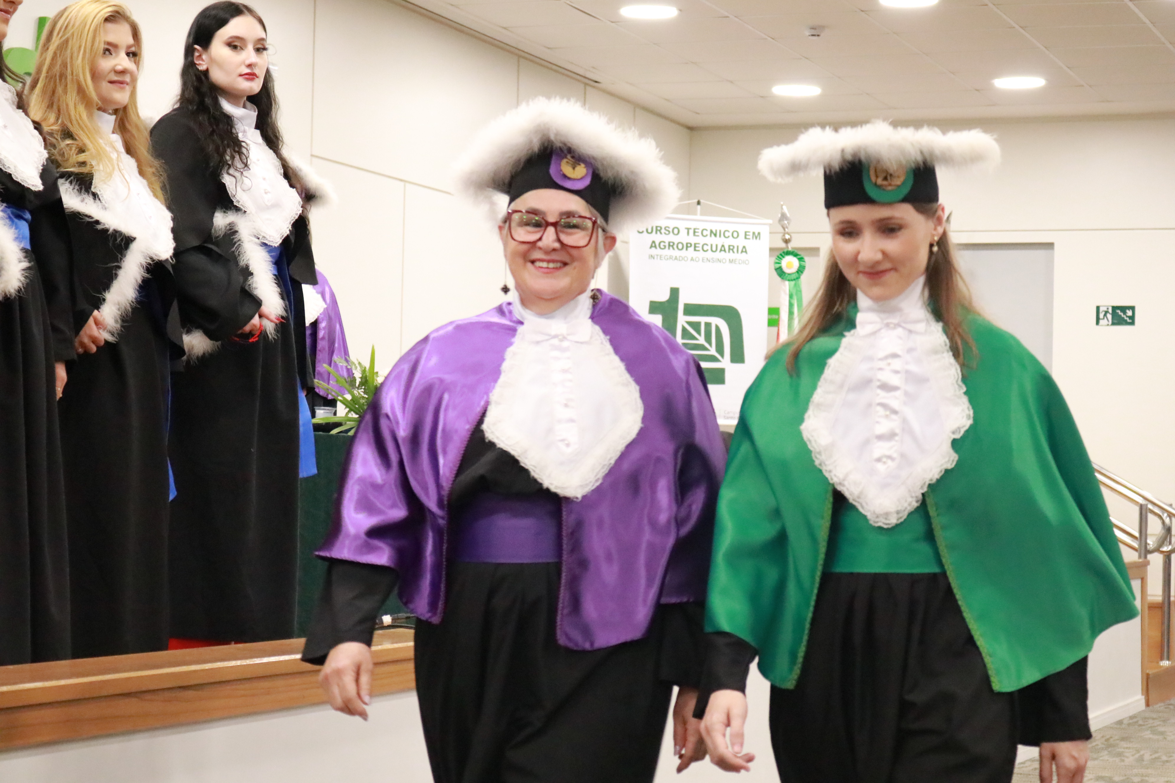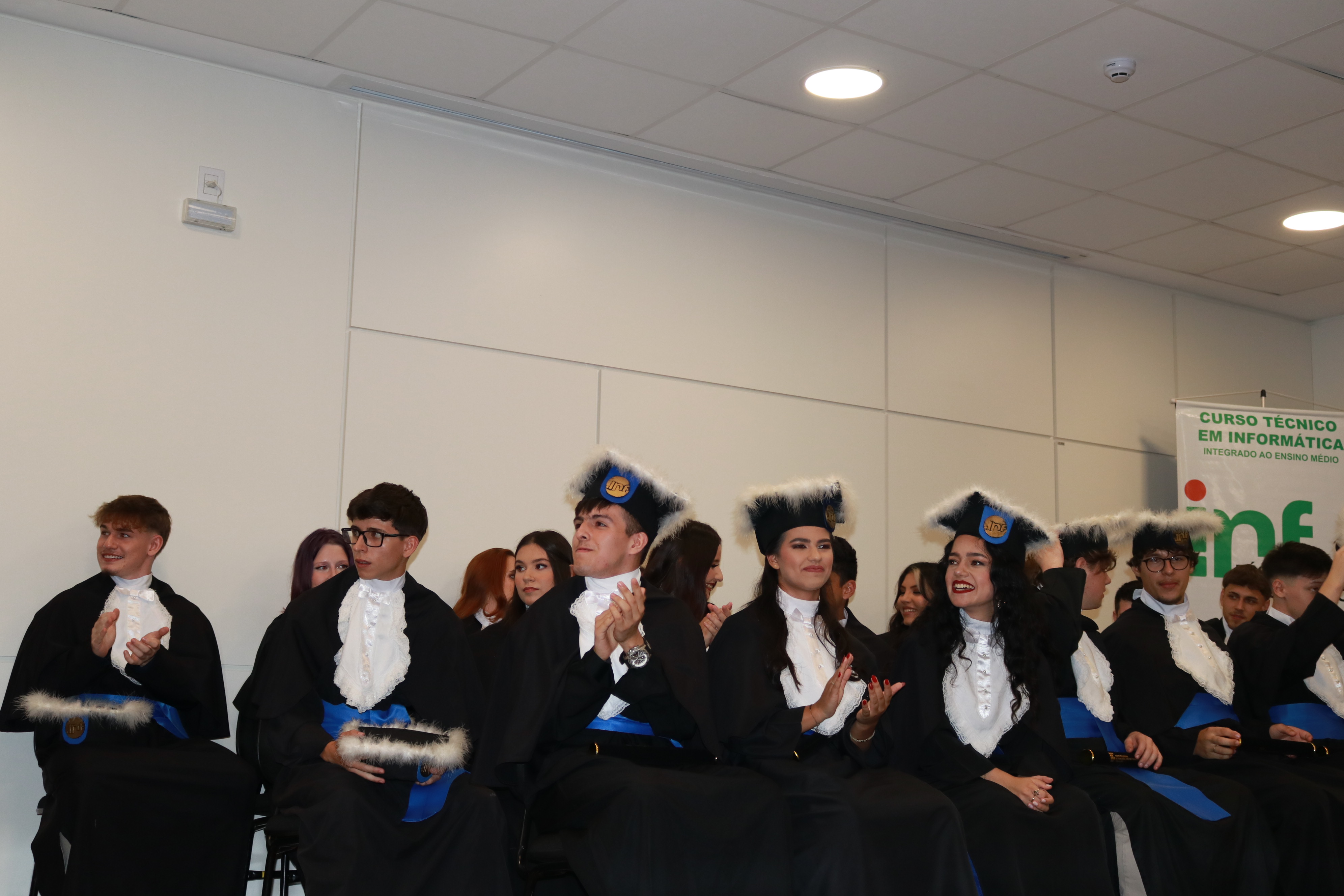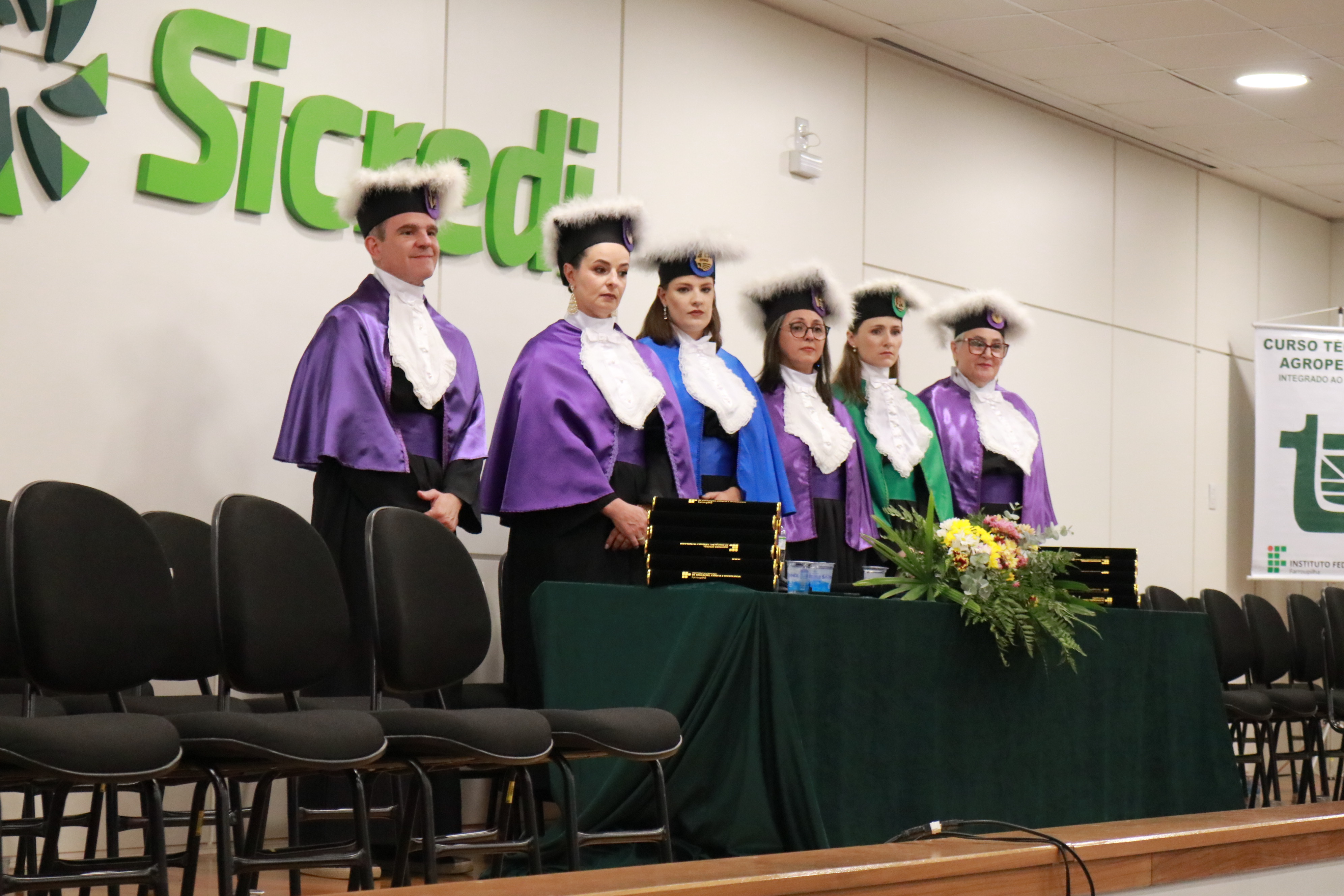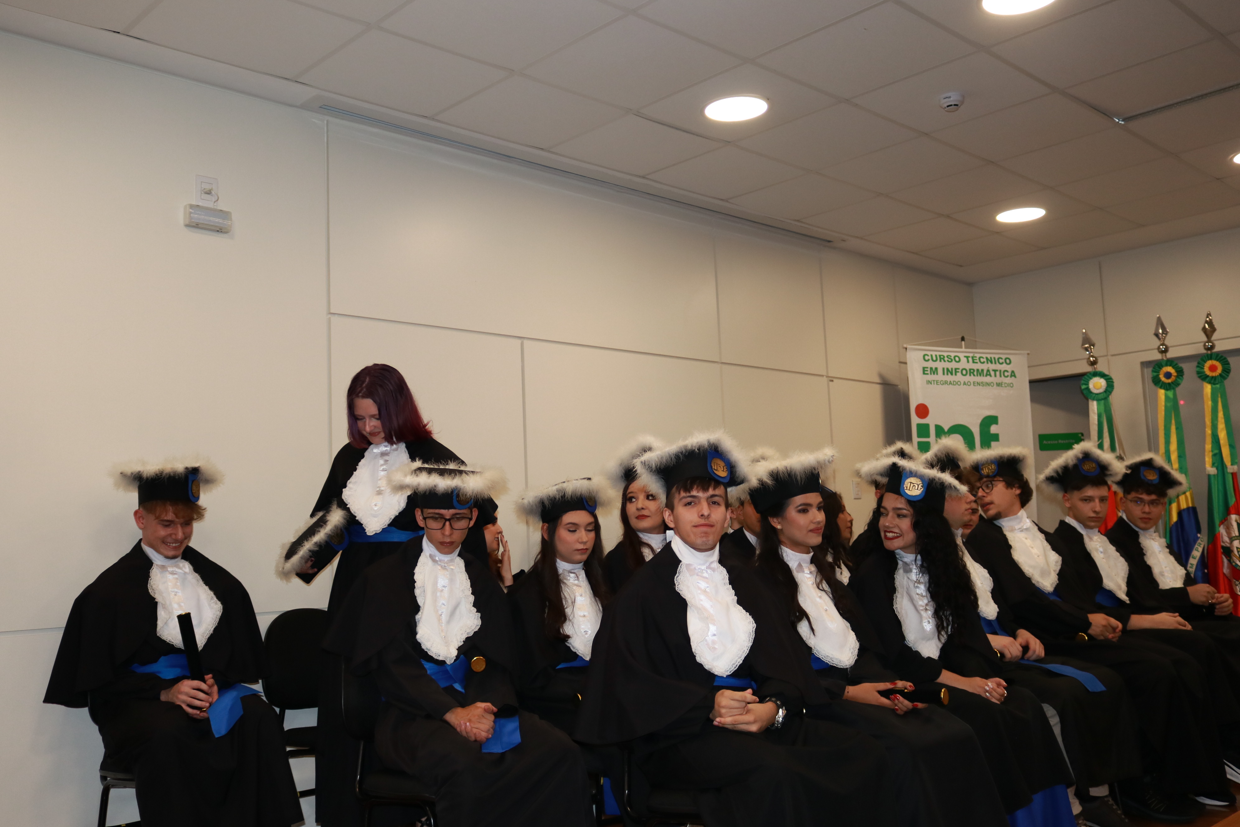 No dia 31, às 19h, foram certificados 44 concluintes, sendo 21 do Técnico em Alimentos e 23 de Informática. A solenidade foi presidida pela Diretora Geral substituta, Téoura Benetti, e contou com a presença da Coordenadora do curso Técnico em Alimentos integrado ao ensino médio, Melissa dos Santos Oliveira; da Paraninfa da 14ª turma, Giovana Kafer e da Patronesse, Débora Piovesan Moraes; do Coordenador do Curso Técnico em Informática integrado ao ensino médio, Paulo Henrique Oliveira; do Paraninfo da 14ª Turma, Dirceu Dirk e do Patrono, Uianes Biondo, que também representou a SME e o poder executivo, bem como osprofessores homenageados, servidores e familiares dos concluintes.
