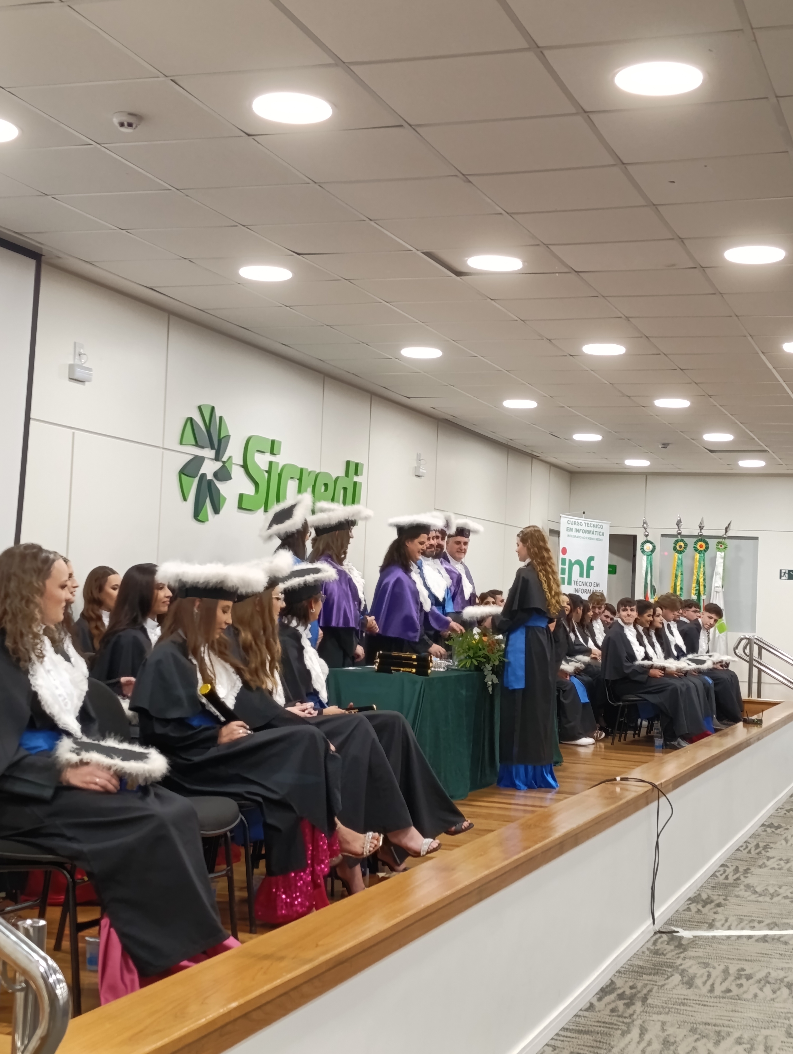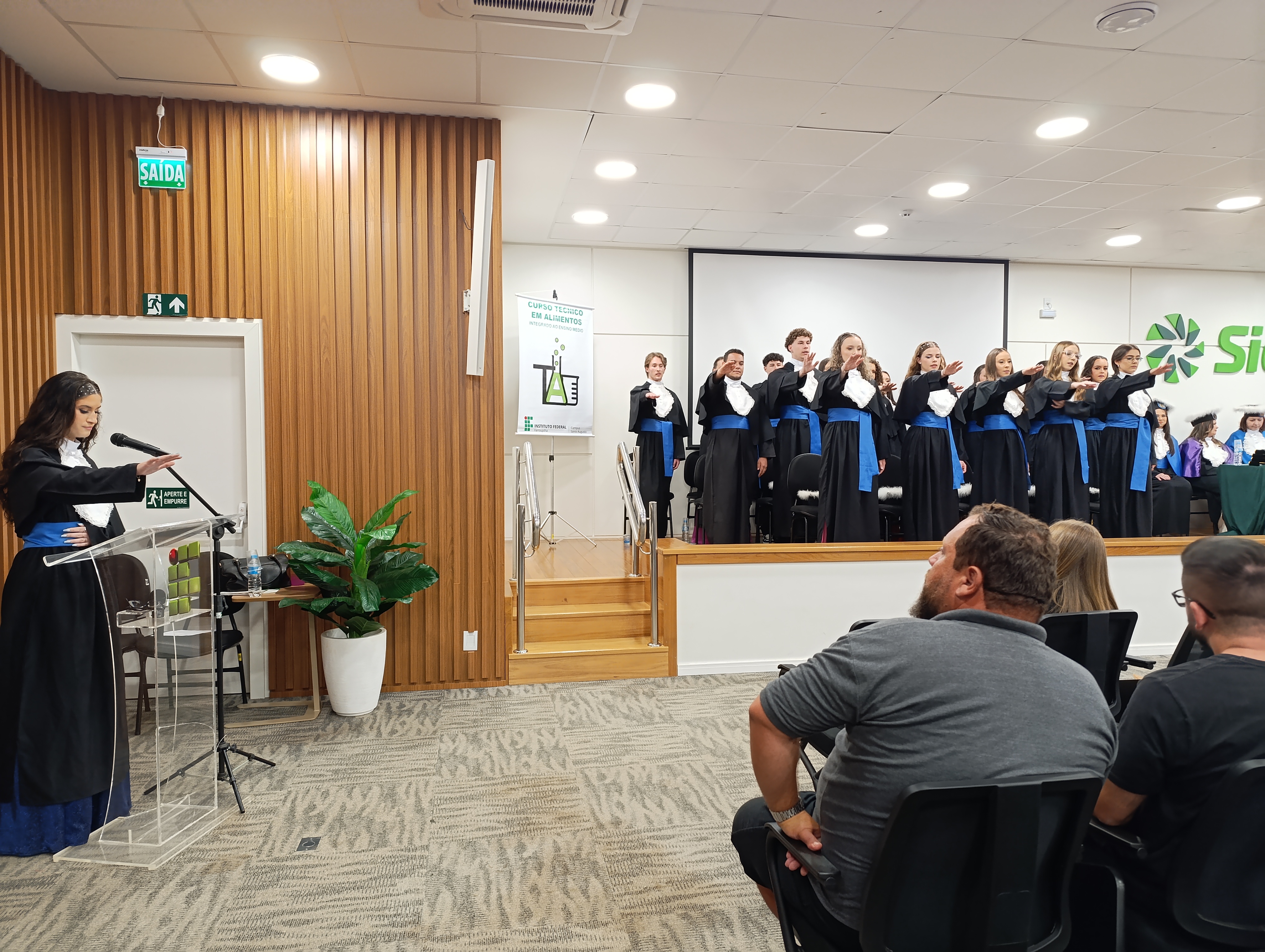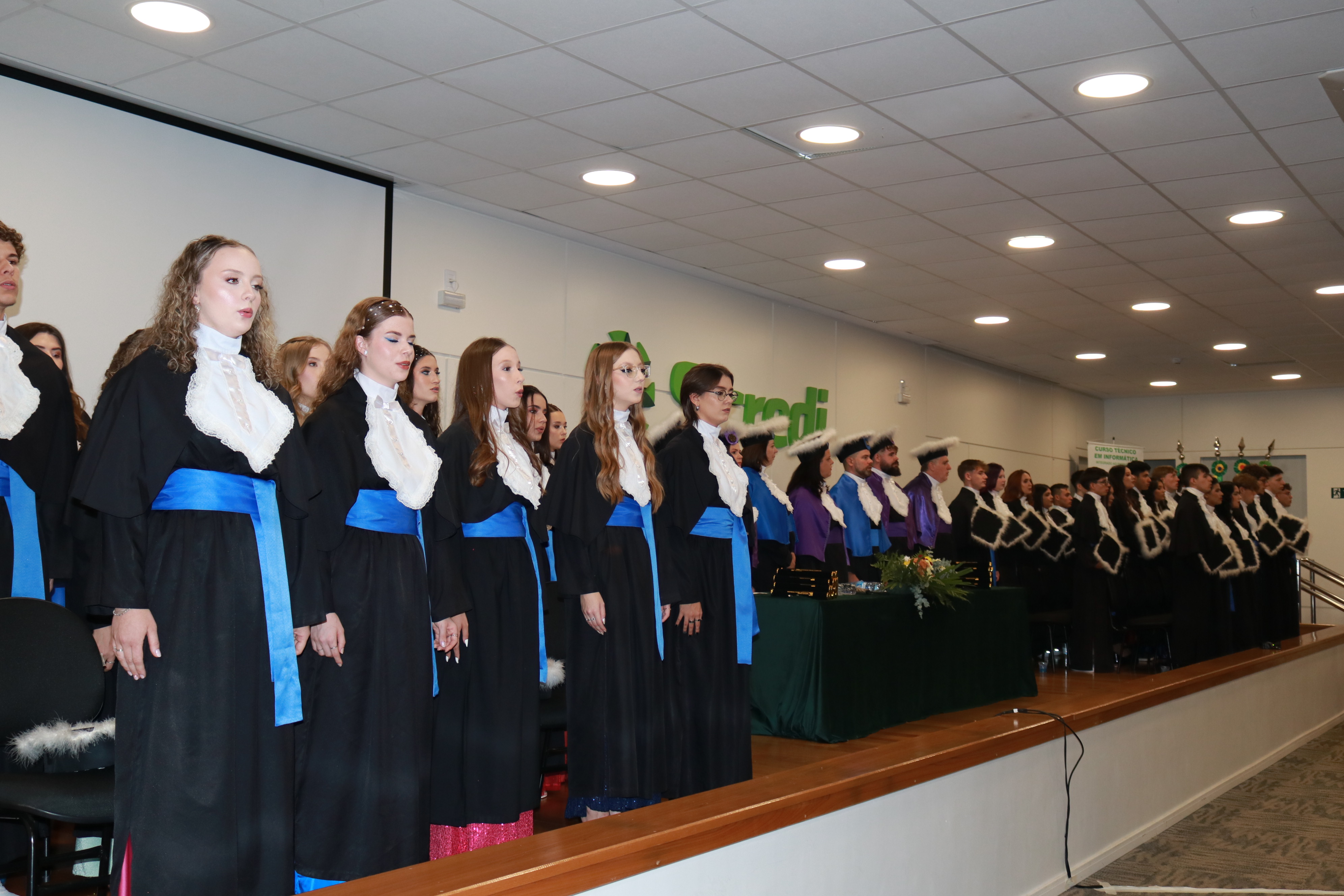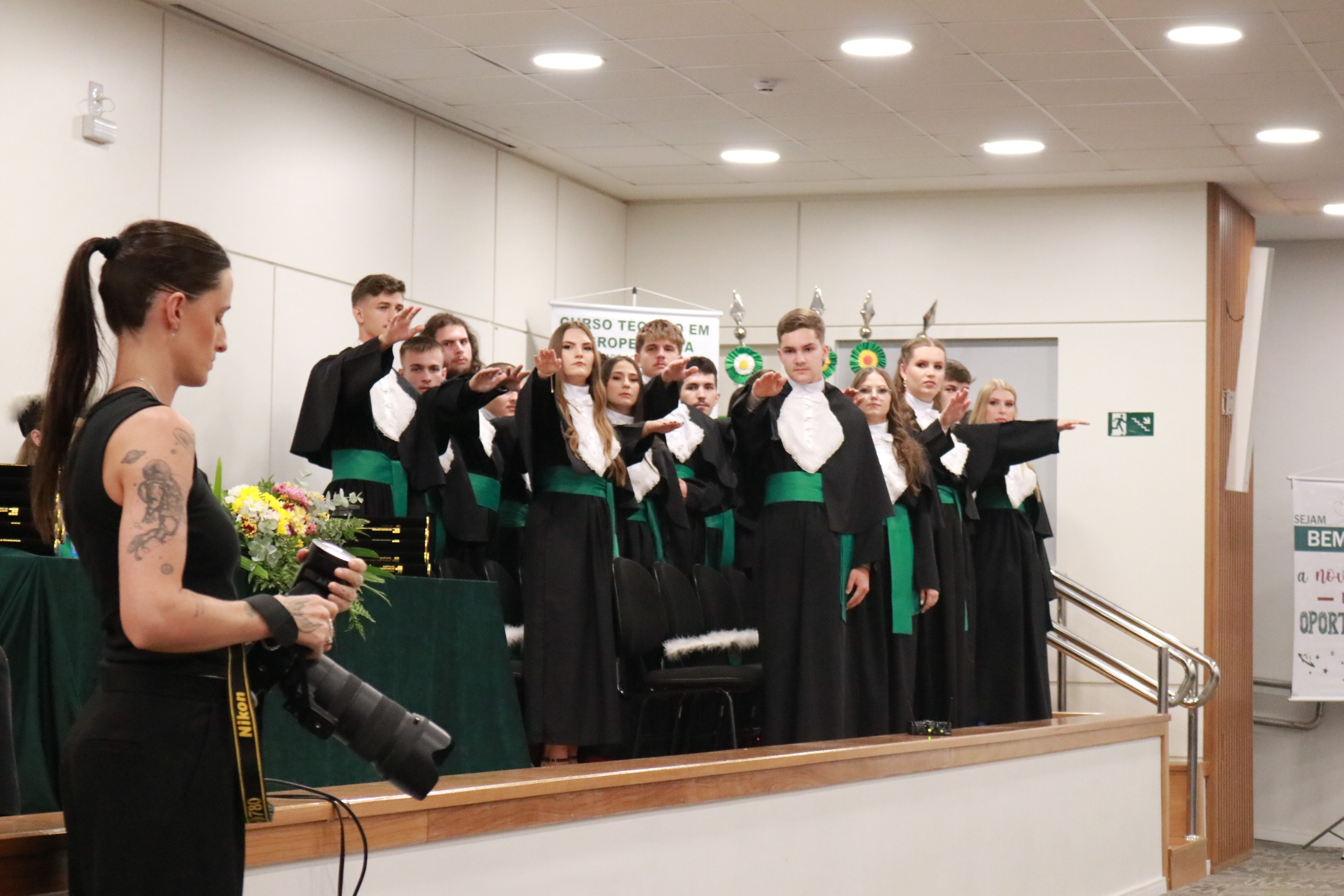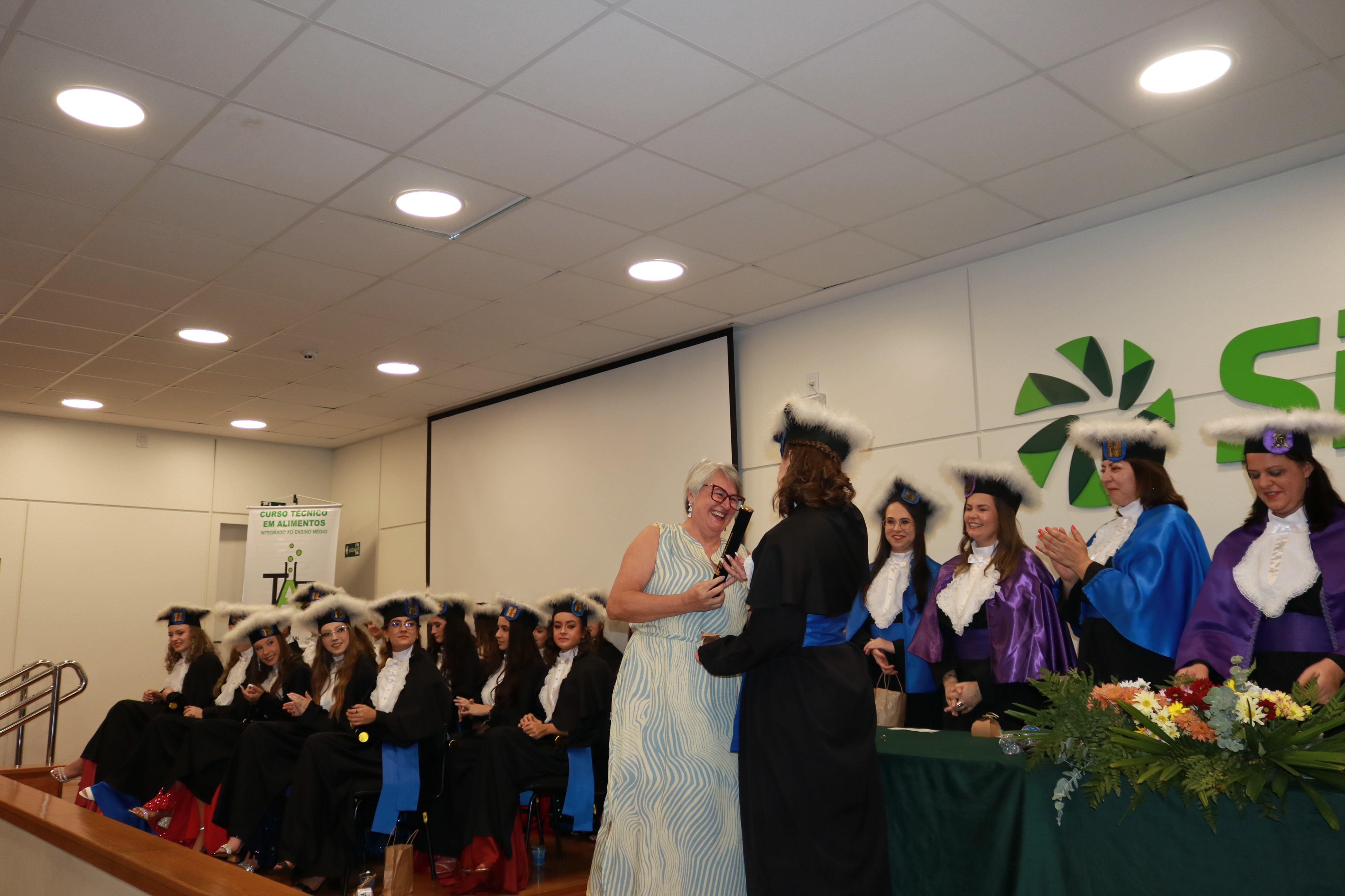 No dia 31, às 19h, foram certificados 44 concluintes, sendo 21 do Técnico em Alimentos e 23 de Informática. A solenidade foi presidida pela Diretora Geral substituta, Téoura Benetti, e contou com a presença da Coordenadora do curso Técnico em Alimentos integrado ao ensino médio, Melissa dos Santos Oliveira; da Paraninfa da 14ª turma, Giovana Kafer e da Patronesse, Débora Piovesan Moraes; do Coordenador do Curso Técnico em Informática integrado ao ensino médio, Paulo Henrique Oliveira; do Paraninfo da 14ª Turma, Dirceu Dirk e do Patrono, Uianes Biondo, que também representou a SME e o poder executivo, bem como osprofessores homenageados, servidores e familiares dos concluintes.