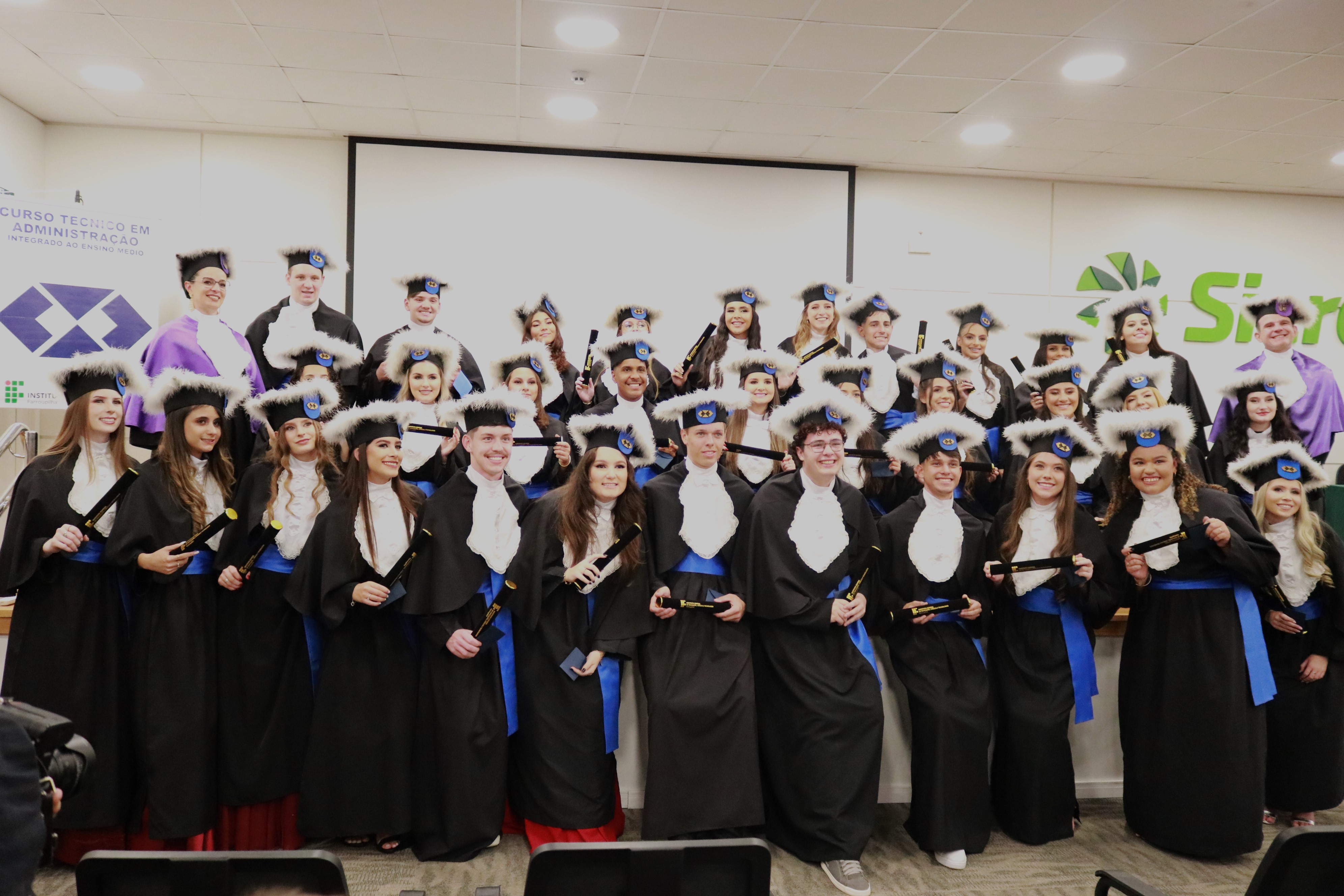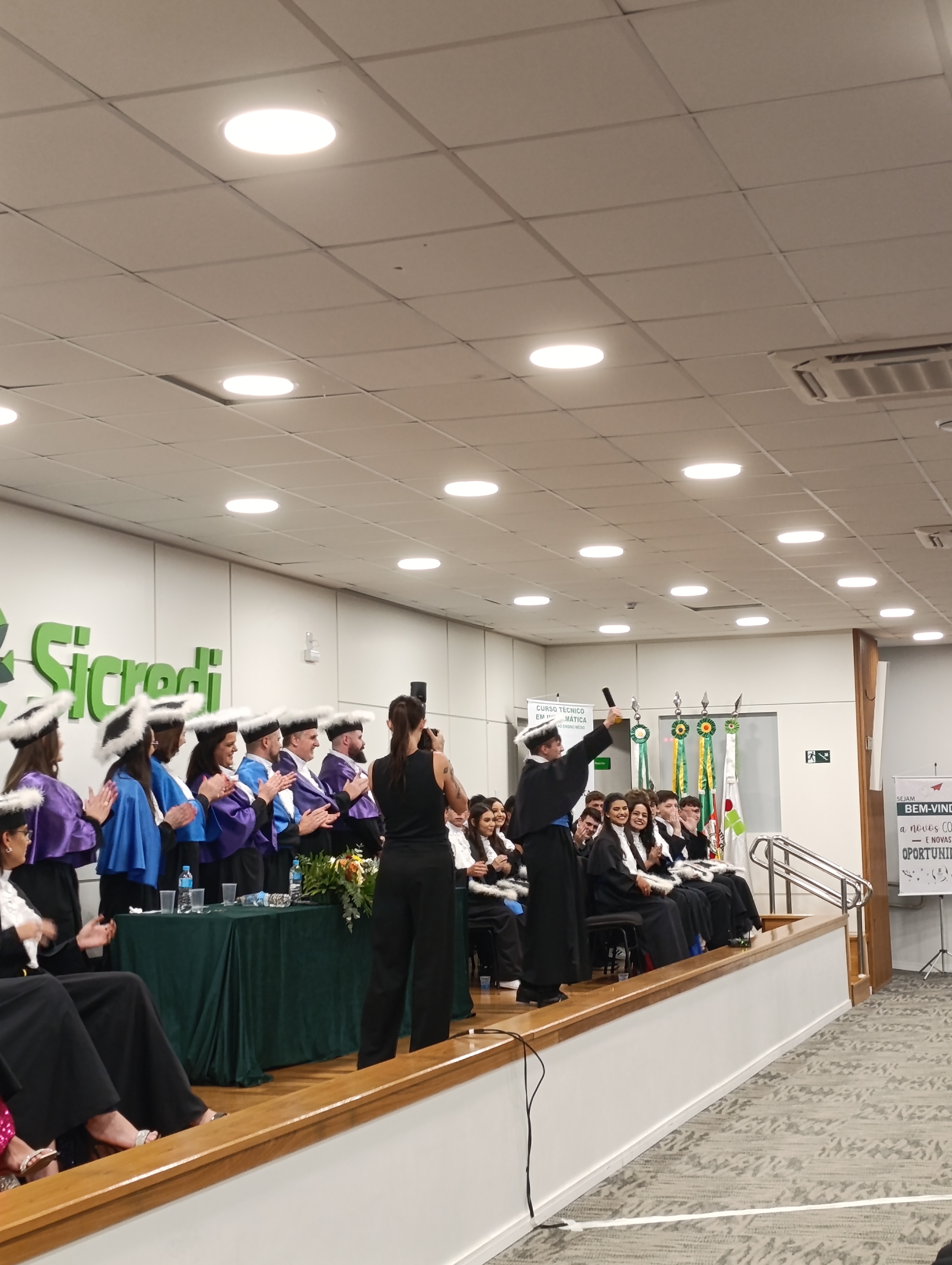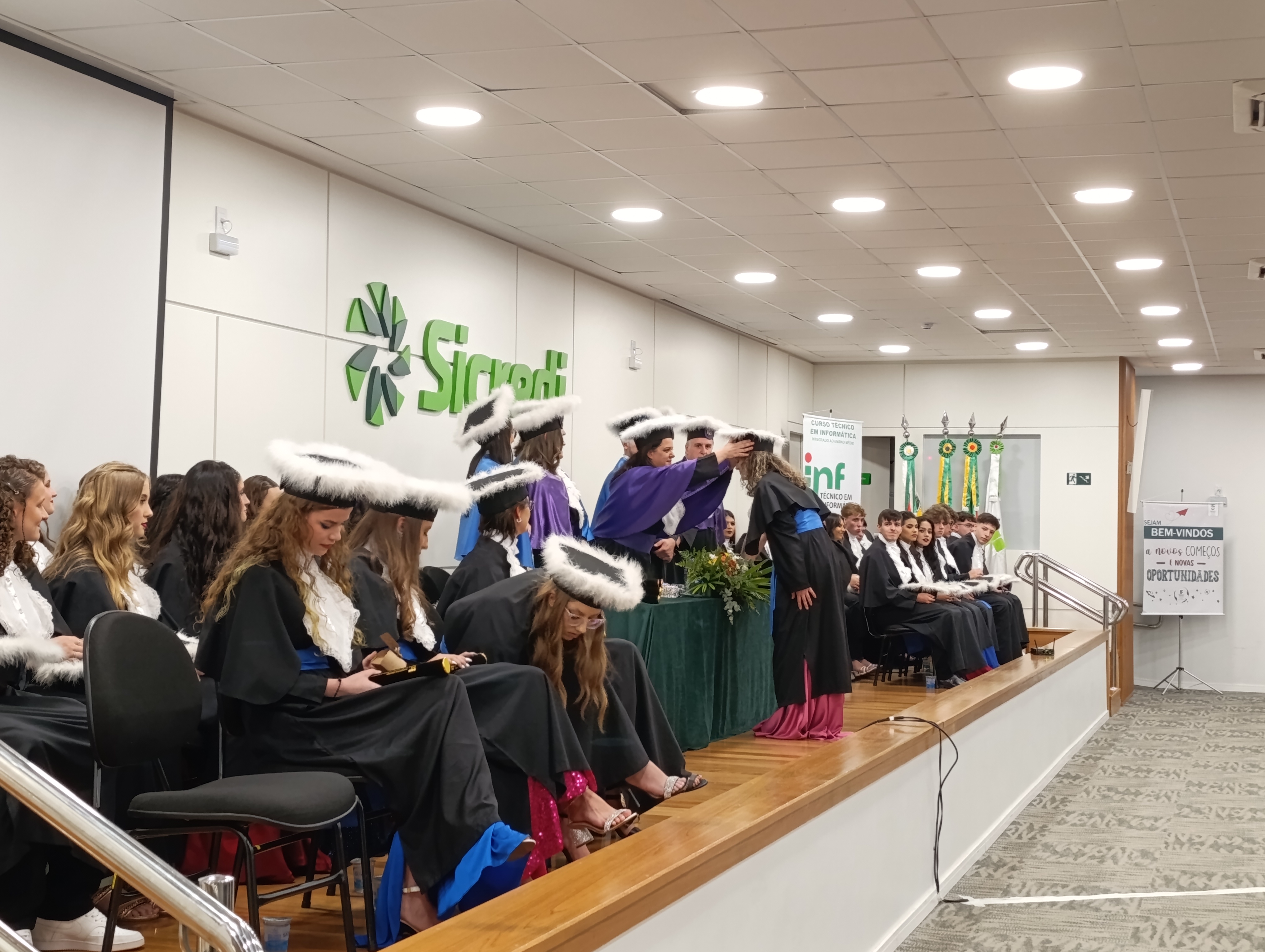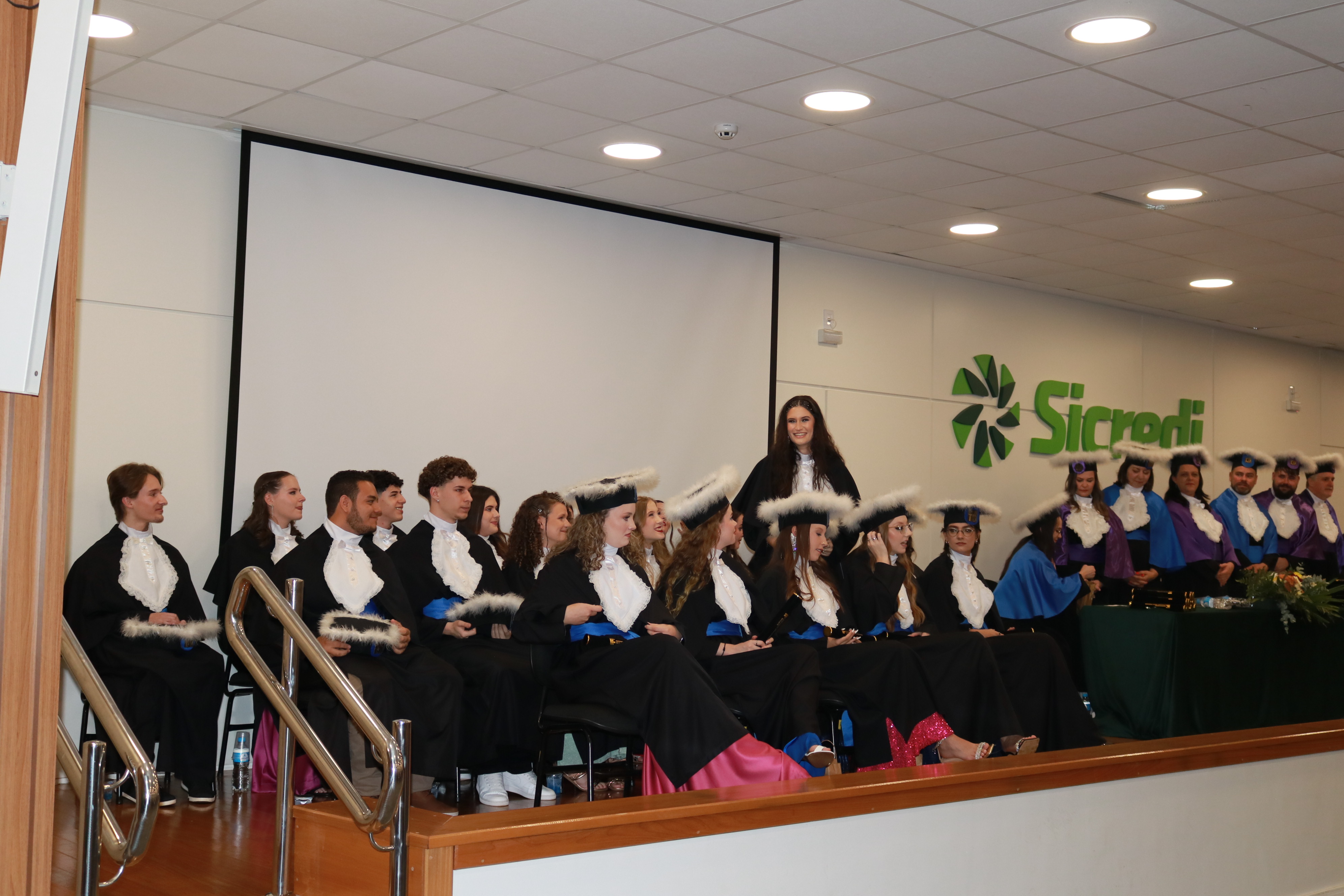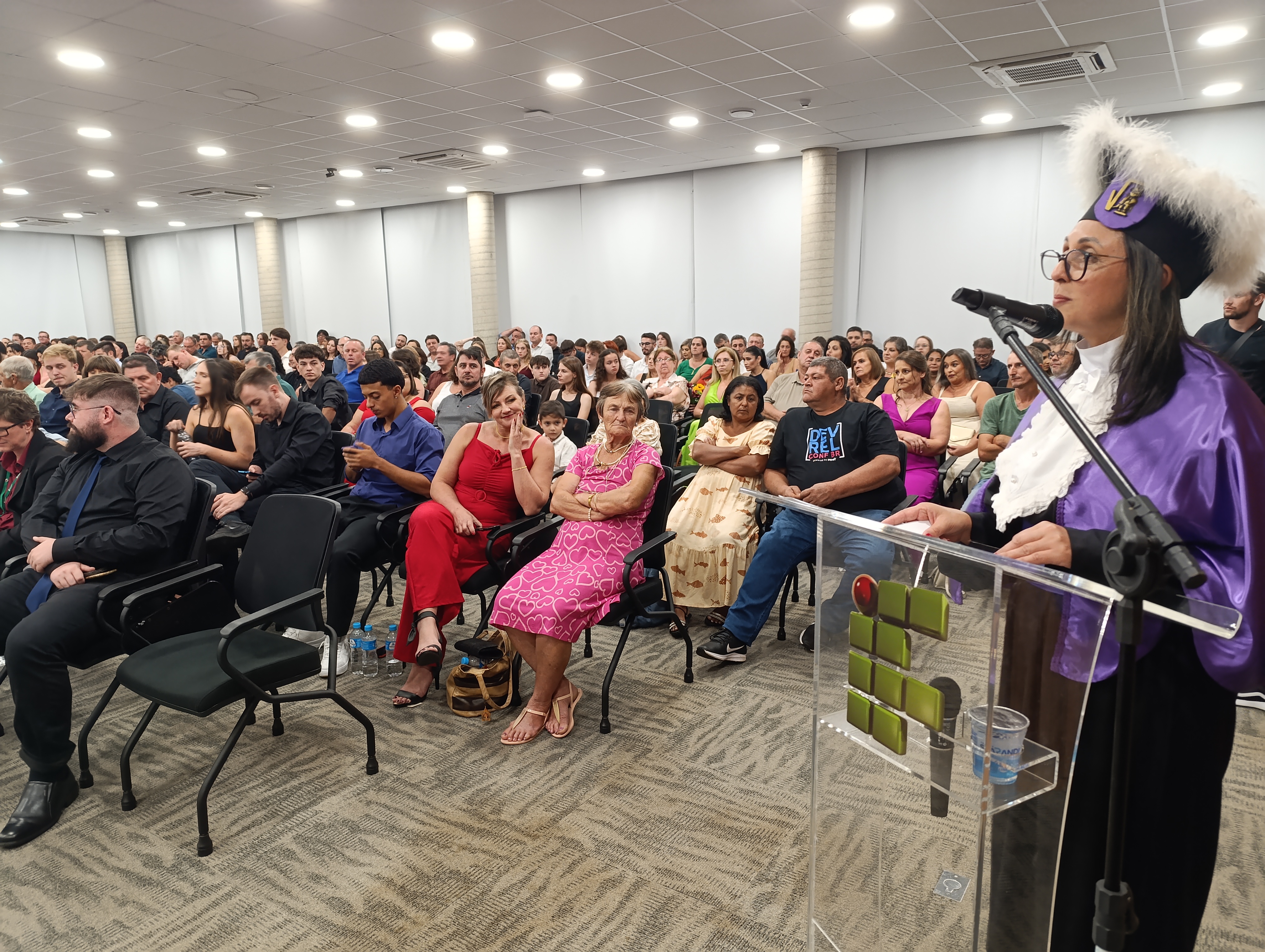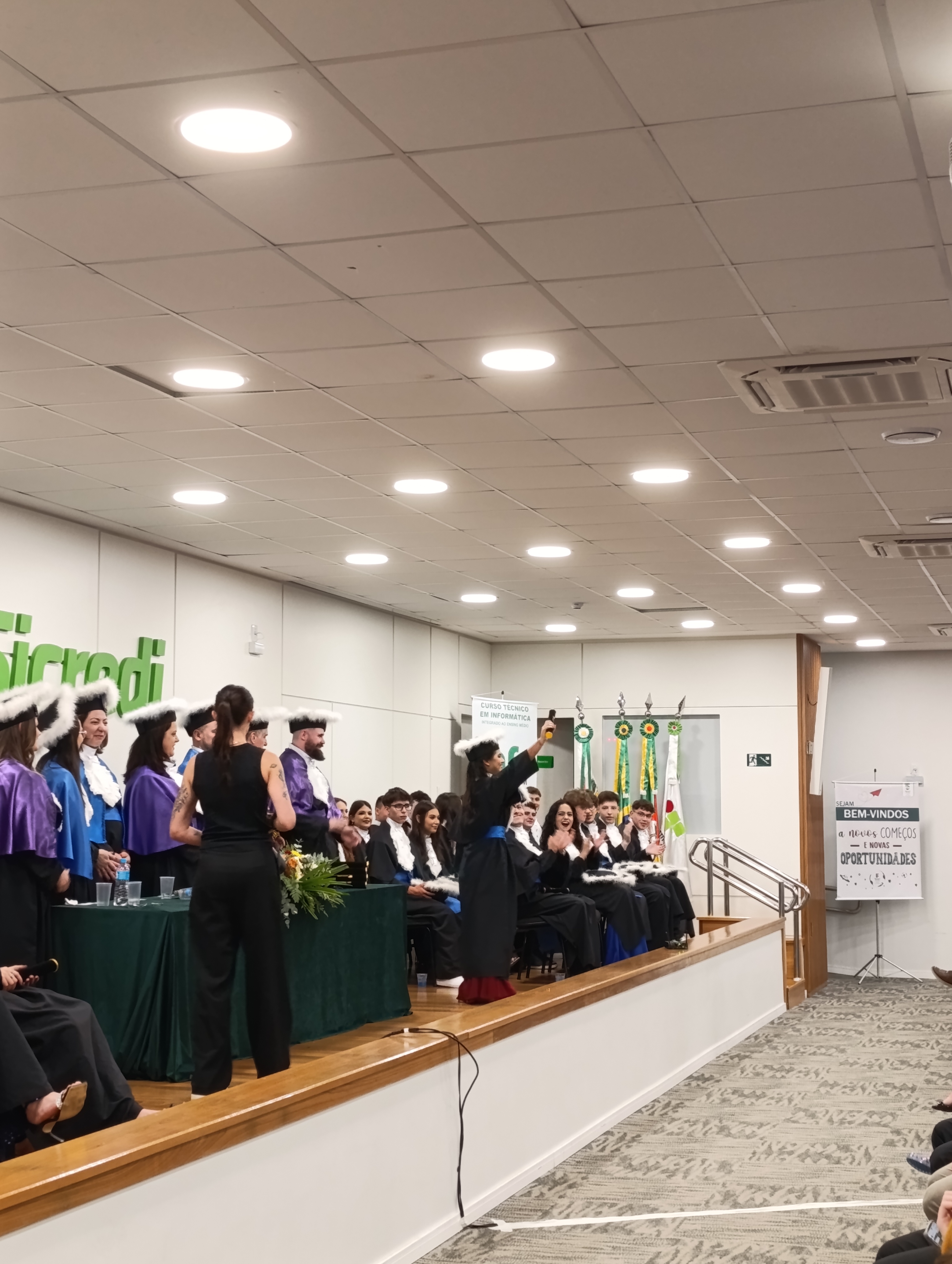 No dia 31, às 19h, foram certificados 44 concluintes, sendo 21 do Técnico em Alimentos e 23 de Informática. A solenidade foi presidida pela Diretora Geral substituta, Téoura Benetti, e contou com a presença da Coordenadora do curso Técnico em Alimentos integrado ao ensino médio, Melissa dos Santos Oliveira; da Paraninfa da 14ª turma, Giovana Kafer e da Patronesse, Débora Piovesan Moraes; do Coordenador do Curso Técnico em Informática integrado ao ensino médio, Paulo Henrique Oliveira; do Paraninfo da 14ª Turma, Dirceu Dirk e do Patrono, Uianes Biondo, que também representou a SME e o poder executivo, bem como osprofessores homenageados, servidores e familiares dos concluintes.