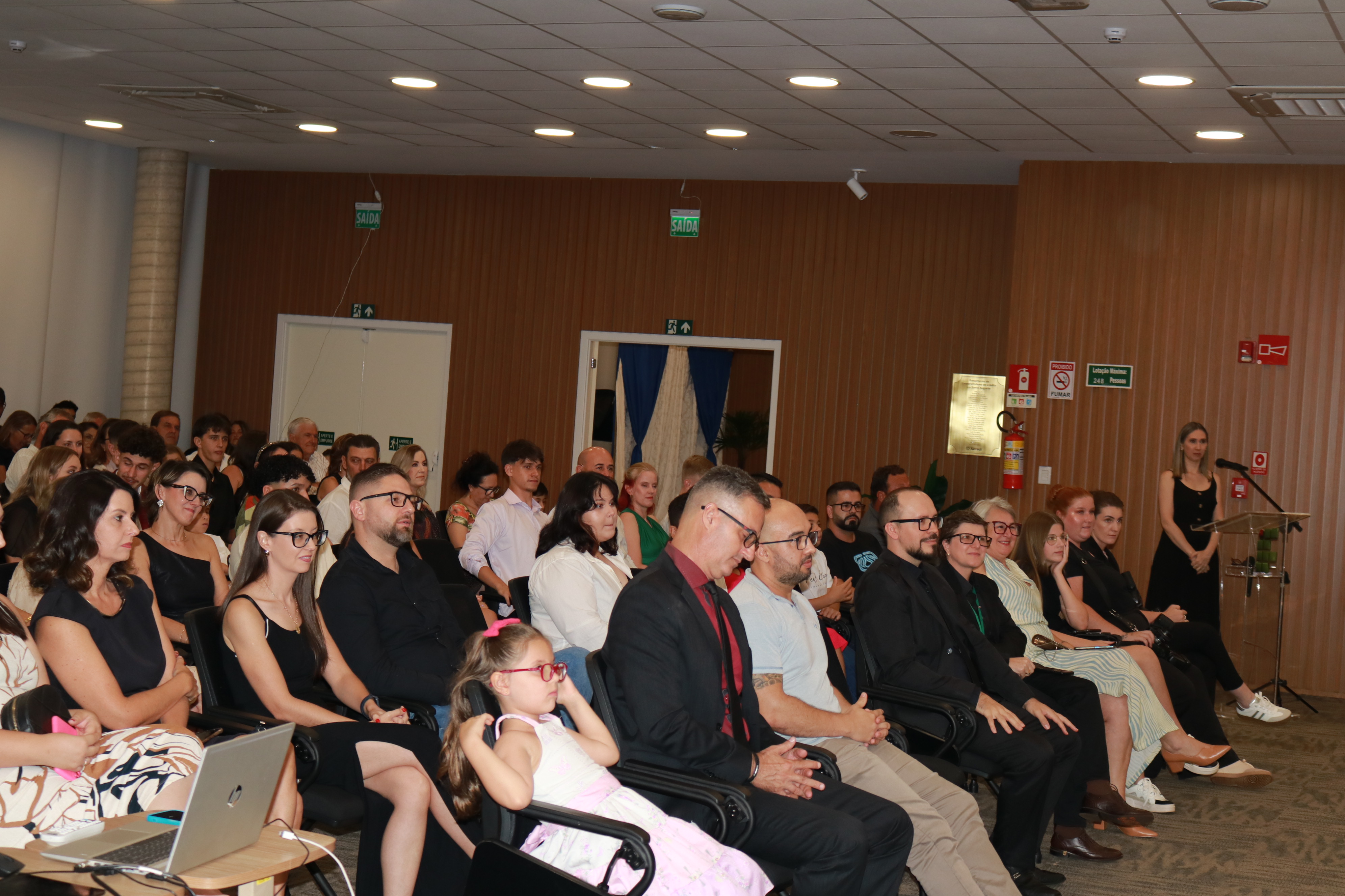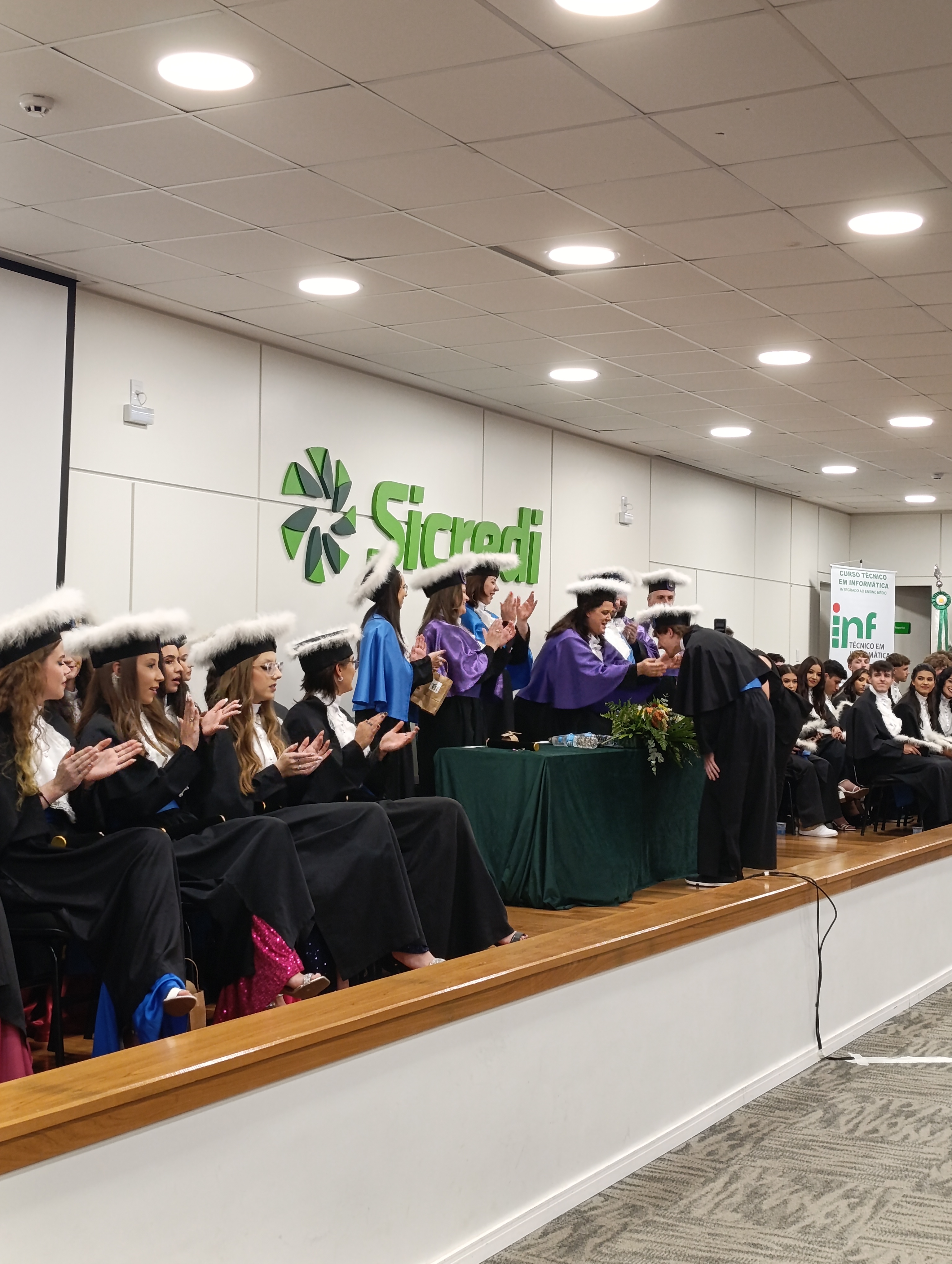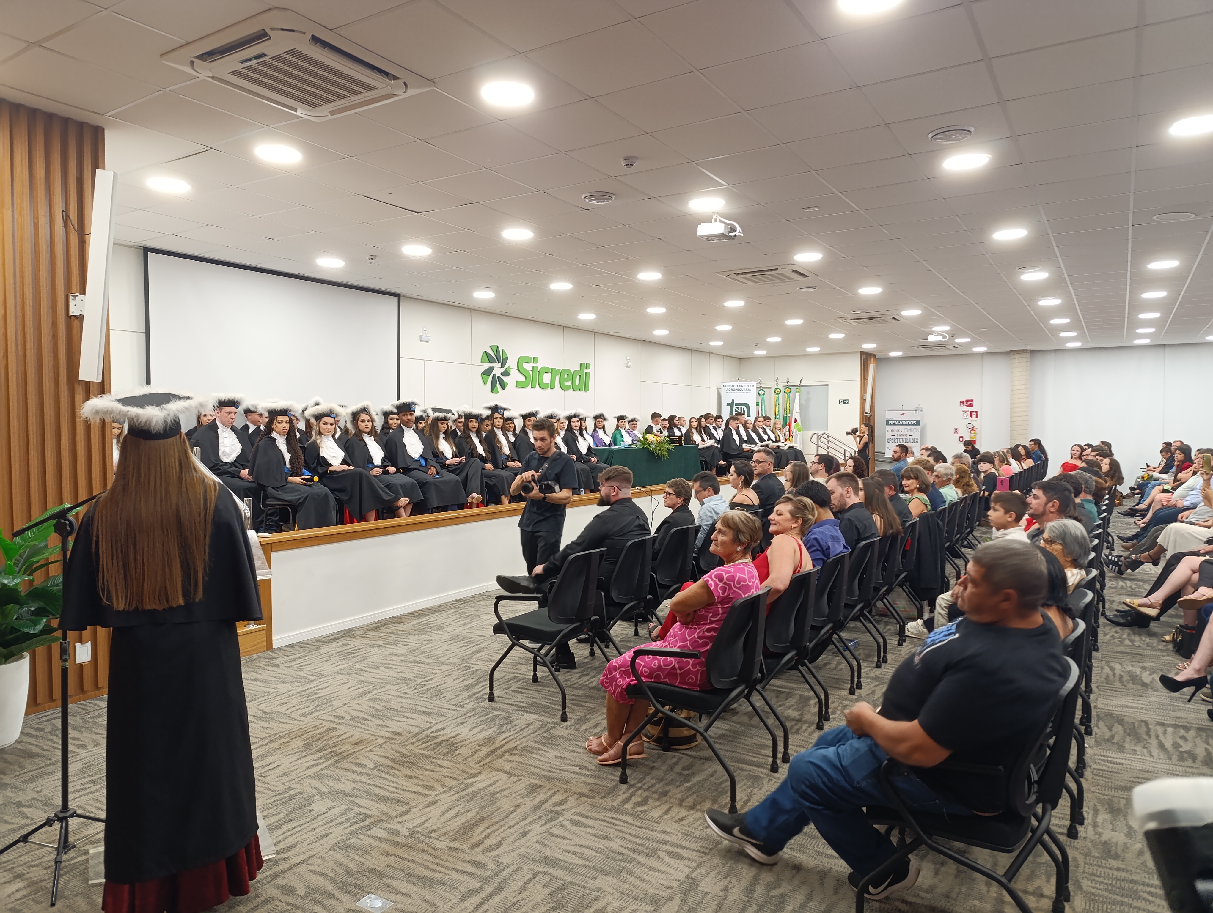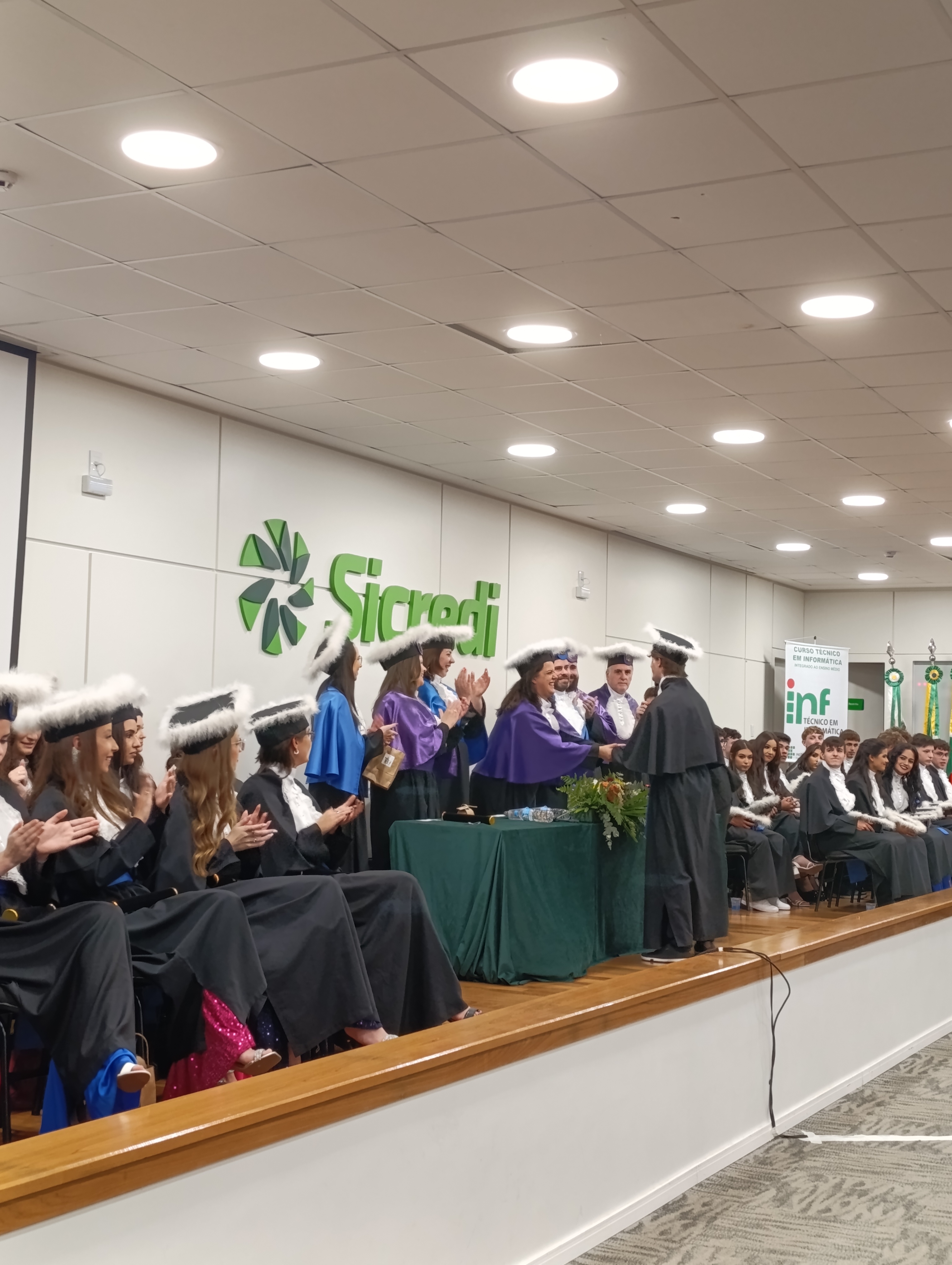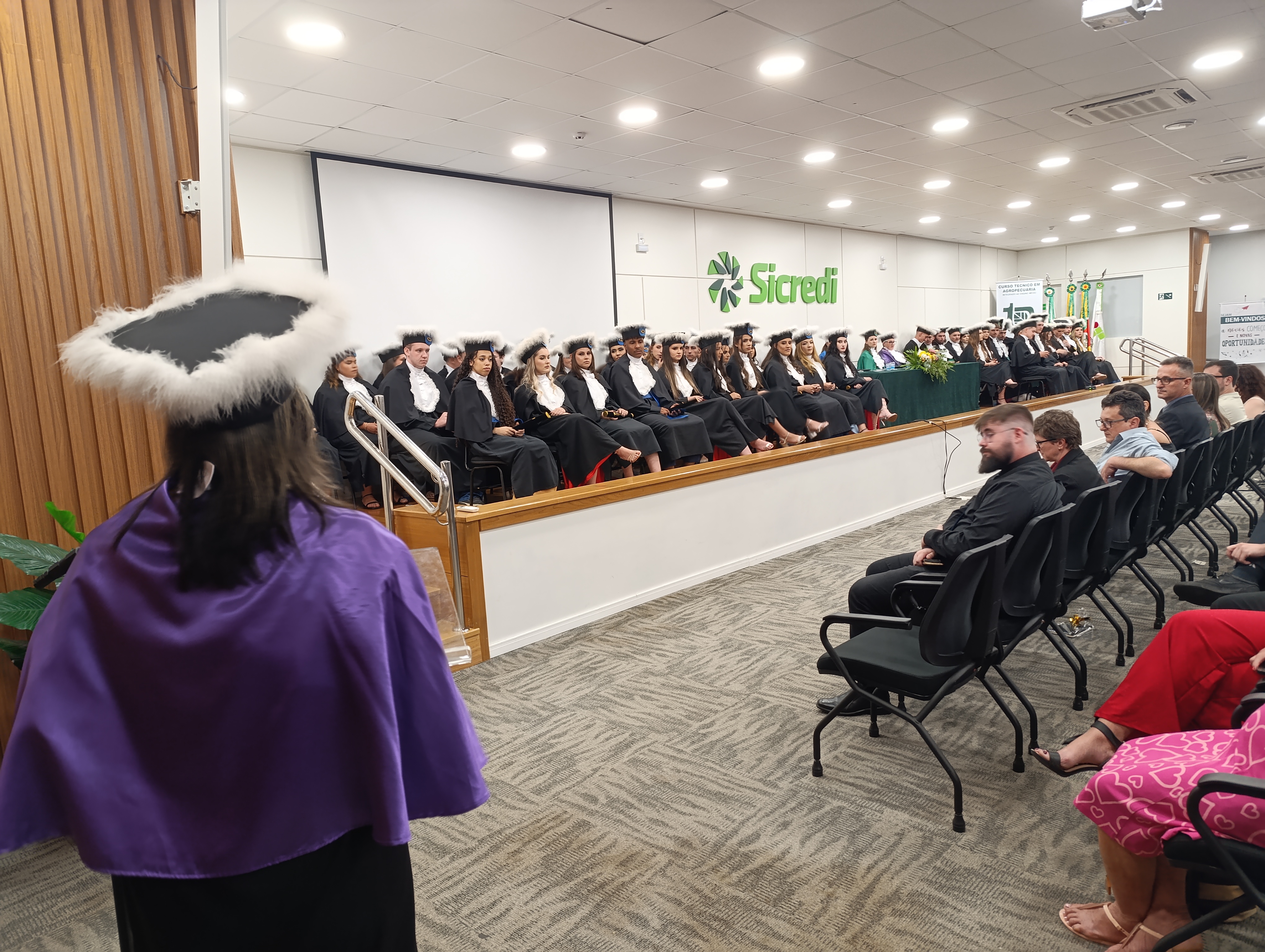 No dia 31, às 19h, foram certificados 44 concluintes, sendo 21 do Técnico em Alimentos e 23 de Informática. A solenidade foi presidida pela Diretora Geral substituta, Téoura Benetti, e contou com a presença da Coordenadora do curso Técnico em Alimentos integrado ao ensino médio, Melissa dos Santos Oliveira; da Paraninfa da 14ª turma, Giovana Kafer e da Patronesse, Débora Piovesan Moraes; do Coordenador do Curso Técnico em Informática integrado ao ensino médio, Paulo Henrique Oliveira; do Paraninfo da 14ª Turma, Dirceu Dirk e do Patrono, Uianes Biondo, que também representou a SME e o poder executivo, bem como osprofessores homenageados, servidores e familiares dos concluintes.