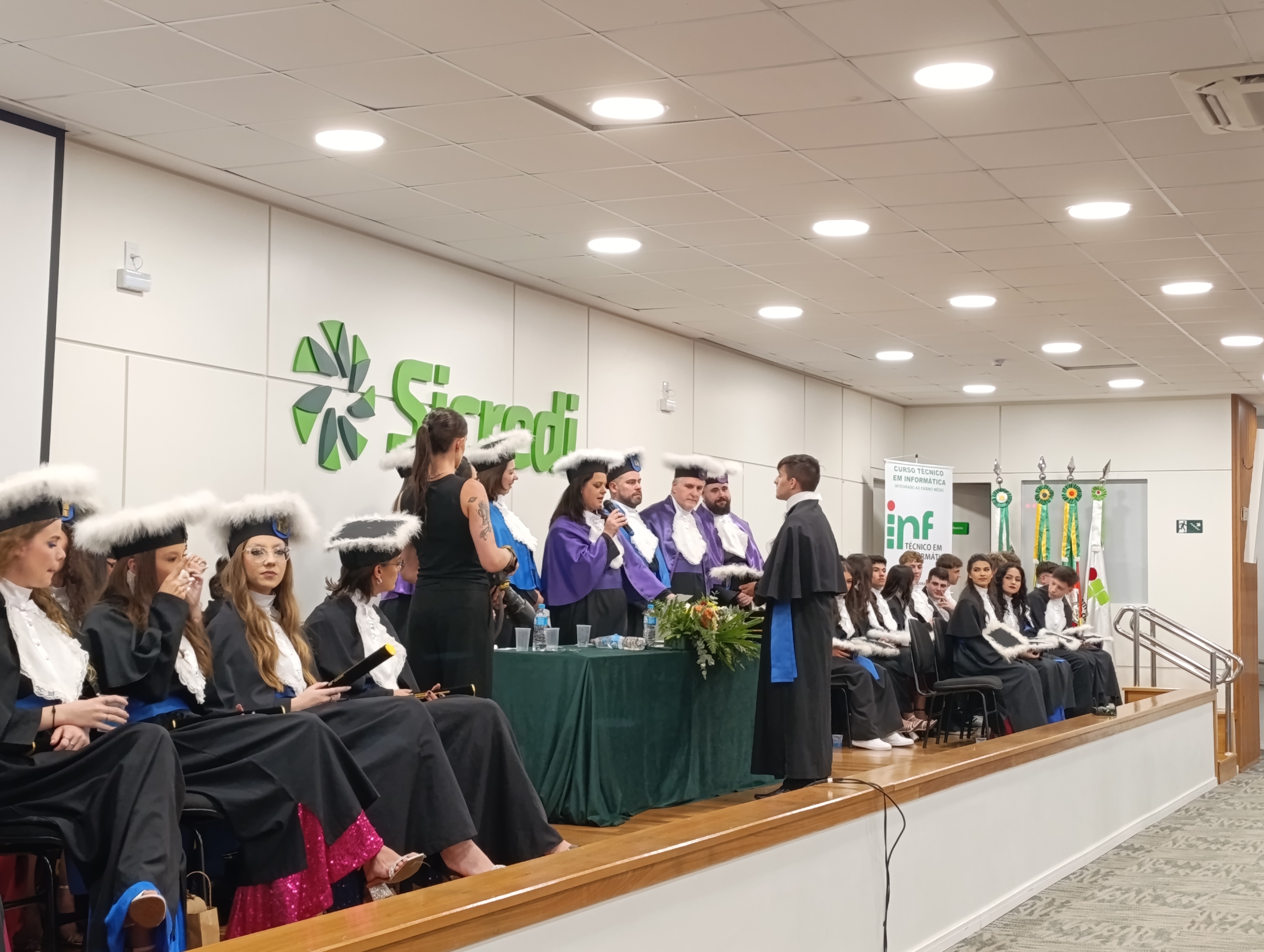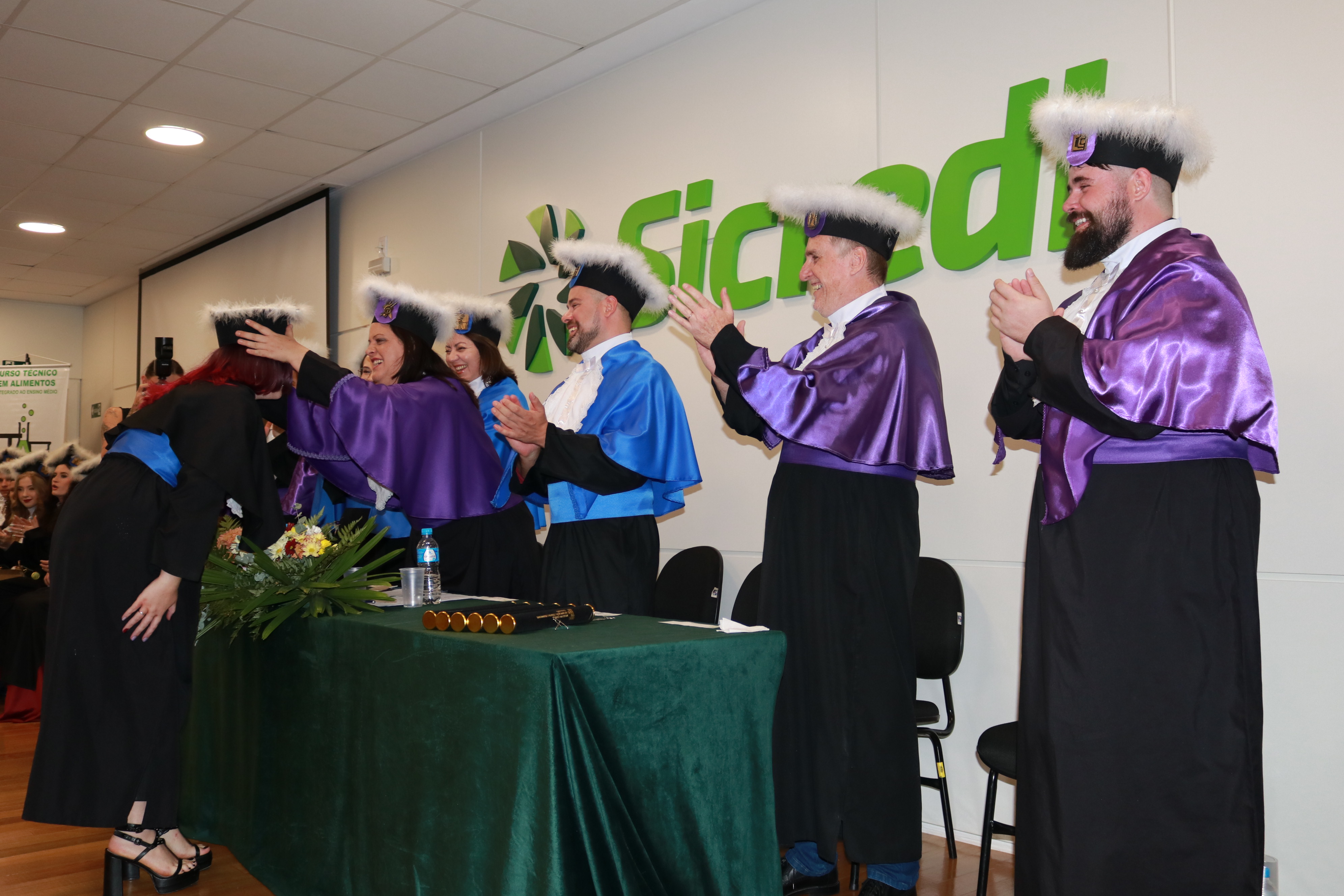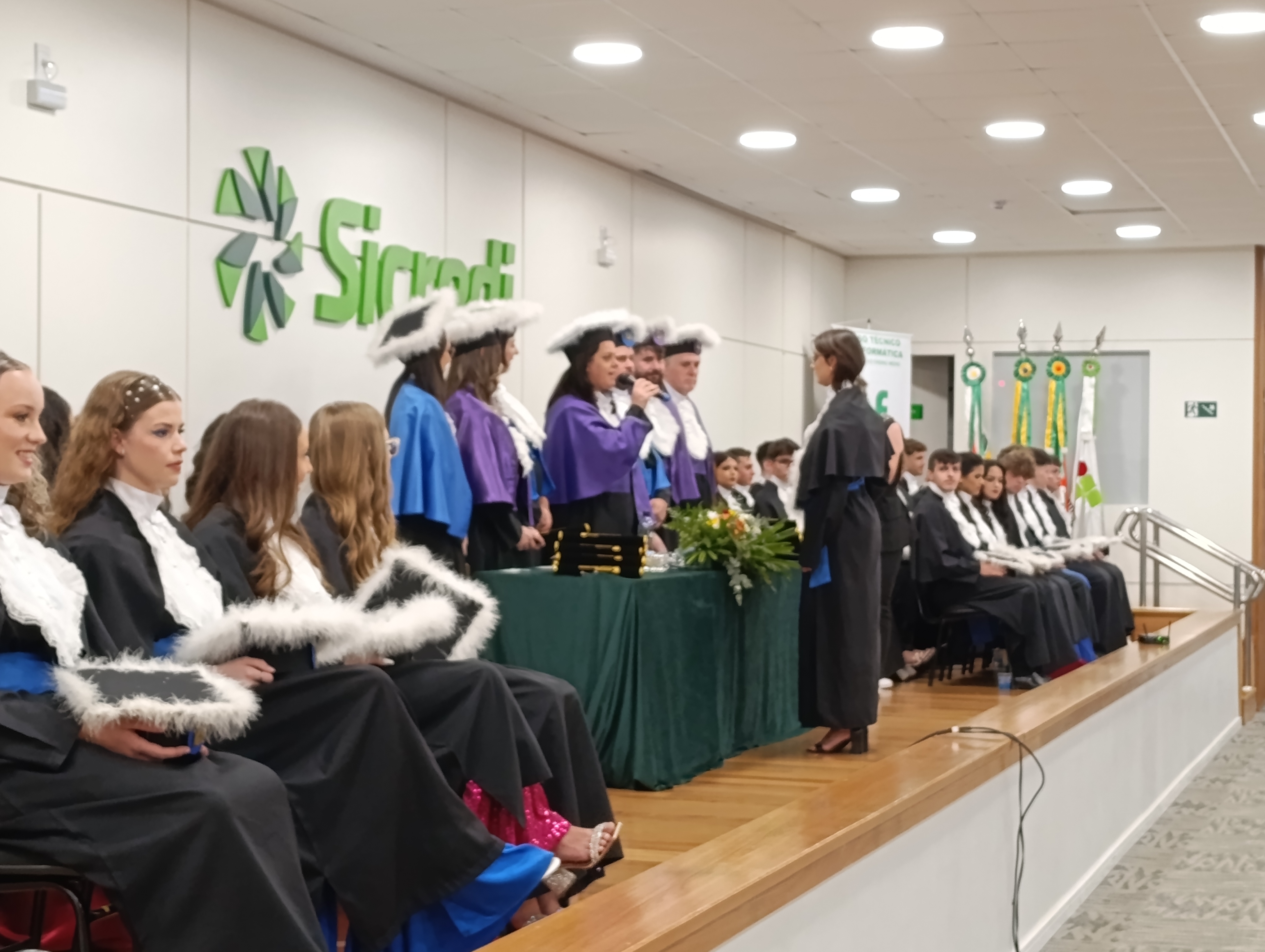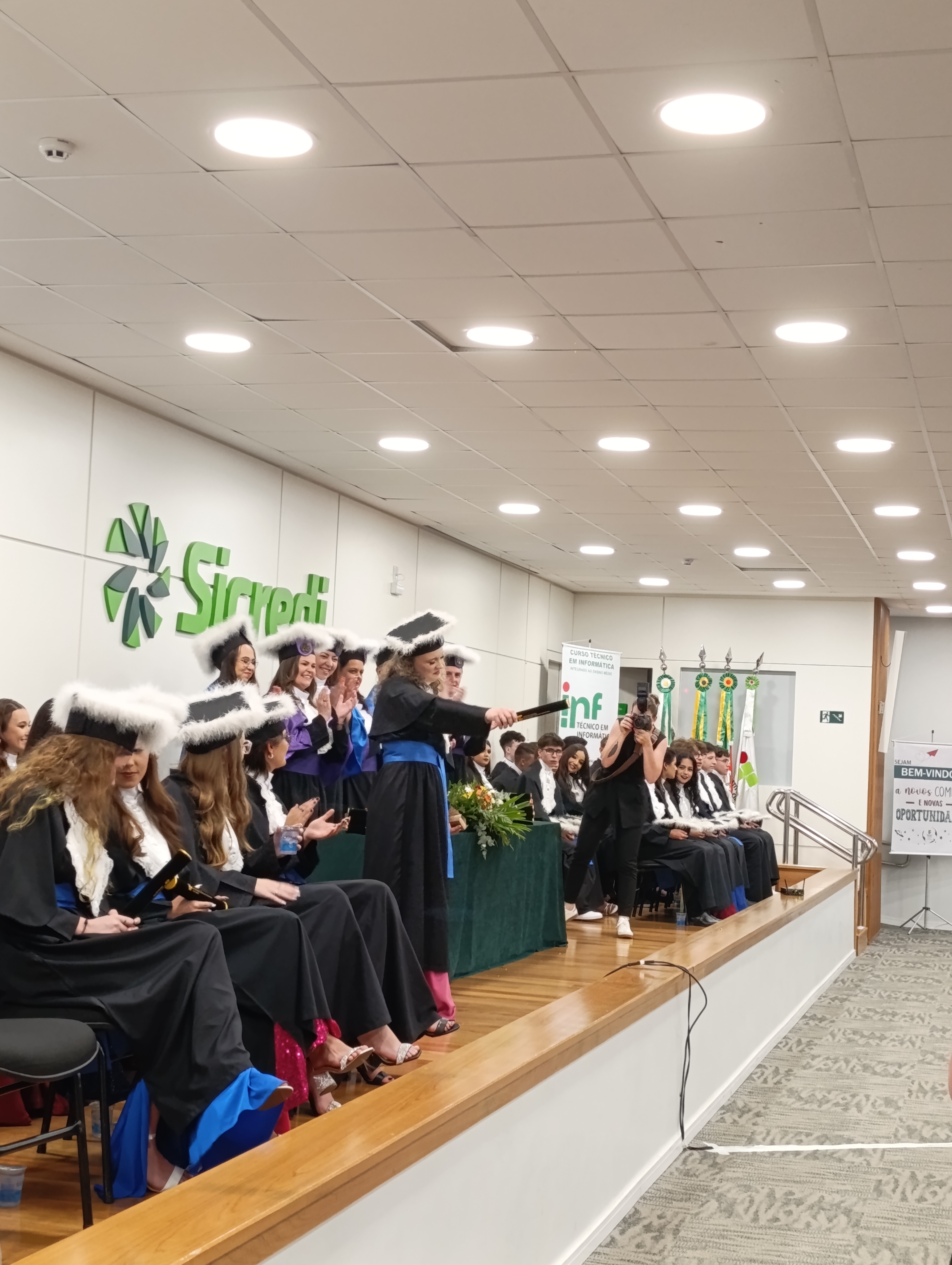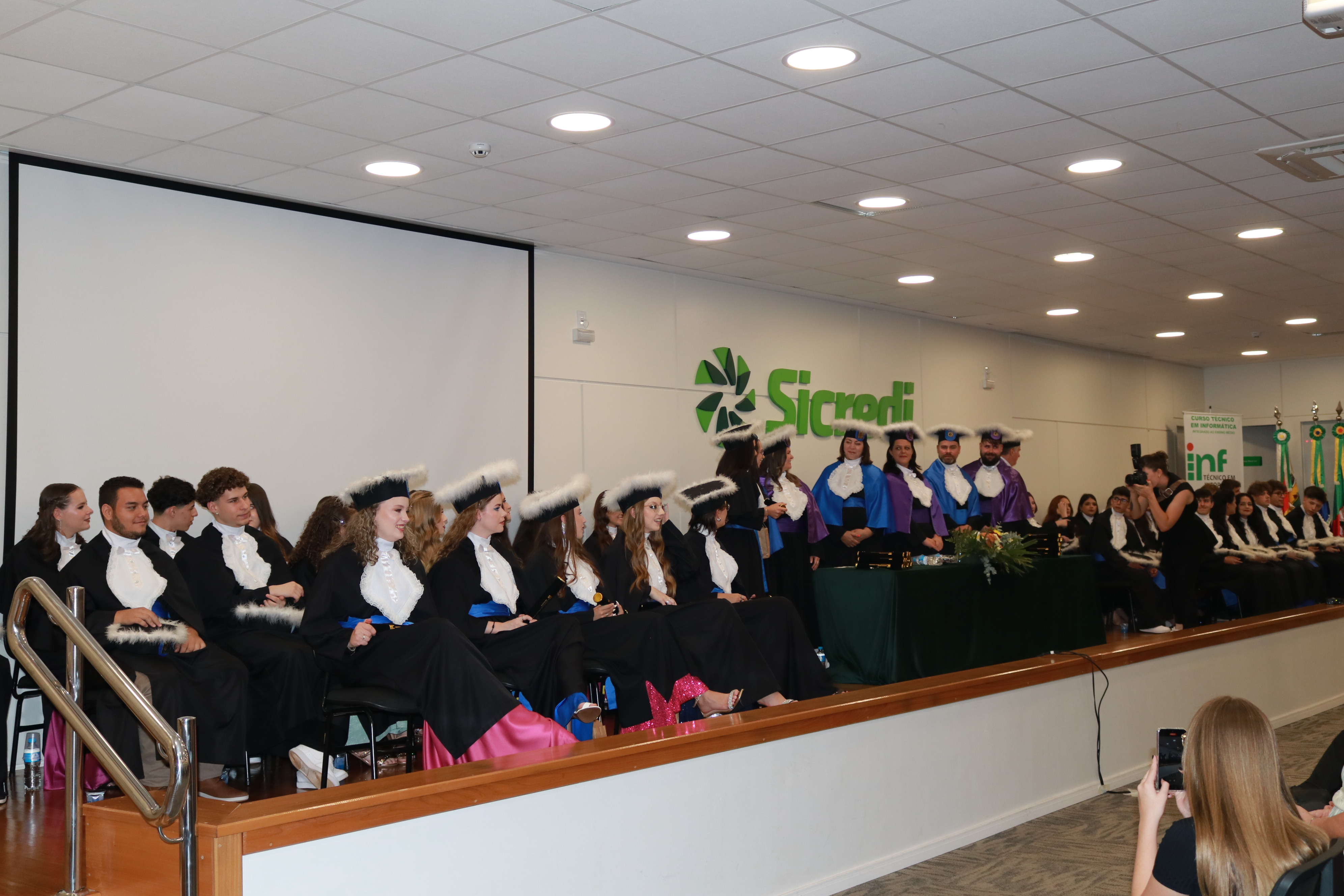 No dia 31, às 19h, foram certificados 44 concluintes, sendo 21 do Técnico em Alimentos e 23 de Informática. A solenidade foi presidida pela Diretora Geral substituta, Téoura Benetti, e contou com a presença da Coordenadora do curso Técnico em Alimentos integrado ao ensino médio, Melissa dos Santos Oliveira; da Paraninfa da 14ª turma, Giovana Kafer e da Patronesse, Débora Piovesan Moraes; do Coordenador do Curso Técnico em Informática integrado ao ensino médio, Paulo Henrique Oliveira; do Paraninfo da 14ª Turma, Dirceu Dirk e do Patrono, Uianes Biondo, que também representou a SME e o poder executivo, bem como osprofessores homenageados, servidores e familiares dos concluintes.