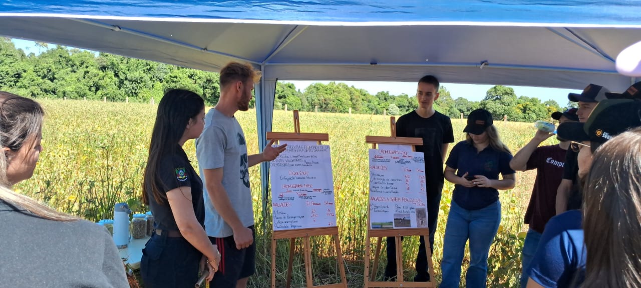 Na oportunidade, foram apresentadas as estações de Desempenho de Cultivares (Luís Fernando Baraldi Porazzi e Martinho José Hoffmann), Toxidez de Alumínio (Alessandra Ströher), Proteína da Soja (Andressa Tolfo Bandeira), Tratamentos de Sementes e Biológicos (Darlan de Lima Dörtelmann), Épocas de Semeadura (Luiz Antônio Mosselin Juliani), Adubação com Micronutrientes (Hernan Elías Stumm) e Integração Lavoura Pecuária – ILP (Joel Ludwig, Maria Eduarda Brair e Amauri Rodrigues do Amaral).