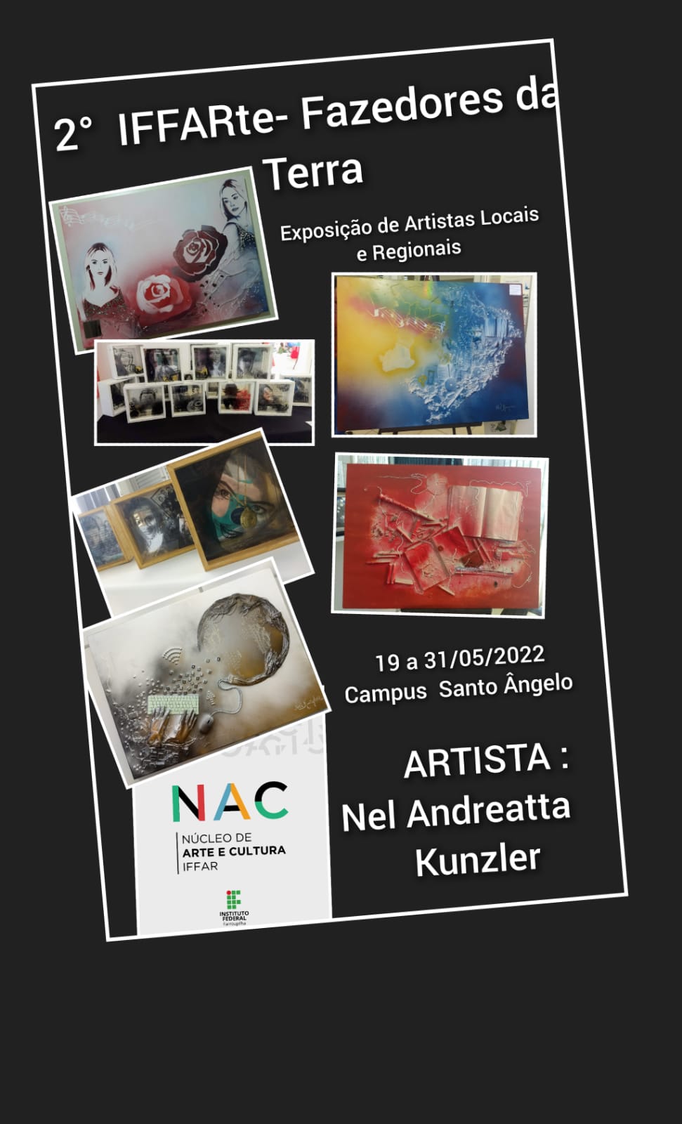 Neste ano de 2022, estará em exposição no Hall de entrada do Prédio Administrativo do IFFar Campus Santo Ângelo, as obras da artista Nel Andreatta Kunzler, cuja temática trata de identidade, autorretrato, história e memória, em linguagens artísticas diversas, como: instalação artística, objeto arte, pinturas, fotografias, entre outras.