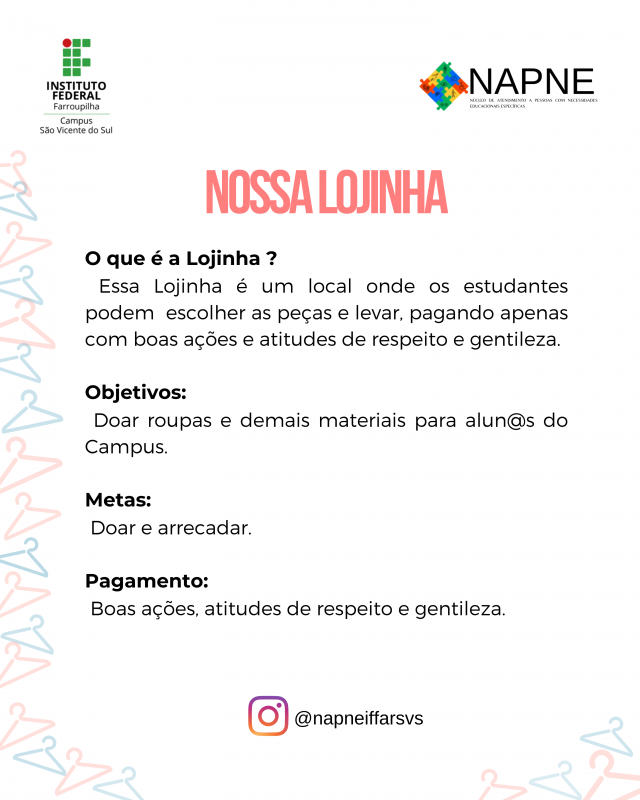 A NOSSA LOJINHA é uma ação social e de inclusão que visa beneficiar estudantes que necessitam de roupas, calçados e/ou materiais de higiene. Está sendo promovida pelo NAPNE e da CAE do Campus SVS.