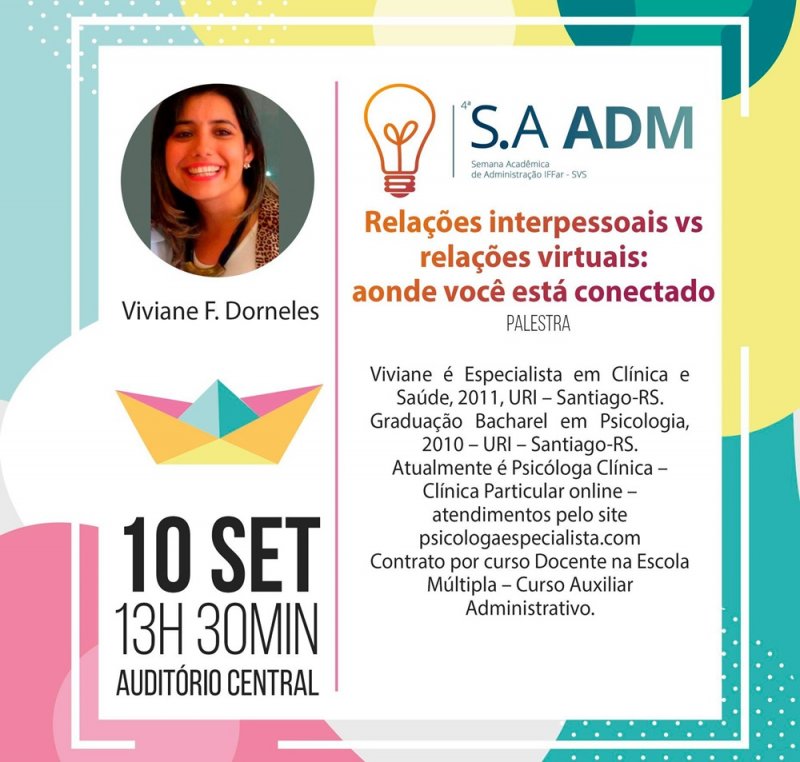 Nos dias 9, 10, 12 e 13 de setembro acontece a 4ª Semana Acadêmica da Administração. O evento mobilizará a comunidade regional no ambiente do IFFar de São Vicente do Sul. Com o tema REinventando em tempos de CRISE, a semana almeja trazer palestrantes, ofertar minicursos e discutir sobre novos negócios já em desenvolvimento em nossa região.
