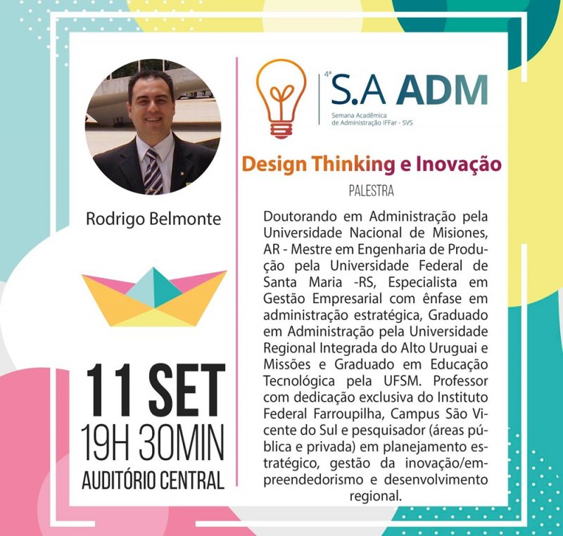 Nos dias 9, 10, 12 e 13 de setembro acontece a 4ª Semana Acadêmica da Administração. O evento mobilizará a comunidade regional no ambiente do IFFar de São Vicente do Sul. Com o tema REinventando em tempos de CRISE, a semana almeja trazer palestrantes, ofertar minicursos e discutir sobre novos negócios já em desenvolvimento em nossa região.