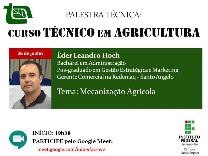 Hoje, às 19h30min teremos a Palestra Técnica: Mecanização Agrícola com Eder Leandro Hoch - Gerente Comercial da Redemaq. Eder é Administrador e Pós Graduado em Gestão Estratégica e de Marketing.