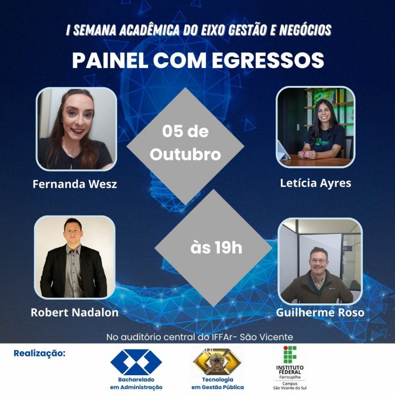 De 3 a 5 de outubro, ocorre, no Campus São Vicente do Sul, a 1º edição da Semana Acadêmica do Eixo de Gestão e Negócios, que envolve os cursos de Bacharelado em Administração e Tecnologia em Gestão Pública. O evento objetiva aproximar acadêmicos e acadêmicas do mundo do trabalho e refletir sobre as perspectivas e os desafios desses profissionais para o futuro.