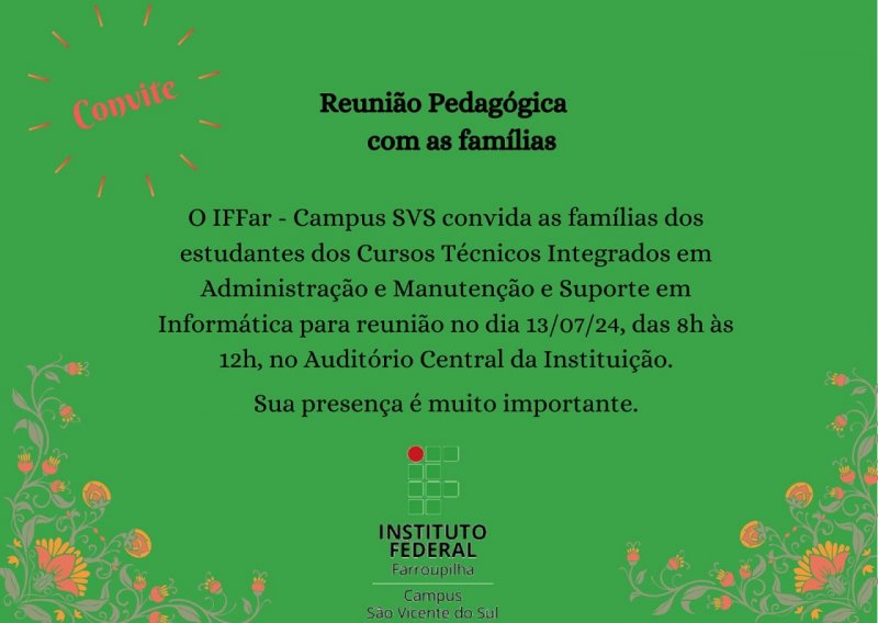 A Direção de Ensino do Instituto Federal Farroupilha - Campus São Vicente do Sul convida pais, mães e/ou responsáveis dos(as) alunos(as) dos Cursos Técnicos Integrados em Administração e Manutenção e Suporte em Informática para Reunião Pedagógica.