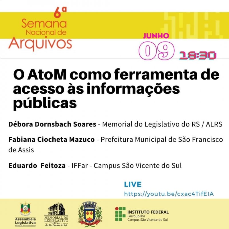A palestra “O AtoM como ferramenta de acesso às instituições públicas’ ocorrerá no dia 09/06/2022, as 18:30, e será transmitido através do link https://youtu.be/cxac4TifEIA. Outra atividade que está sendo desenvolvida é o podcast Arquivos Modernos, que pode ser acessado aqui.