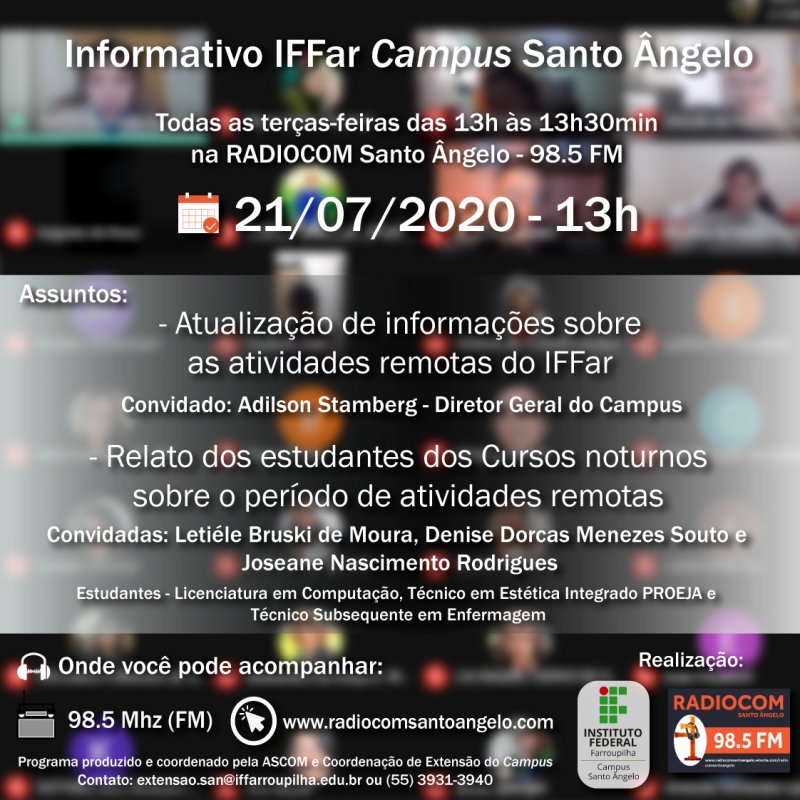 ? Assuntos: Atualização de informações sobre as atividades remotas do IFFar, com o Diretor Geral Adilson Stamberg; Relato dos estudantes dos Cursos noturnos sobre o período de atividades remotas, com a participação de Letiéle Bruski de Moura, Denise Dorcas Menezes Souto e Joseane Nascimento Rodrigues - Estudantes de Licenciatura em Computação, Técnico em Estética Integrado PROEJA e Técnico Subsequente em Enfermagem.