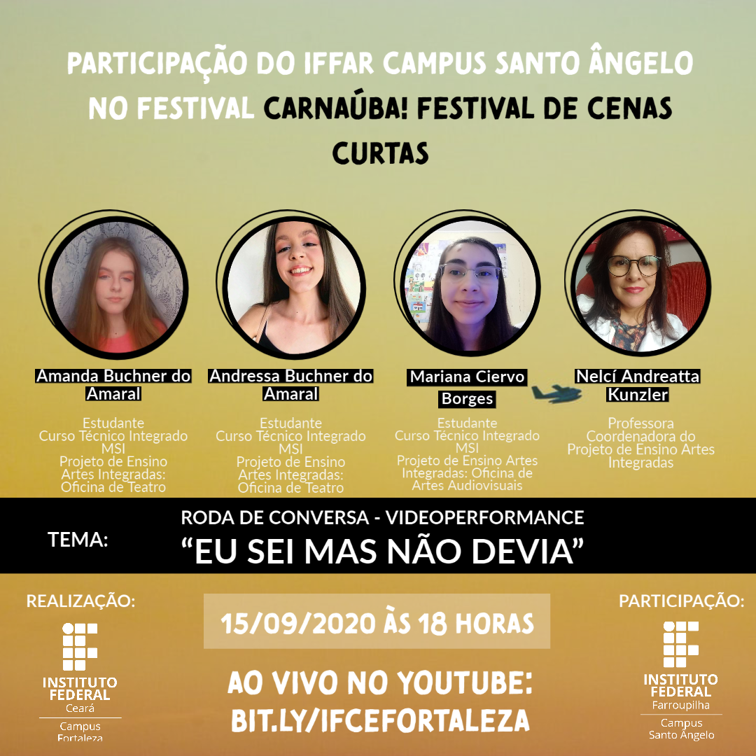 A videoperformance: “EU SEI, MAS NÂO DEVIA”, foi selecionada para ser exibida no Festival CARNAÚBA! Festival de Cenas Curta, do Instituto Federal de Educação, Ciência e Tecnologia do Ceará, campus Fortaleza, através de inscrição e seleção em edital aberto para este fim. A transmissão da videoperformance será nesta quarta-feira, dia 16/09/2020, às 18 horas, através do Canal do YouTube do IFCE Fortaleza e, após a transmissão, os estudantes e a coordenadora da criação participam ao vivo de uma roda de conversa com a curadoria e mediação de Edneia Quinto (Tutti), do Ceará.