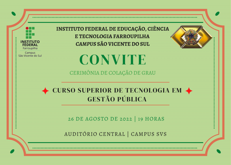 A Direção Geral do Campus, juntamente com a Coordenação do Curso e Formandos 2022 do Curso Superior de Tecnologia em Gestão Pública, convida para a Cerimônia de Colação de Grau que acontecerá na sexta-feira, dia 26 de agosto, às 19 horas, no Auditório Central do Campus.