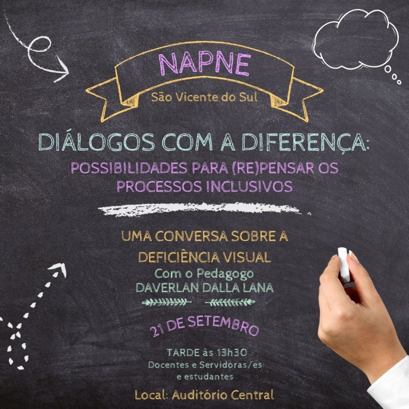 O NAPNE (Núcleo de Apoio a Pessoas com Necessidades Especiais) convida você para 1ª Edição do "Diálogos com a diferença: possibilidades para repensar os processos inclusivos" que terá como temática "Uma conversa sobre a Deficiência Visual".