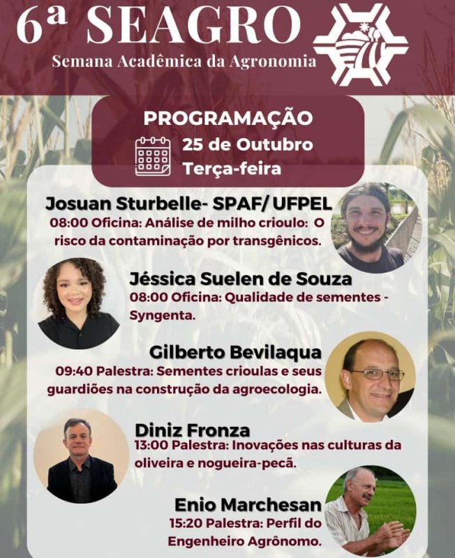 De 24 a 27 de outubro, acontece, no Instituto Federal Farroupilha - Campus São Vicente do Sul, a 6ª edição da Semana Acadêmica do Curso de Agronomia (SEAGRO). A programação envolve palestras, oficinas e minicursos sobre assuntos diversos e tem como tema “Semeando Ideias, cultivando saberes e colhendo sucesso”. Confira abaixo: