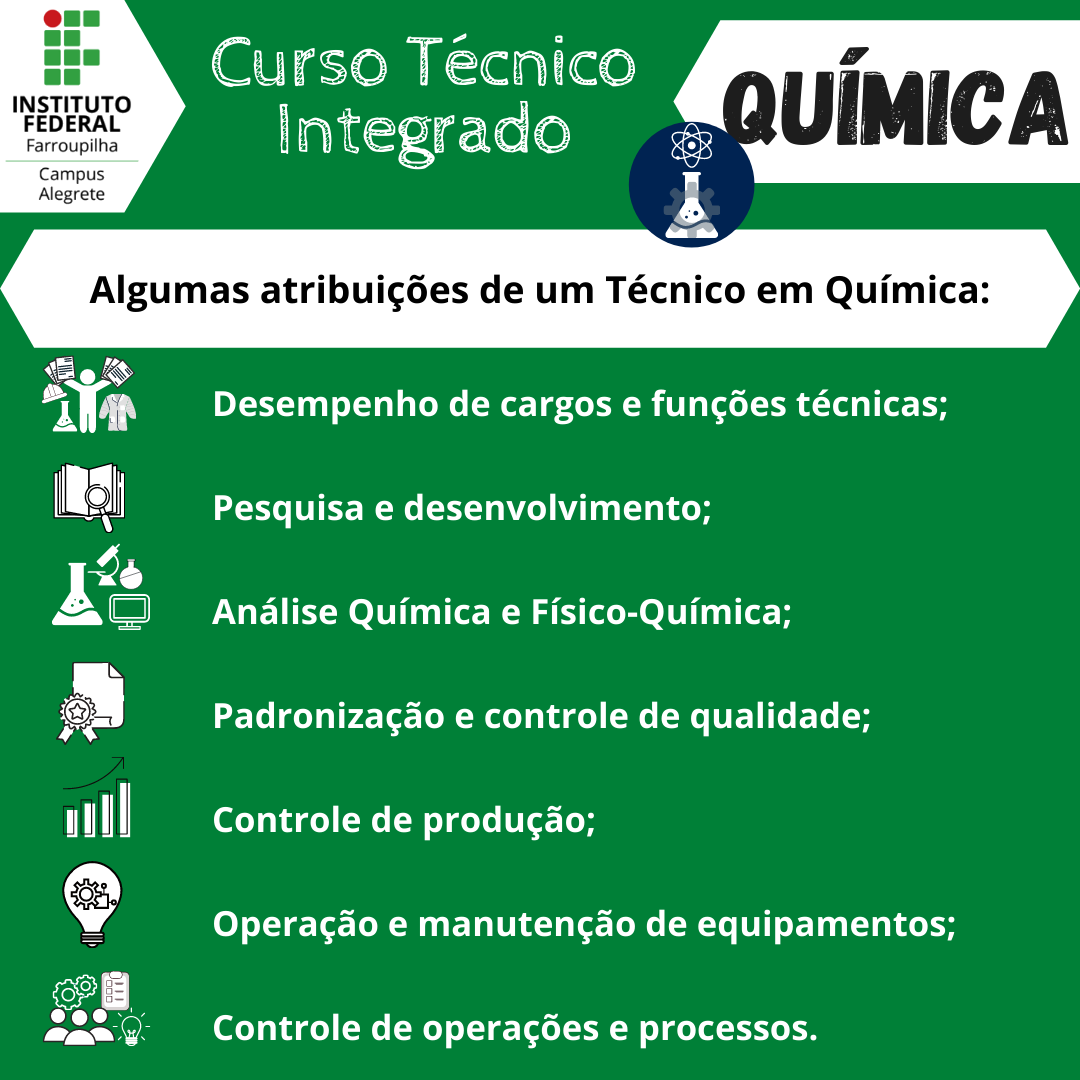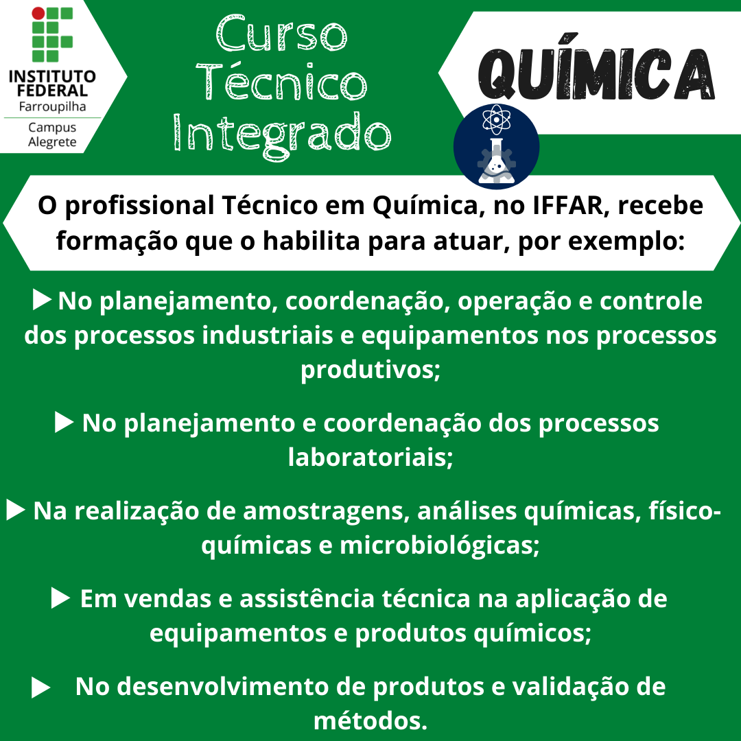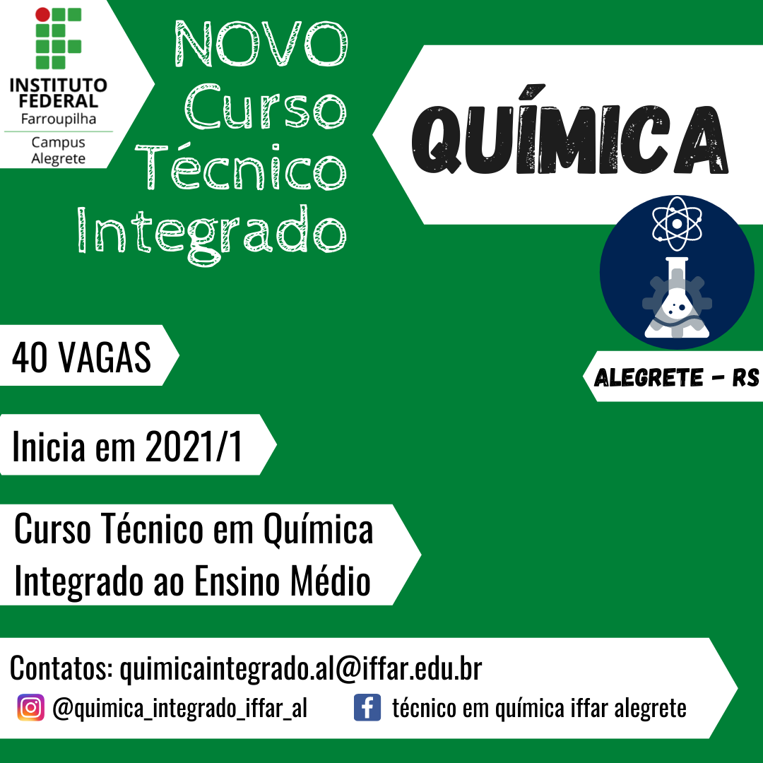 O Campus Alegrete do Instituto Federal Farroupilha está ampliando as possibilidades para os alunos interessados em realizar cursos Técnicos Integrados ao Ensino Médio. A partir do primeiro semestre de 2021, o Campus passará a ofertar o Curso Técnico em Química Integrado ao Ensino Médio.