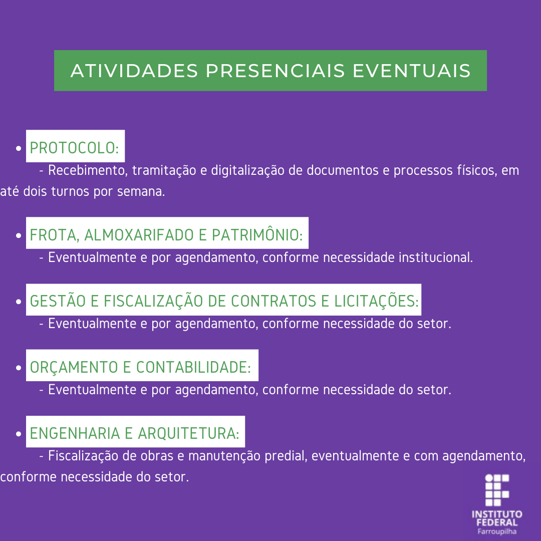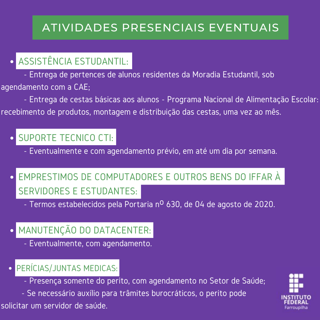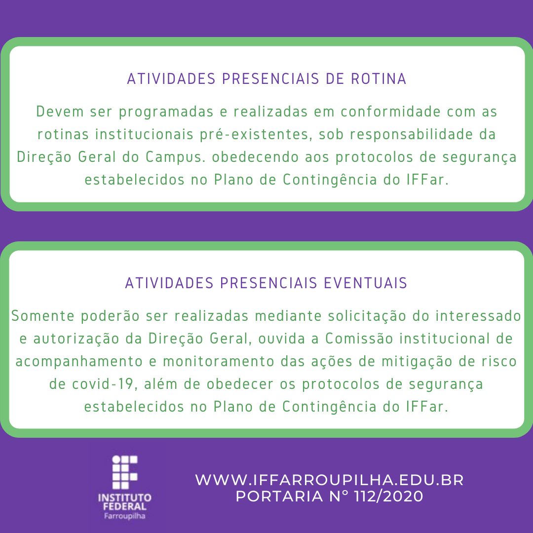 Todo acesso presencial às instalações do IFFar deverá ser registrado, por escrito, indicando o nome da pessoa, data do acesso e horário de entrada e saída. É vedado aos servidores pertencentes aos grupos de risco e àqueles que coabitam com grupos de risco a realização de atividades presenciais.
