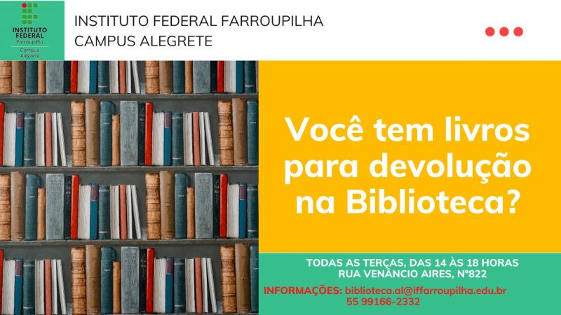 As devoluções estão sendo recebidas normalmente e novos empréstimos são feitos somente para alunos que estão elaborando Trabalho de Conclusão de Curso (TCC) ou Relatório de Estágio, assim como aos servidores do IFFar. Os livros a serem devolvidos não serão recebidos de outra forma. Casos e situações específicas (como envio de livros por correspondência) deverão ser tratadas diretamente pelo e-mail ou telefone disponível abaixo.