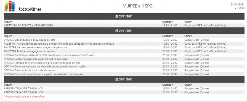 O evento acontece nos dias 03,04 e 05 de novembro. No primeiro dia acontece a abertura do evento. As palestras e as oficinas estão programadas para o segundo dia de evento. Já no último dia, acontecerão as apresentações dos trabalhos inscritos.
