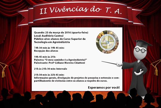 No último dia 23 de março reuniram-se, no Auditório Central, os alunos e os professores do Curso Superior de Tecnologia em Agroindústria (TA) para a realização do II Vivências do TA. O encontro, que reúne os alunos do curso de todas as turmas em andamento, tem por objetivo estimular e orientar os ingressantes através da partilha de vivências realizada pelos alunos “veteranos” e também faz parte das ações do Programa de Permanência e Êxito, realizado pela Instituição. A coordenadora do Curso, prof. Josiane Pasini iniciou o encontro mostrando o vídeo Institucional e, em seguida, enfatizou a importância da troca de experiências entre os alunos e de momentos de confraternização e aprendizado. A abertura musical ficou por conta da prof. Yasmim Leães e, em seguida, o Coordenador de Assistência Estudantil (CAE) Anderson Fetter, na ocasião representando a Direção Geral, deu as boas-vindas aos alunos e explanou as diversas ações da CAE.