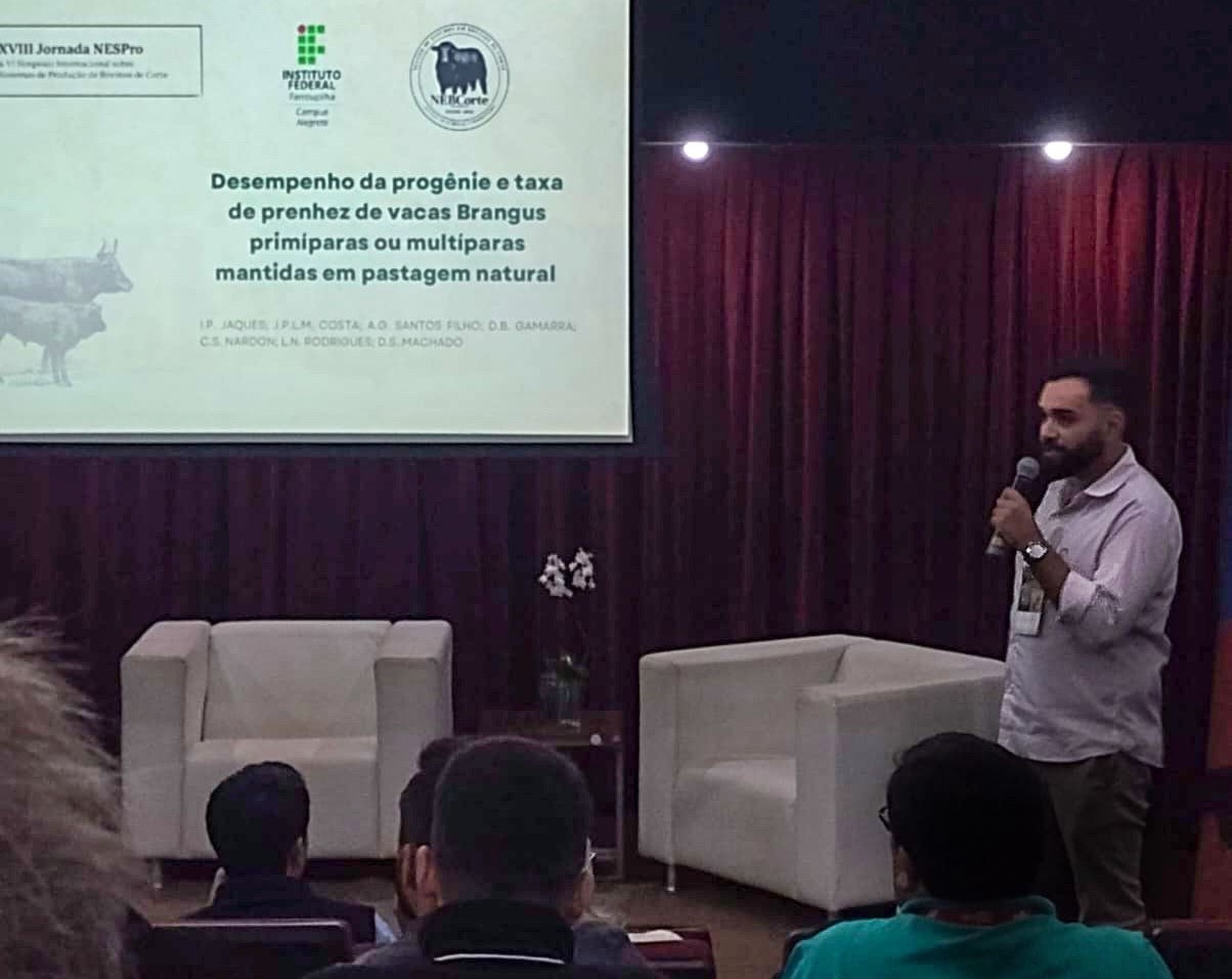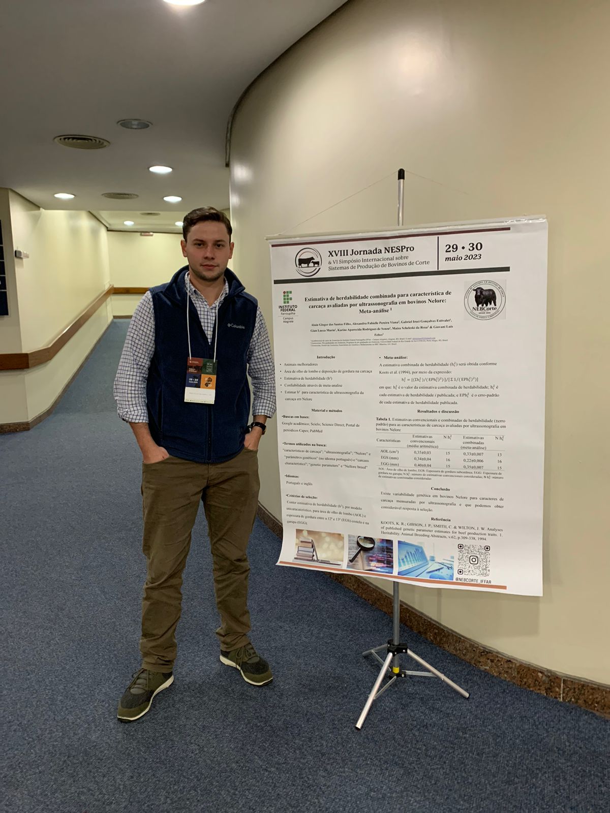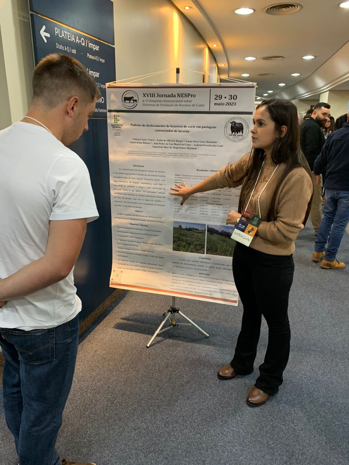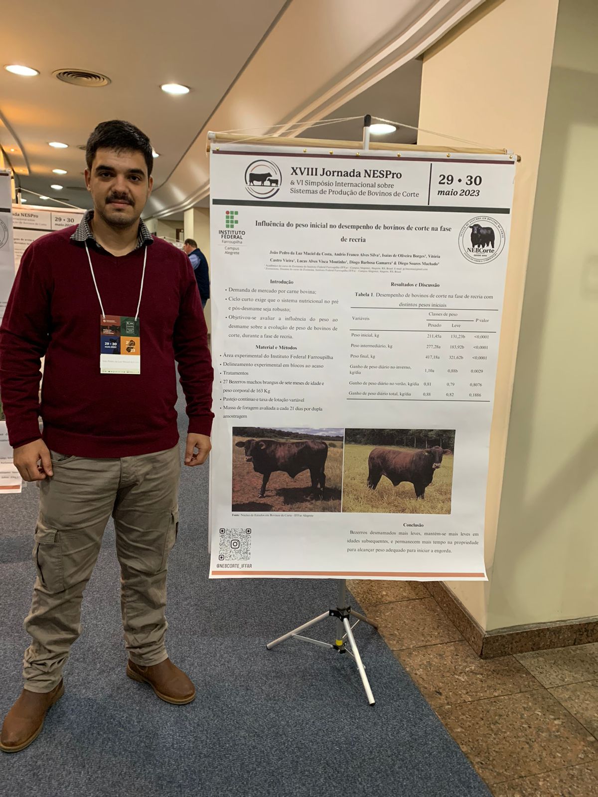 Os trabalhos "Desempenho da progênie e taxa de prenhez de vacas Brangus primíparas ou multíparas mantidas em pastagem natural" e "Correlações genéticas e fenotípicas para característica de ultrassonografia de carcaça em bovinos Nelore: Meta-análise", dos alunos Igor e Alain são trabalhos oriundos de pesquisas realizadas pela equipe do Núcleo de Estudos em Bovinos de Corte do IFFar - Alegrete, coordenado pelo Prof. Dr. Diego Soares Machado, o qual também é orientador de todos os trabalhos apresentados. Este grupo é parte integrante do GPER (Grupo de Pesquisa e Extensão em Ruminantes).Os demais integrantes do grupo apresentaram seus trabalhos no formato de pôsteres.