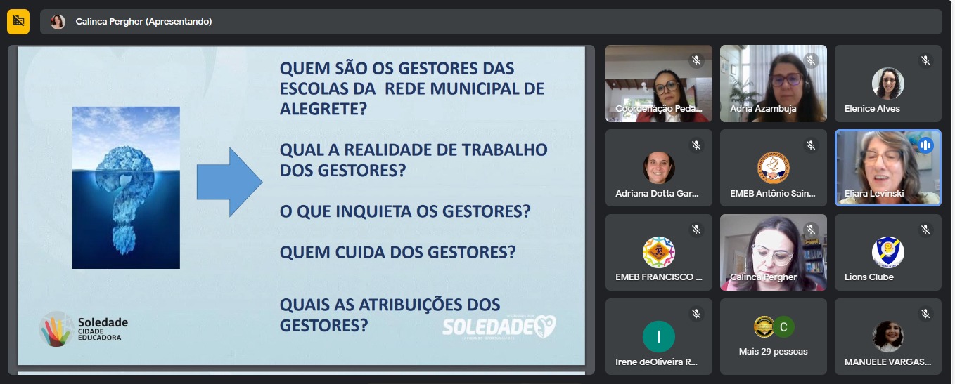 Nesse encontro virtual de grande importância, as palestrantes, Prof. Adria Azambuja e Eliara Zavieruka Levinski, compartilharam valiosos insights sobre a gestão democrática nas escolas municipais, proporcionando aos gestores de Alegrete uma oportunidade única de aprimorar seus conhecimentos e práticas. Durante a palestra, os gestores tiveram a oportunidade de explorar diversos tópicos essenciais para a gestão educacional, como o papel dos gestores nas escolas, a diferença entre chefes e líderes na gestão escolar e os fundamentos da gestão democrática. Além disso, foram discutidos obstáculos e desafios comuns enfrentados pelos gestores no contexto educacional.