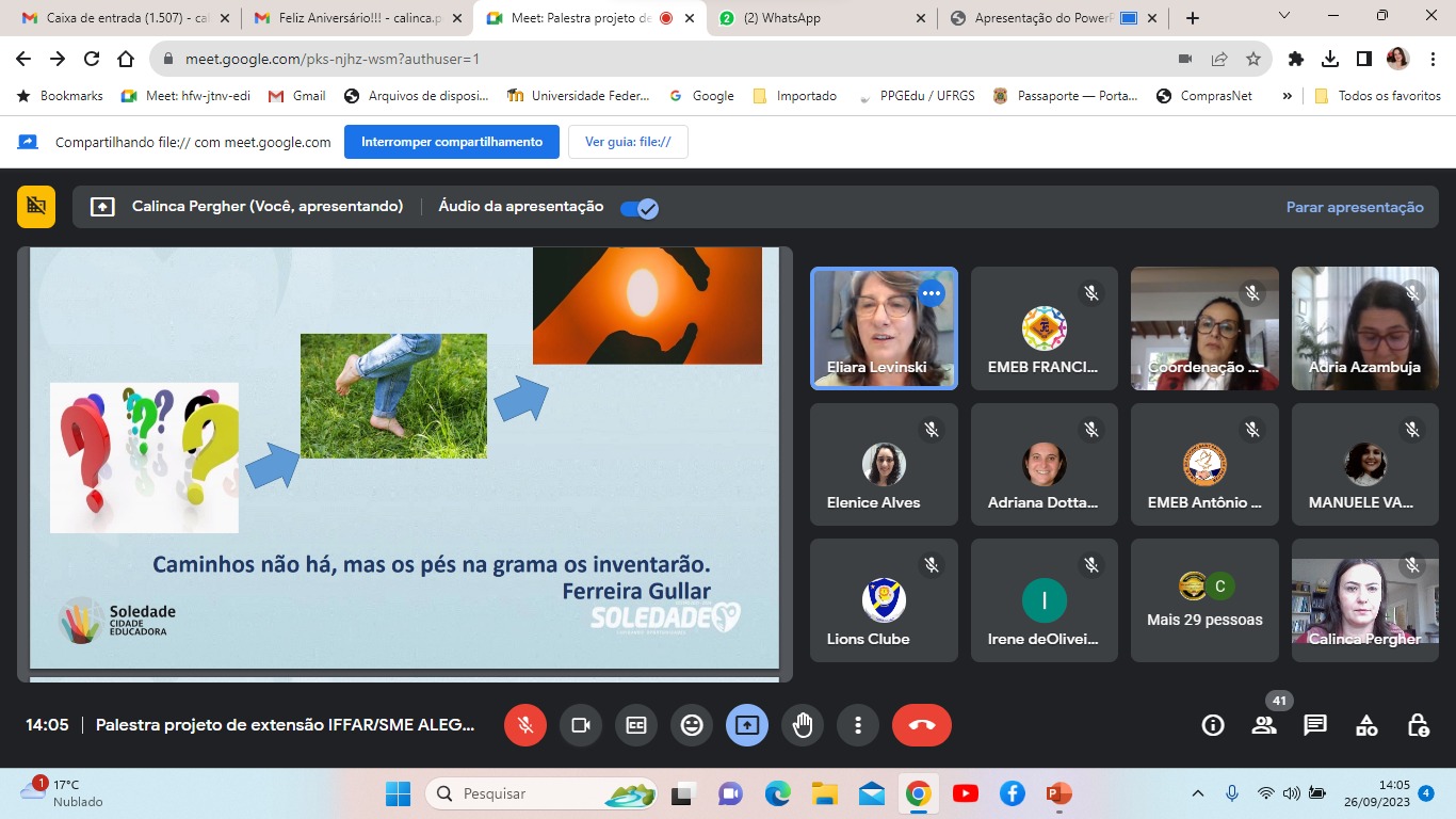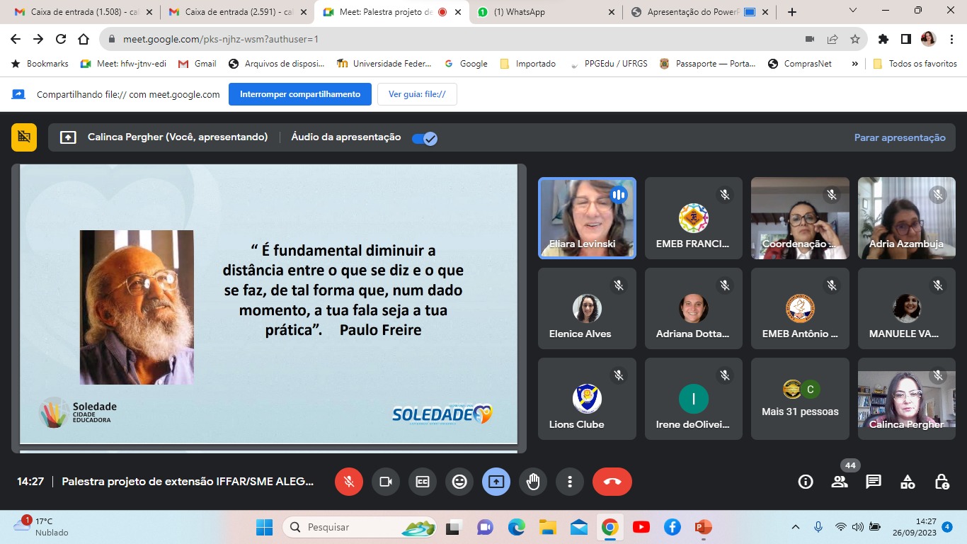 No dia 26 de setembro, às 13h30, ocorreu com sucesso a palestra virtual "Constituição de Espaços e Práticas de Gestão Democrática", realizada via Google Meet. O evento foi organizado especialmente para a formação continuada dos gestores educacionais de Alegrete. A iniciativa foi coordenada pela Professora Calinca Pergher e contou com o auxílio das bolsistas Manuela Vargas e Beatriz Corrêa, do Instituto Federal Farroupilha - Campus Alegrete.